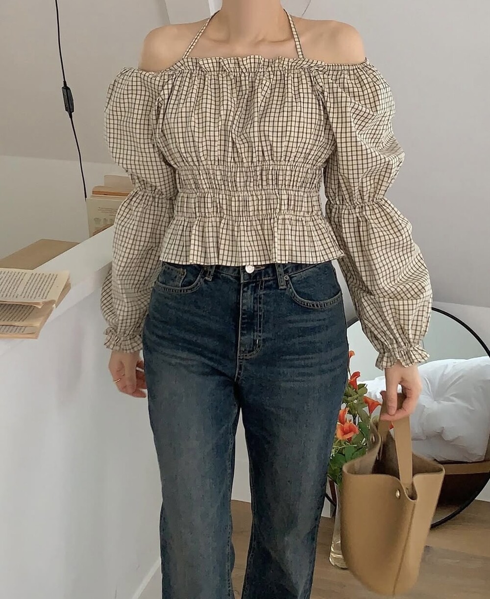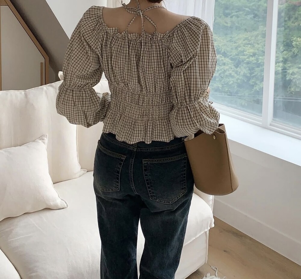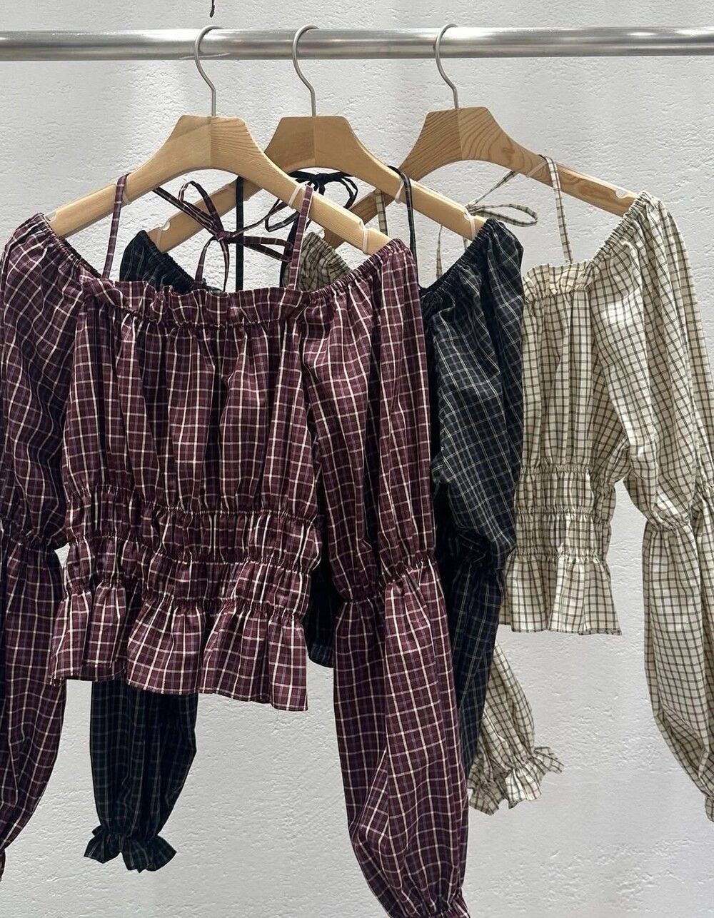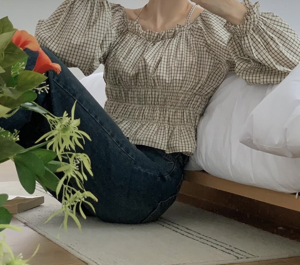 체크 스모크 밴딩 퍼프 소매 끈 오프숄더 블라우스 (데이트룩 여행룩 페미닌룩)