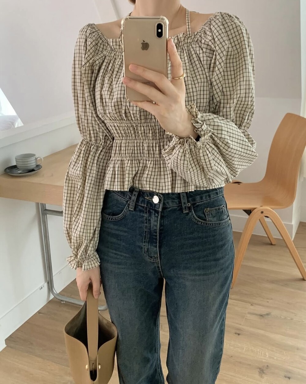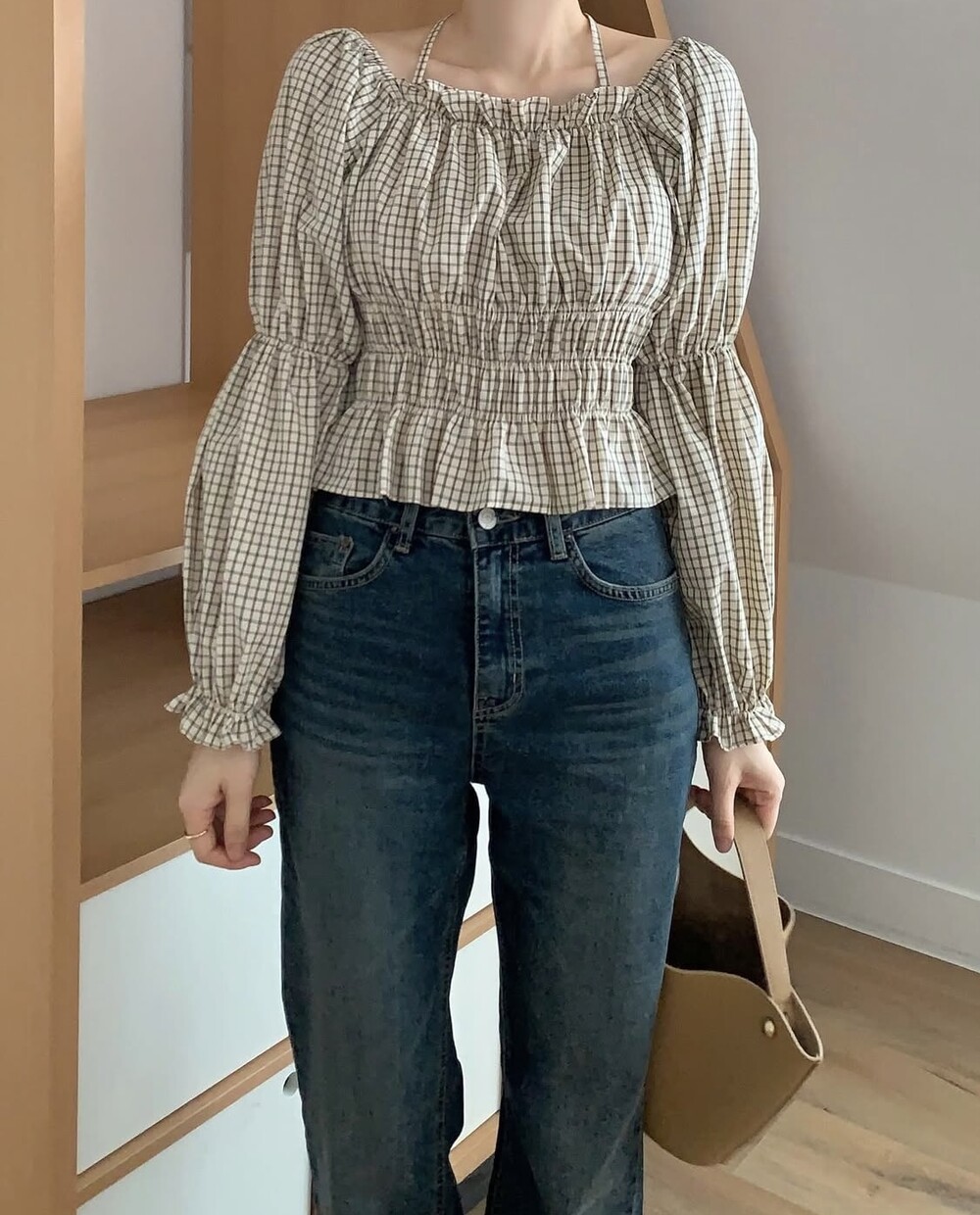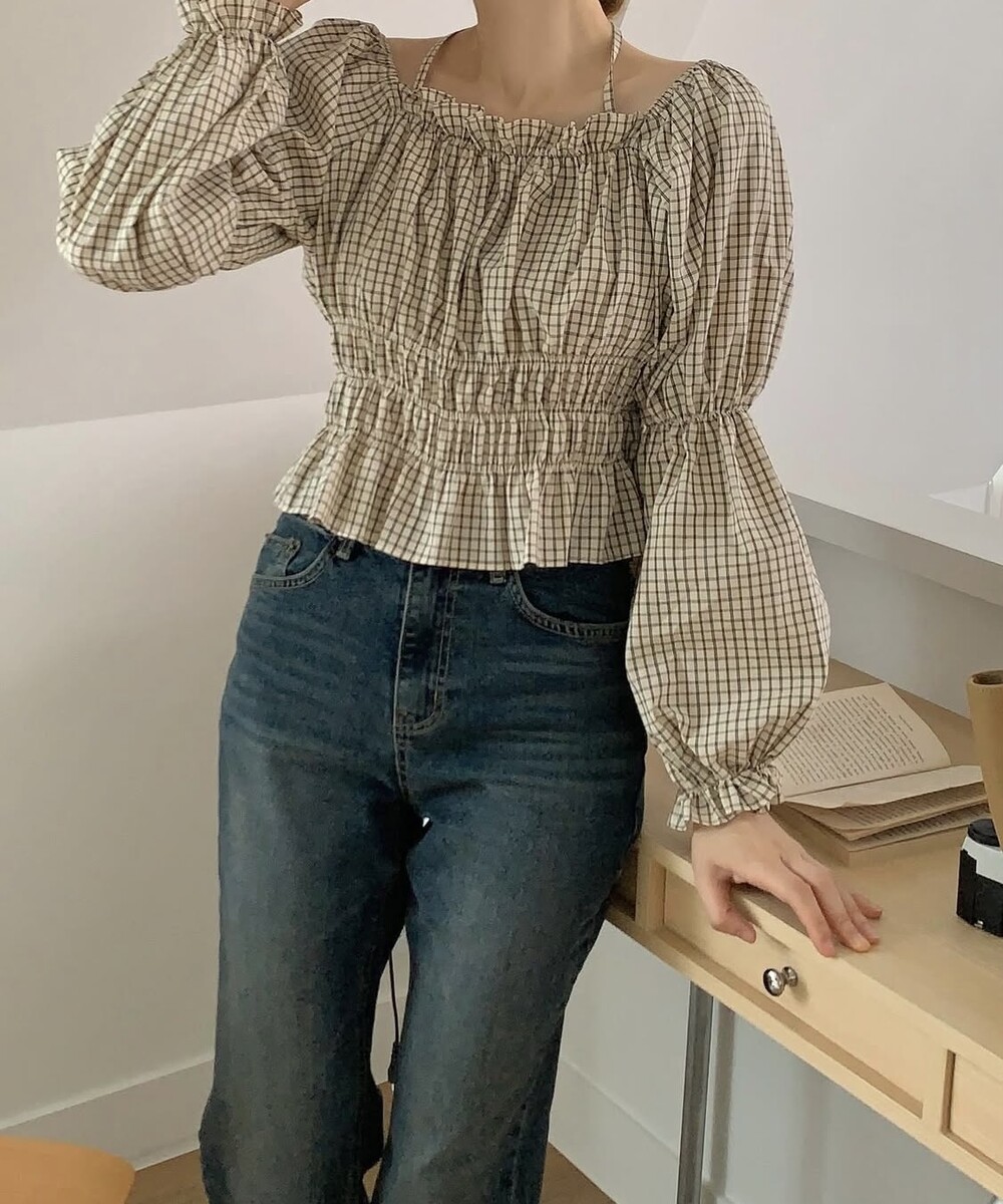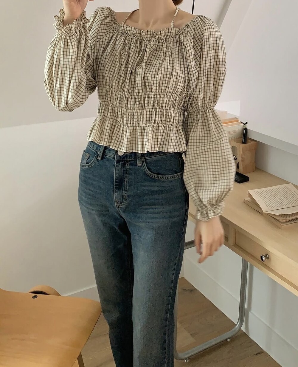 체크 스모크 밴딩 퍼프 소매 끈 오프숄더 블라우스 (데이트룩 여행룩 페미닌룩)