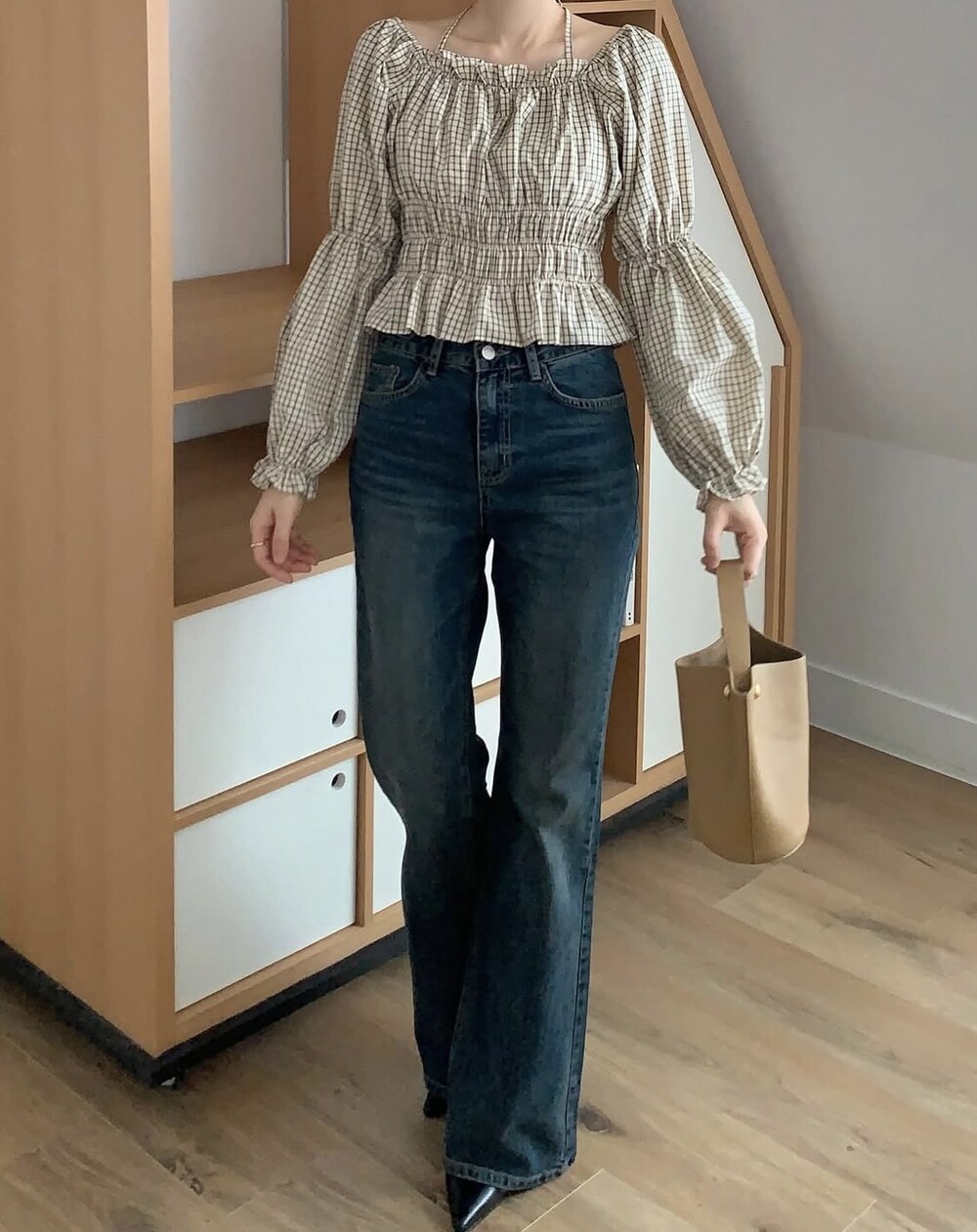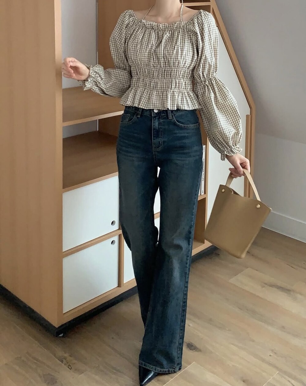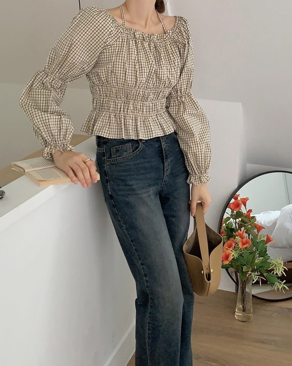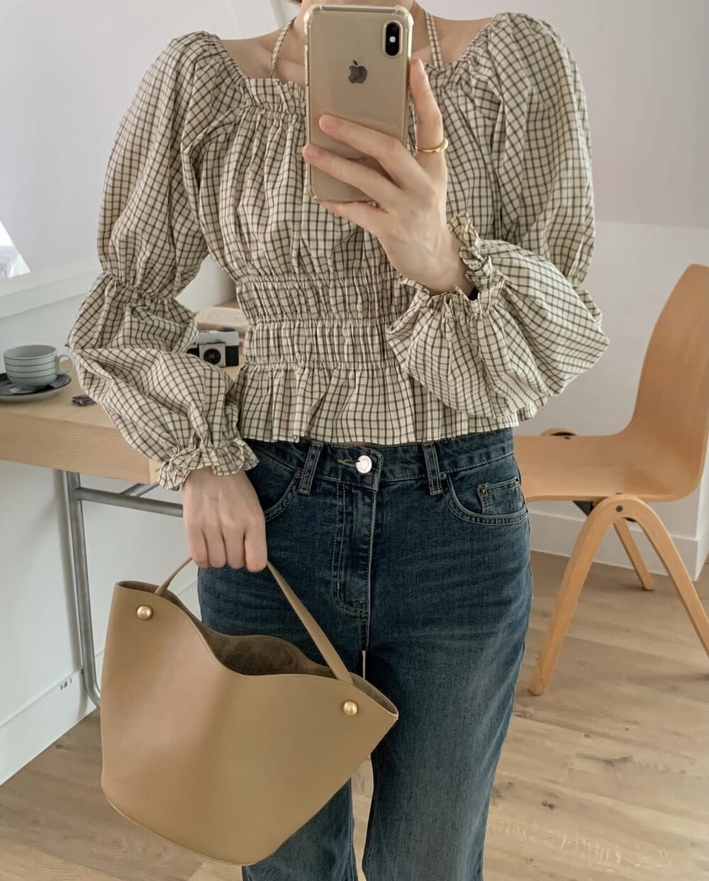 체크 스모크 밴딩 퍼프 소매 끈 오프숄더 블라우스 (데이트룩 여행룩 페미닌룩)