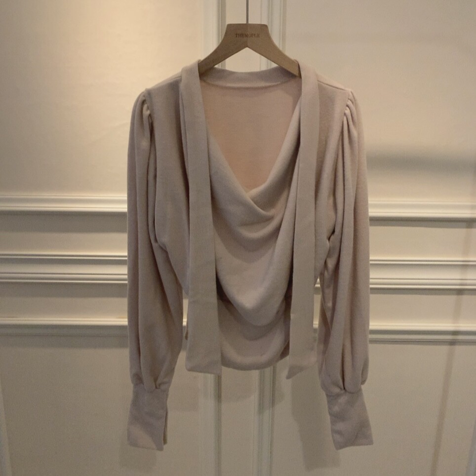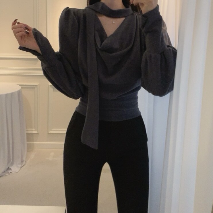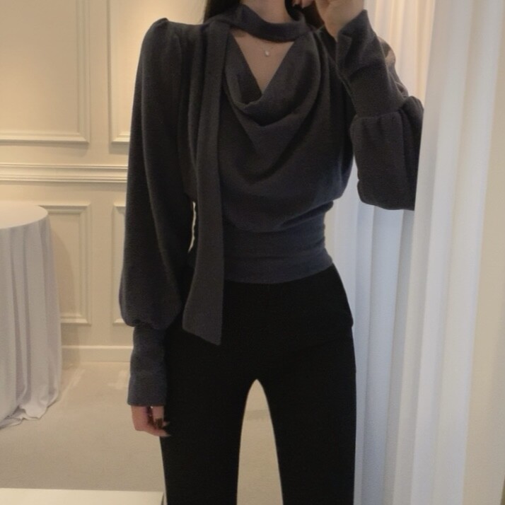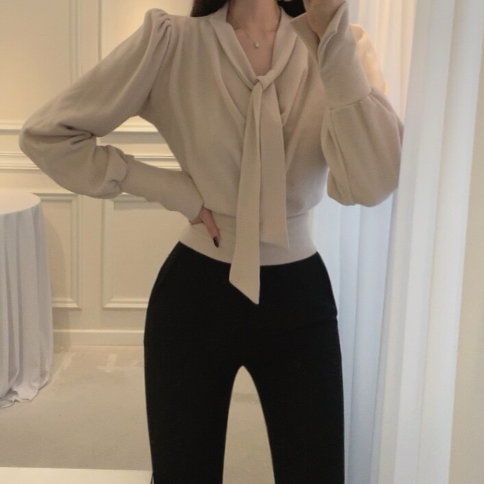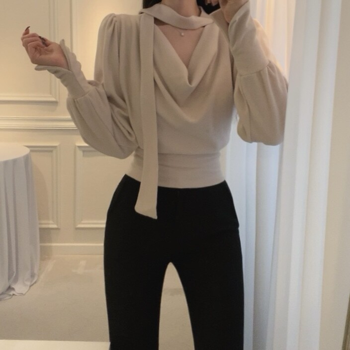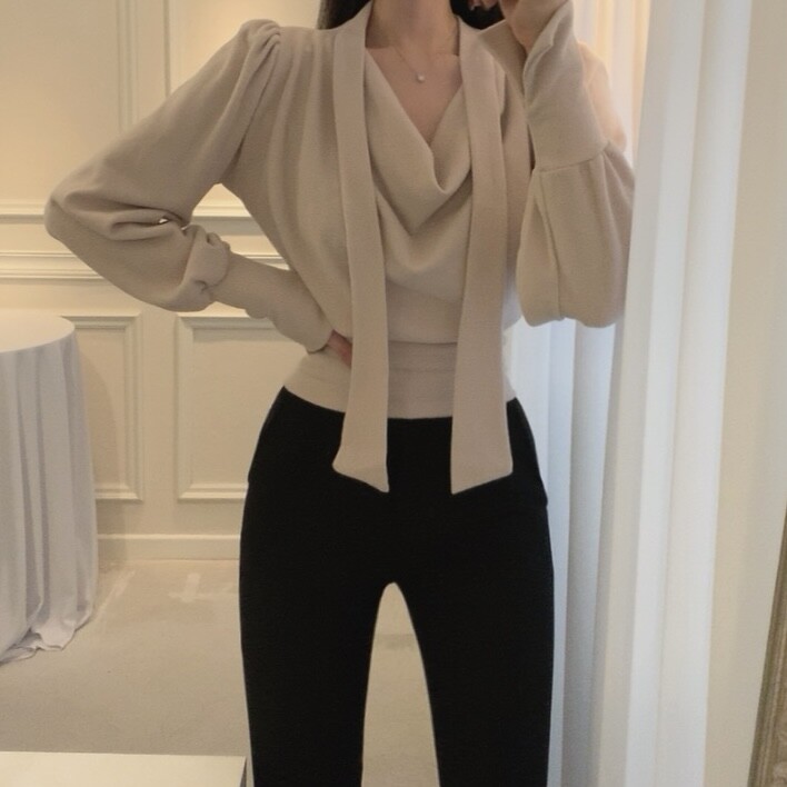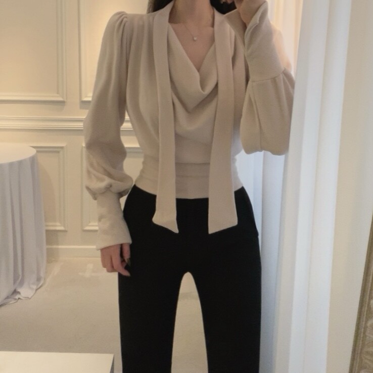 기모 스카프 타이 드레이프 셔링 주름 벌룬 소매 블라우스 (하객룩 결혼식 오피스룩)