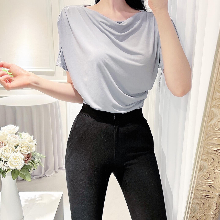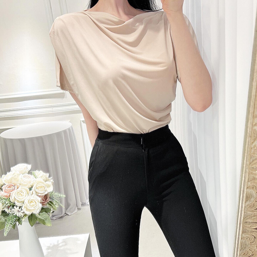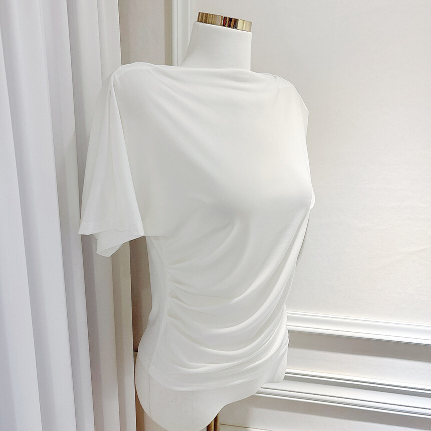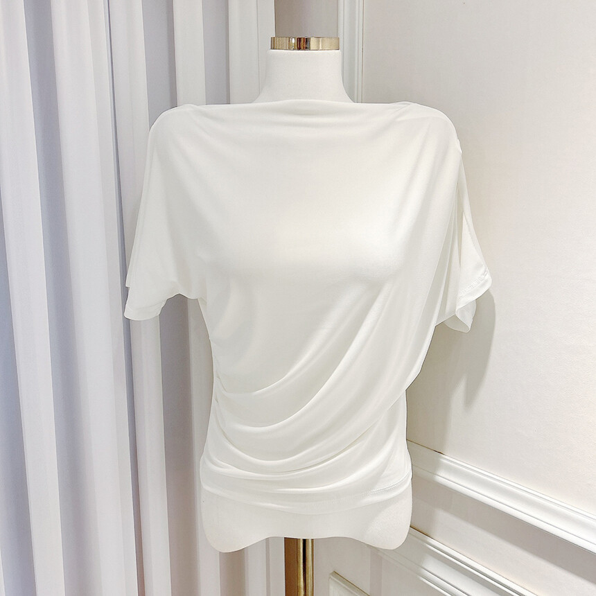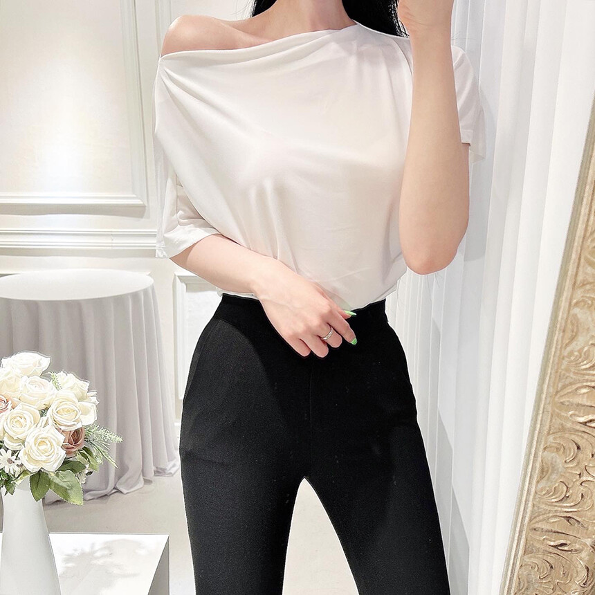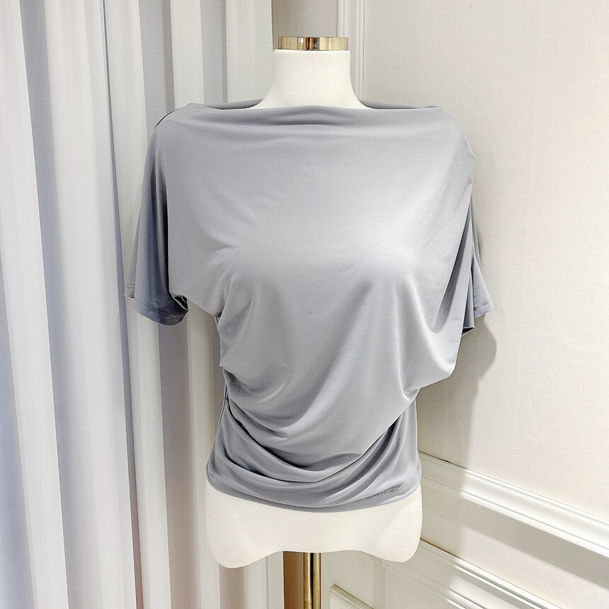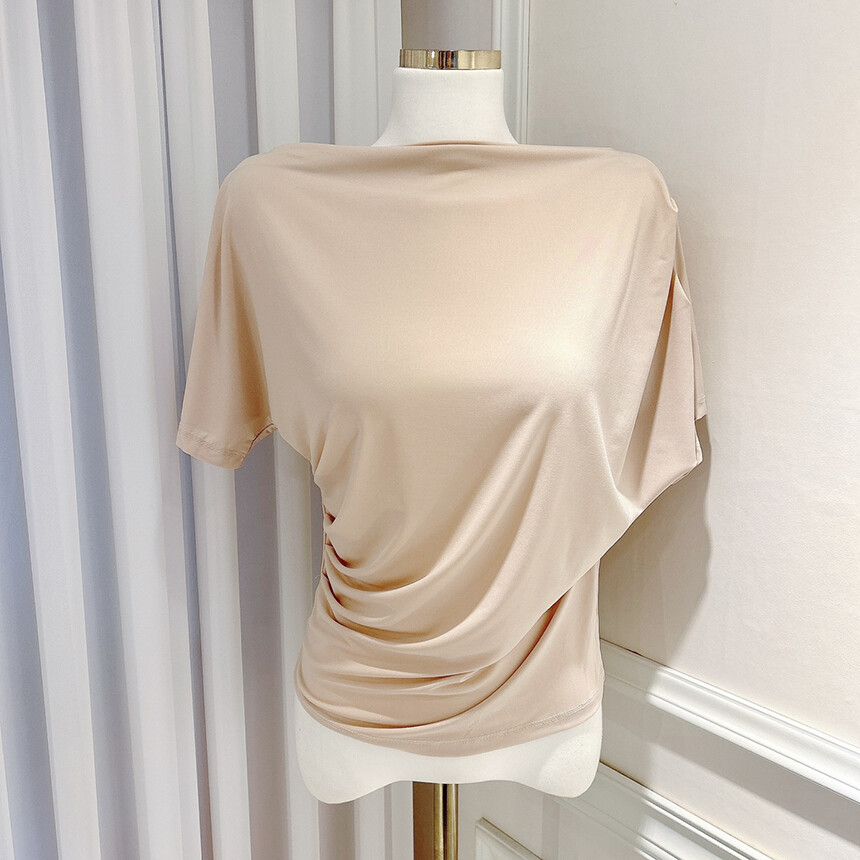 입술넥 오프숄더 셔링 주름 드레이프 반팔 여리여리 쿨링 블라우스 티셔츠