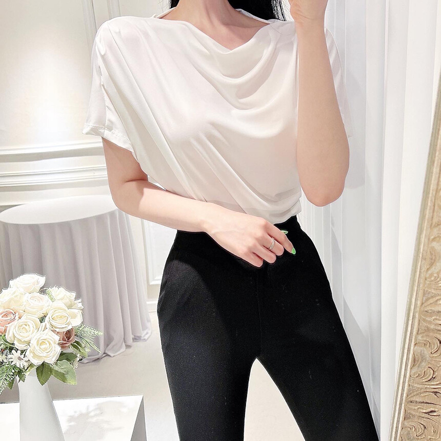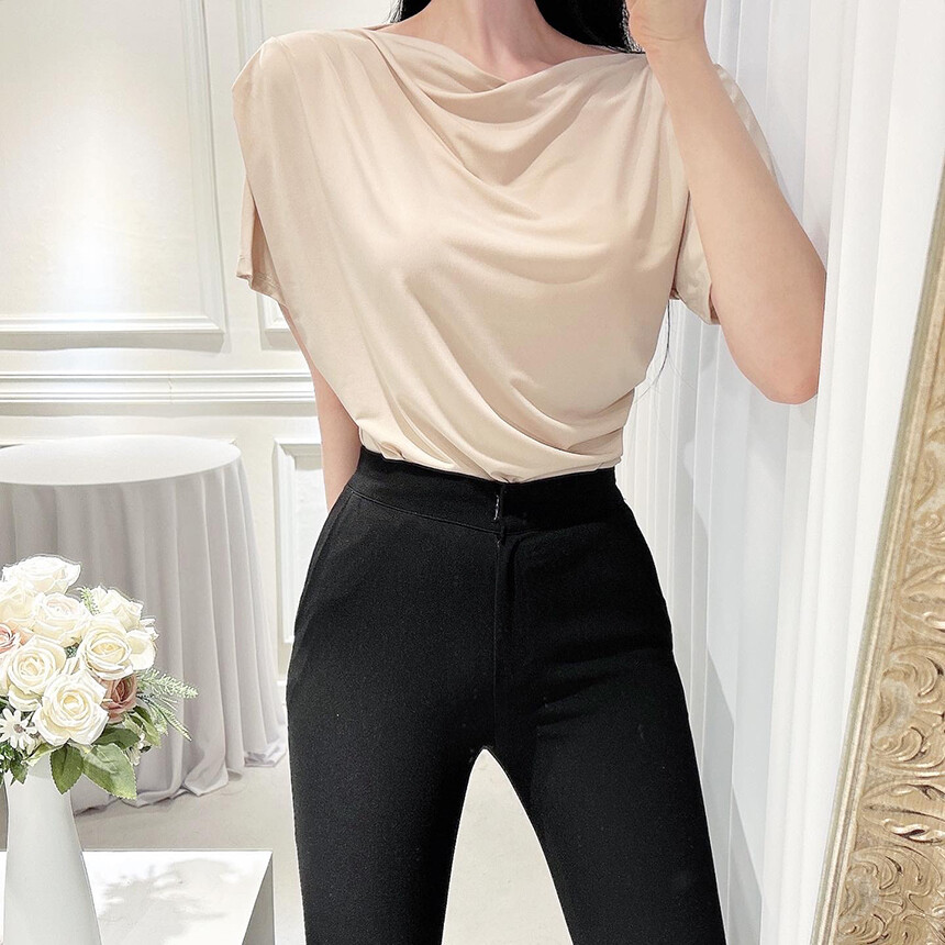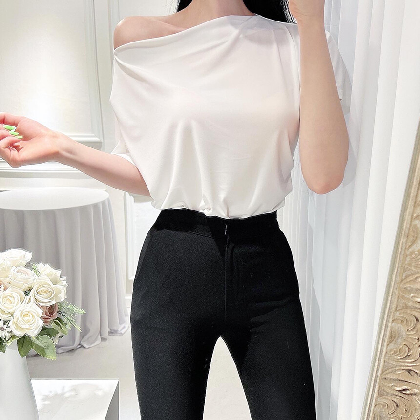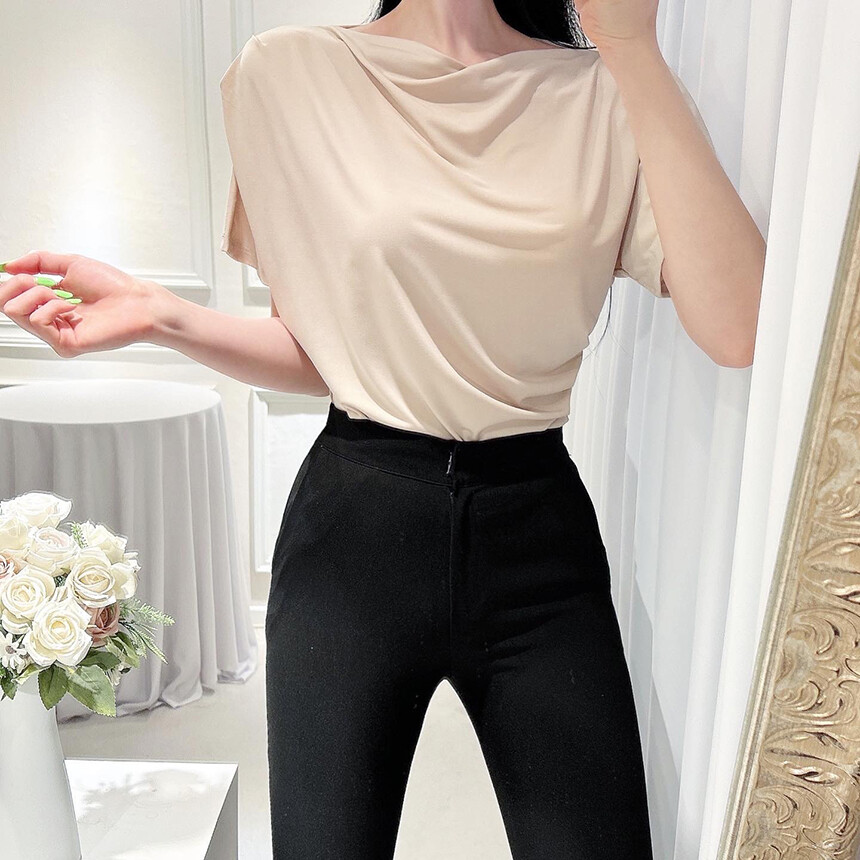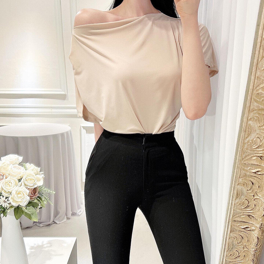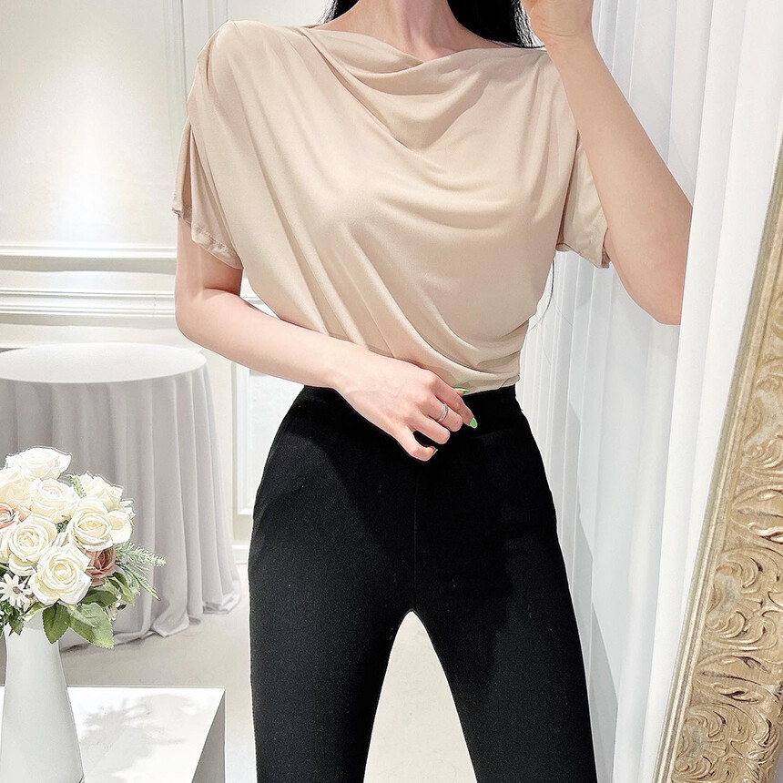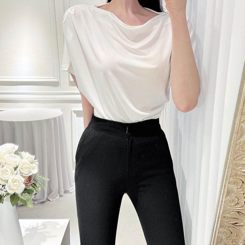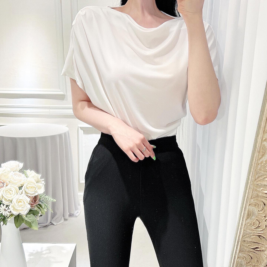 입술넥 오프숄더 셔링 주름 드레이프 반팔 여리여리 쿨링 블라우스 티셔츠