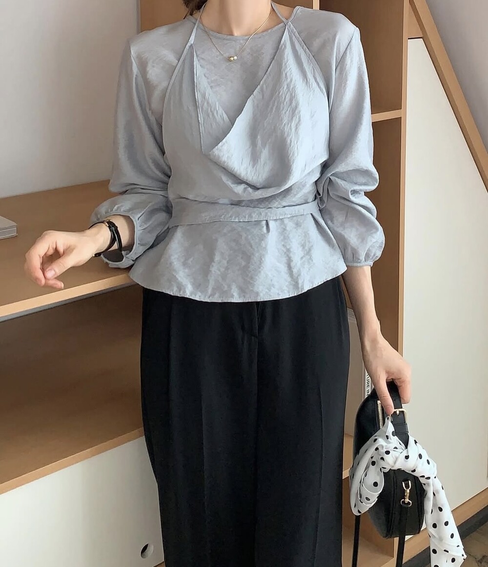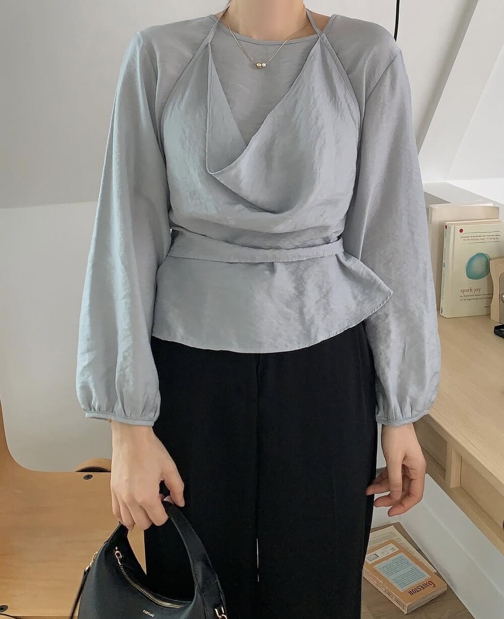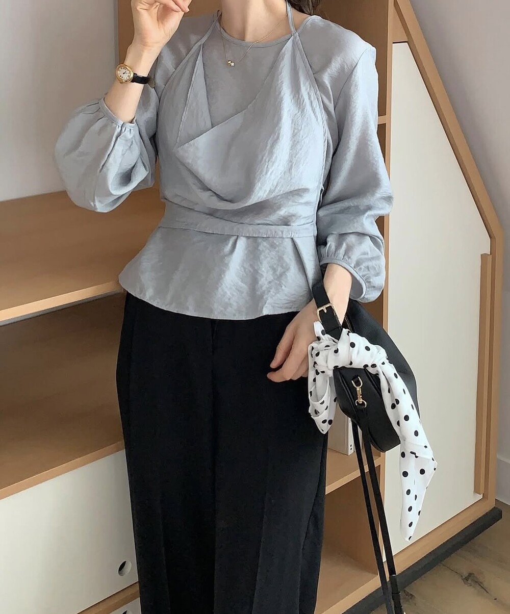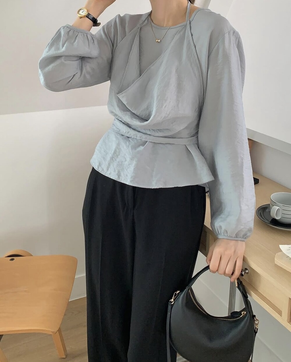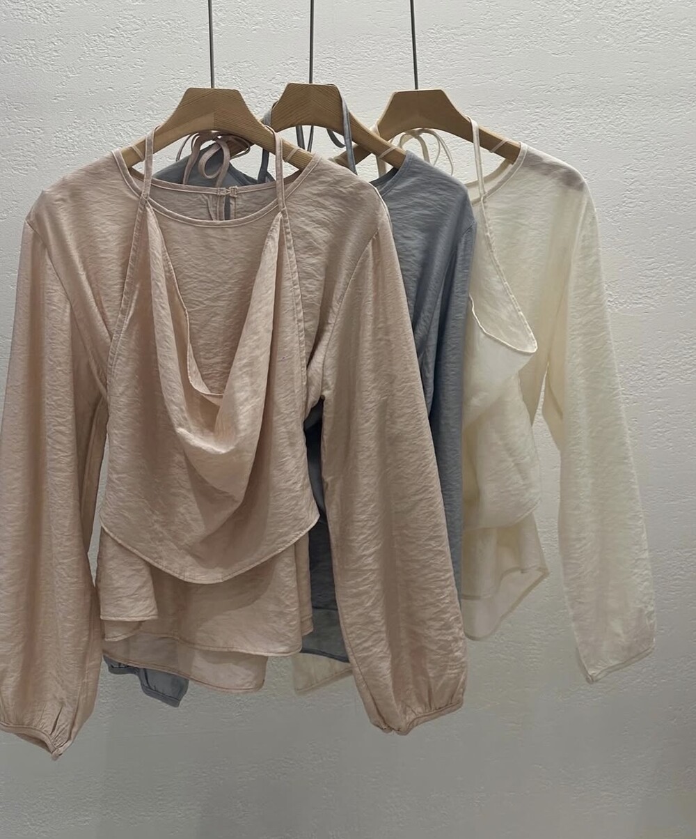 드레이프 뷔스티에 끈나시 라운드 긴팔 세트 여리핏 블라우스 (하객룩 결혼식 데이트룩)