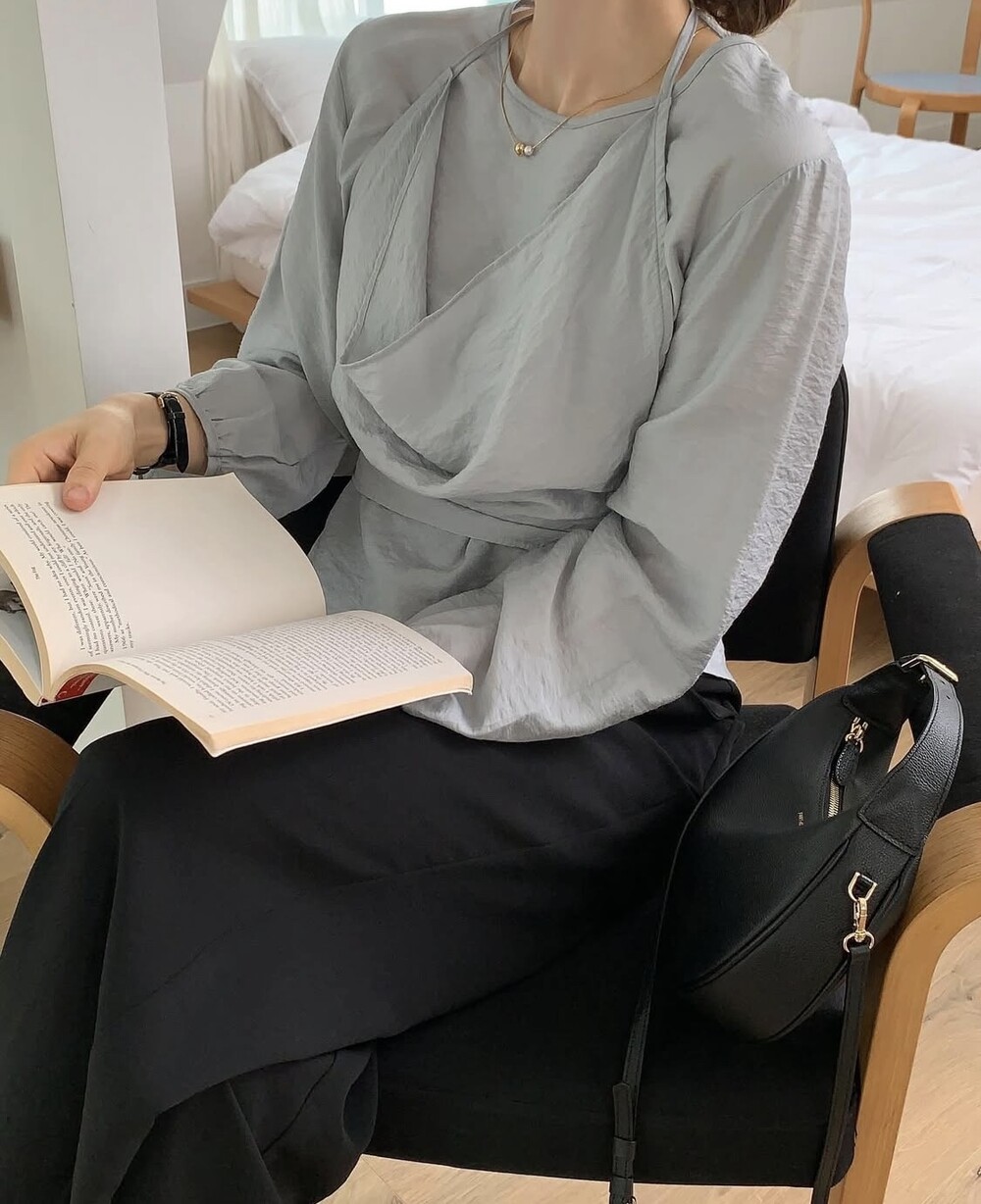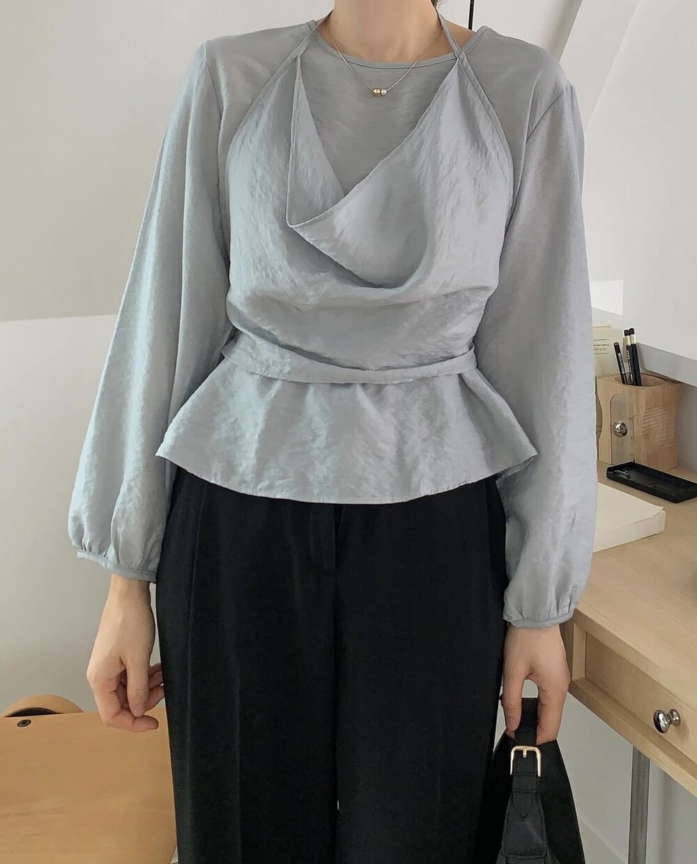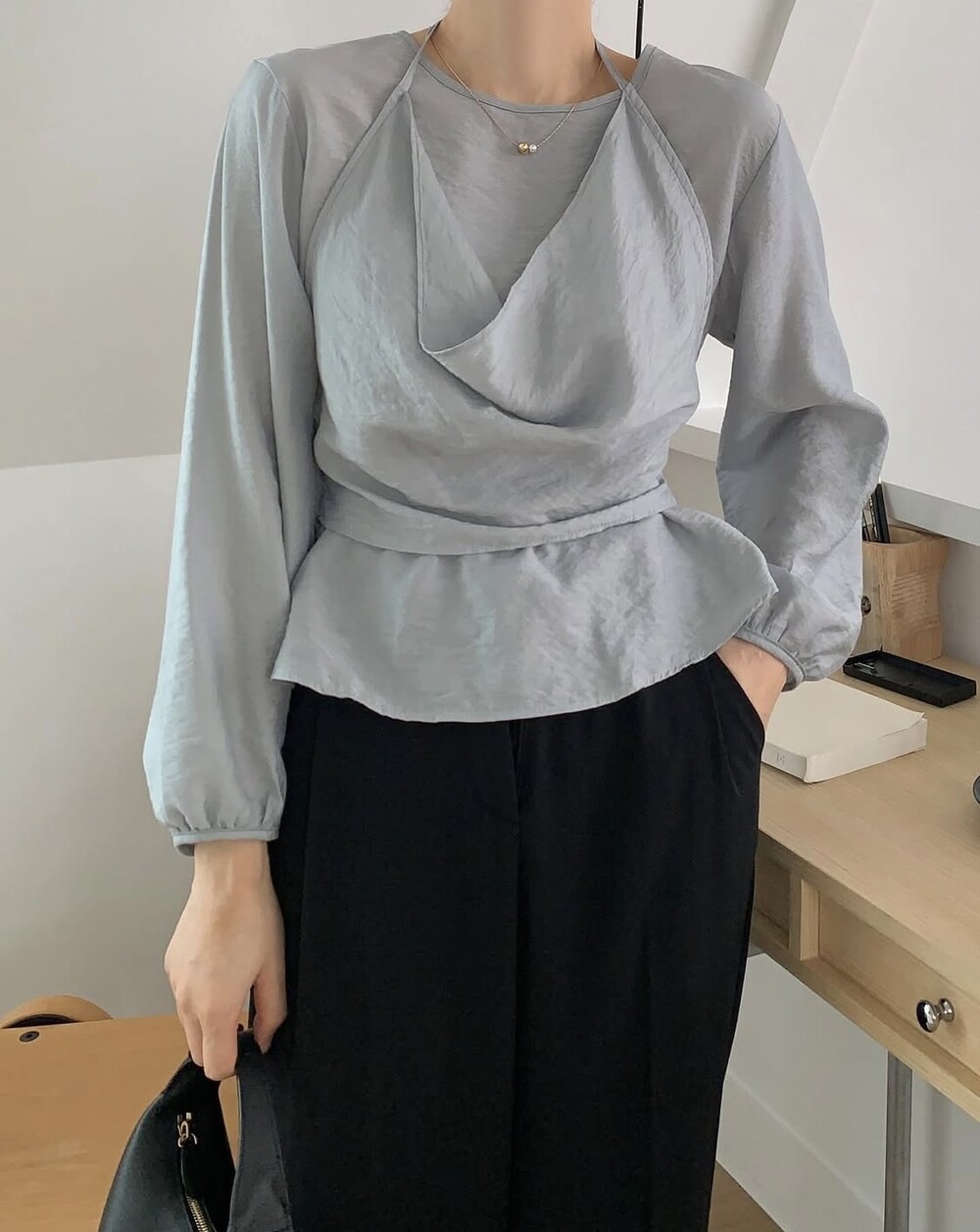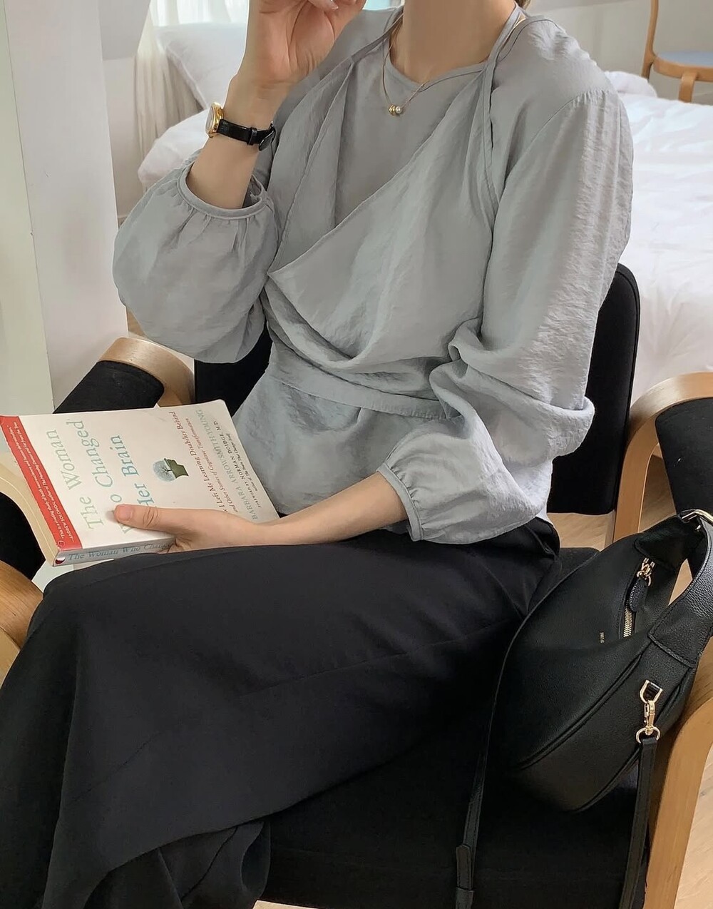 드레이프 뷔스티에 끈나시 라운드 긴팔 세트 여리핏 블라우스 (하객룩 결혼식 데이트룩)