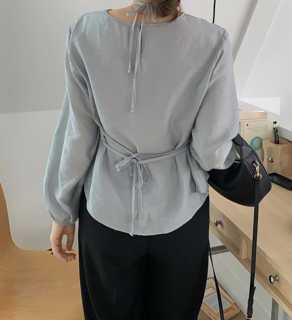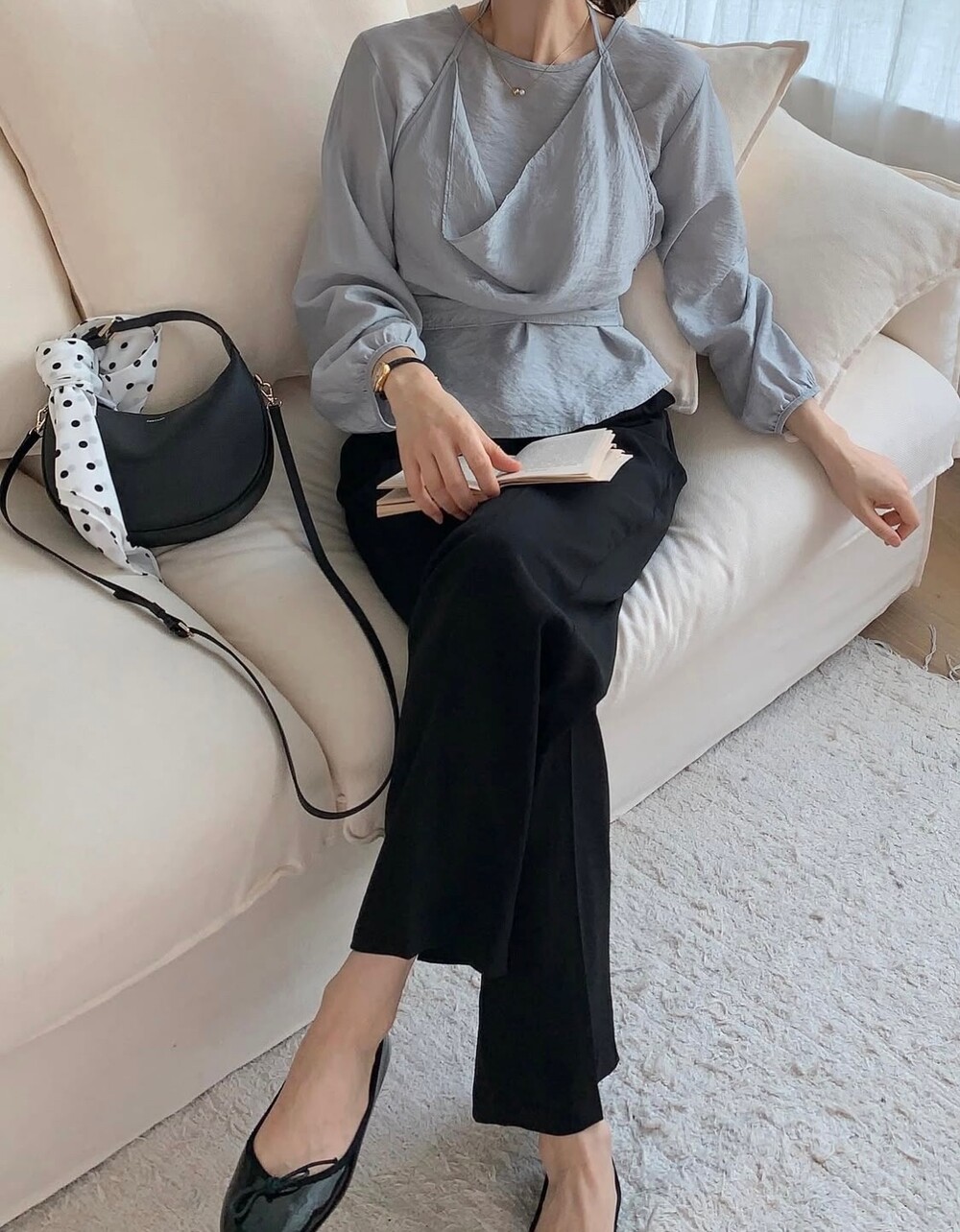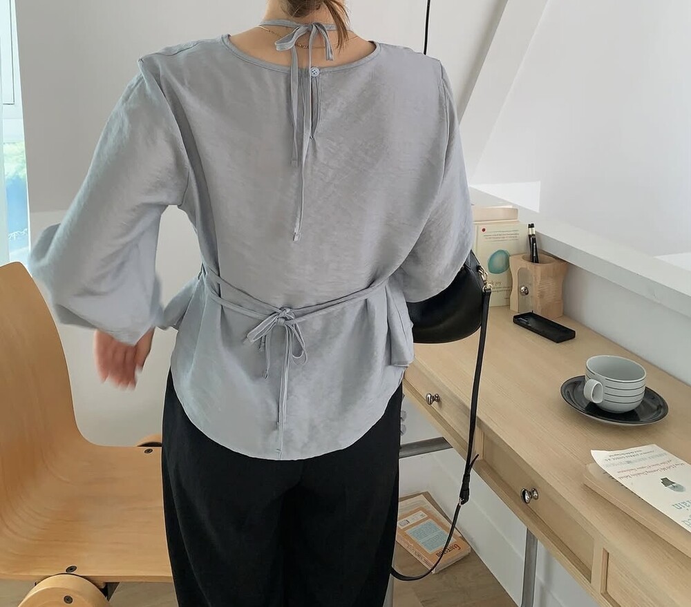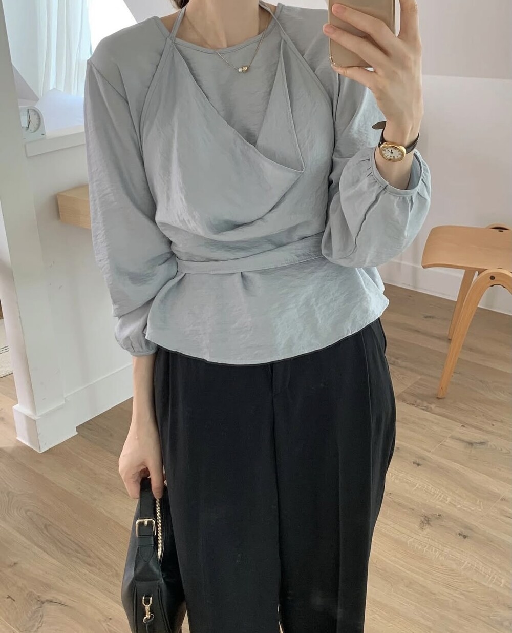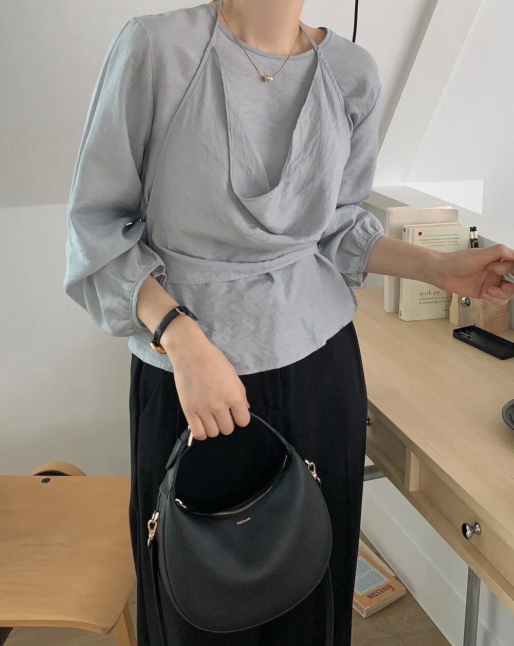 드레이프 뷔스티에 끈나시 라운드 긴팔 세트 여리핏 블라우스 (하객룩 결혼식 데이트룩)