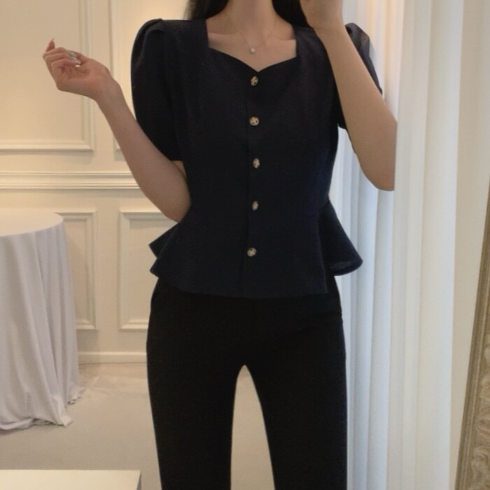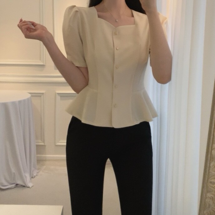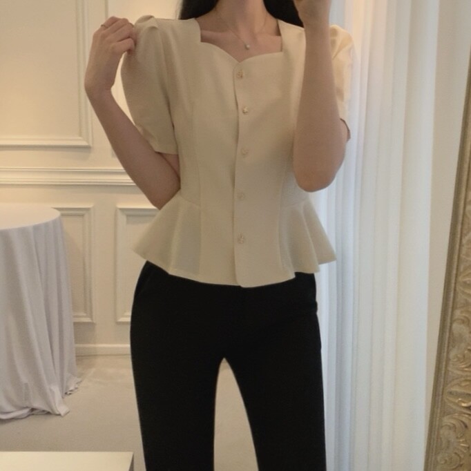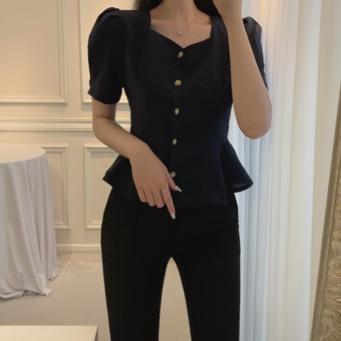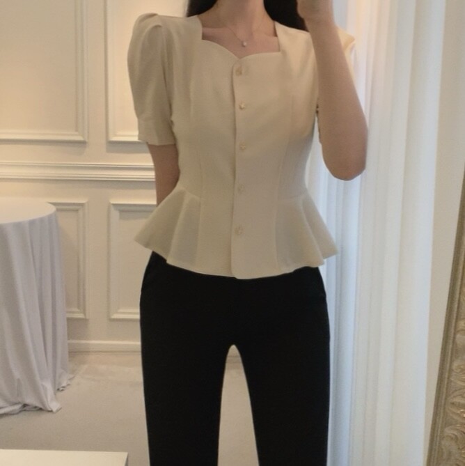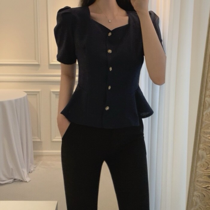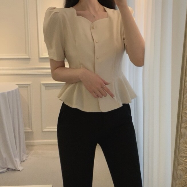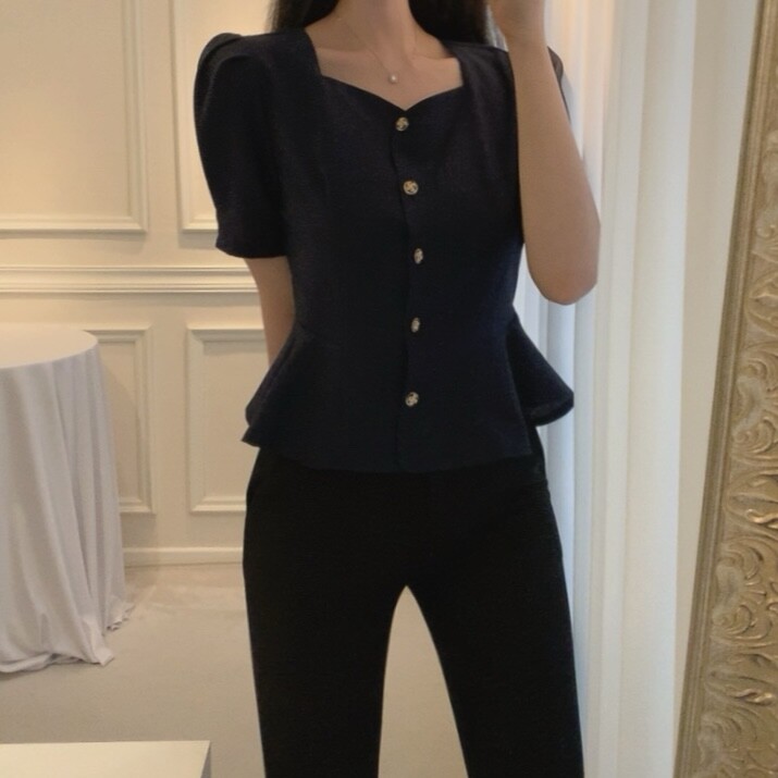하트넥 여름 반팔 트위드 금장 단추 페플럼 훌 블라우스 (하객룩 결혼식 오피스룩)