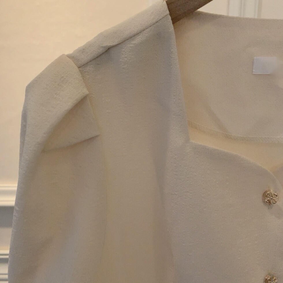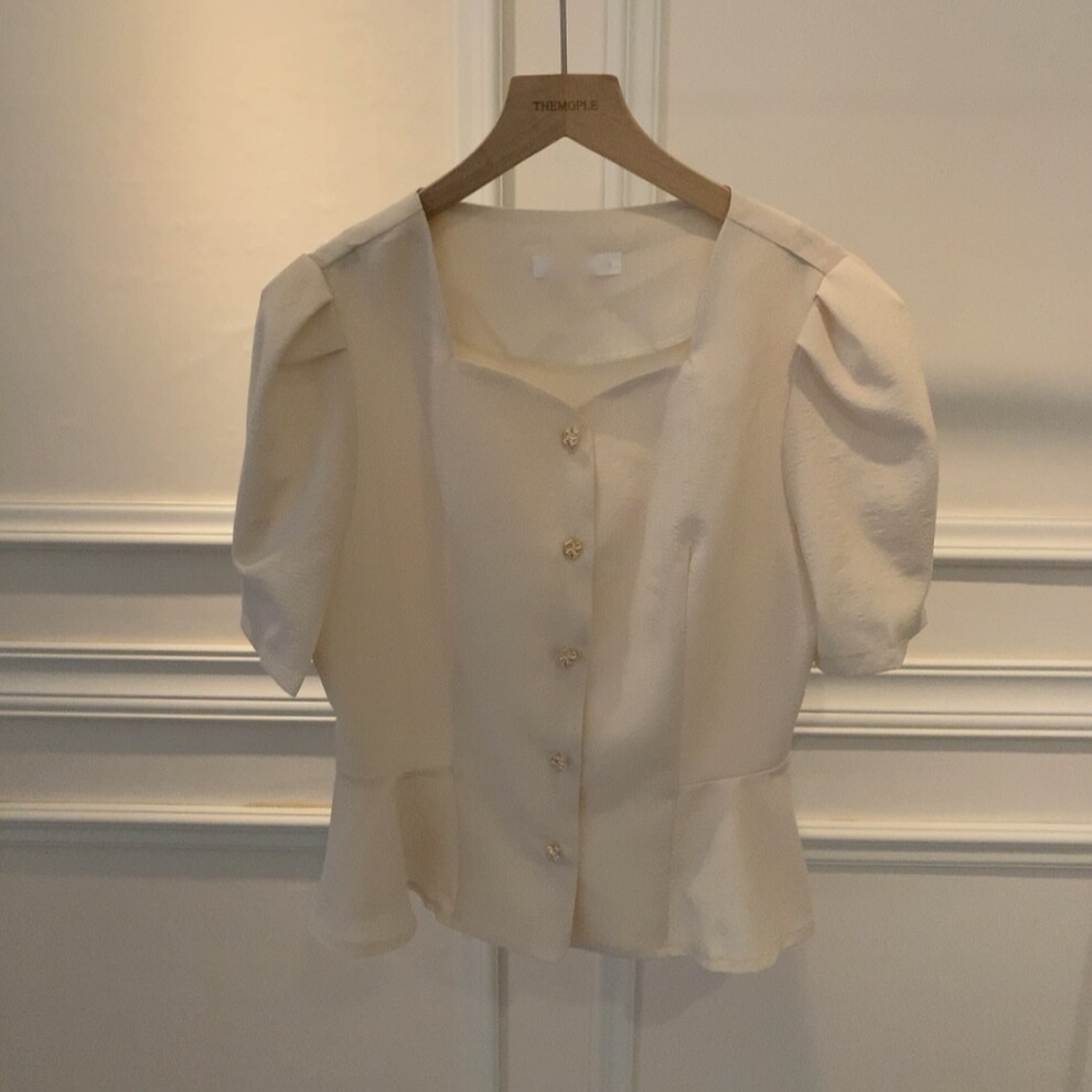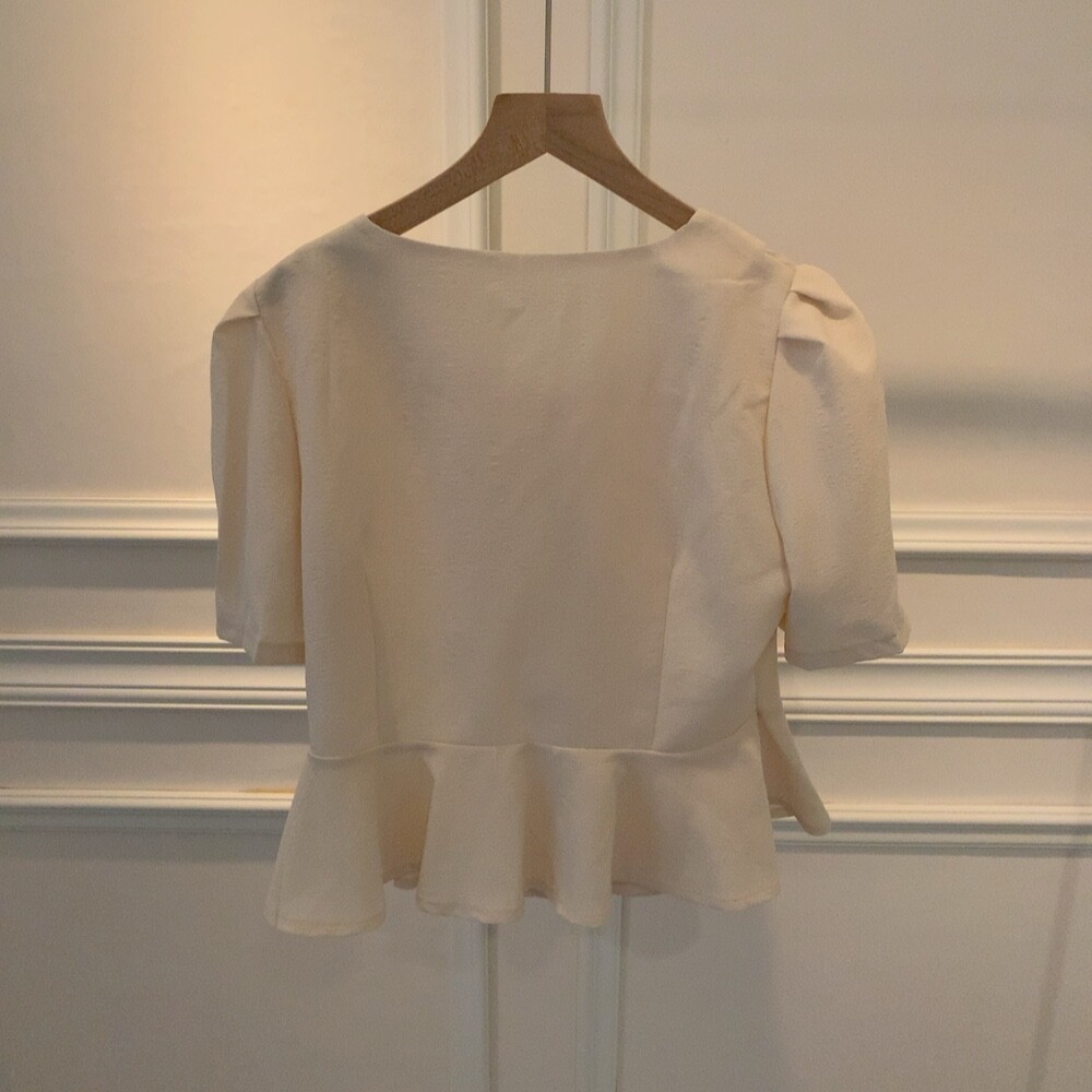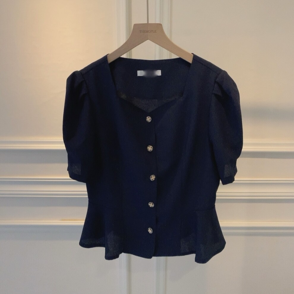 하트넥 여름 반팔 트위드 금장 단추 페플럼 훌 블라우스 (하객룩 결혼식 오피스룩)