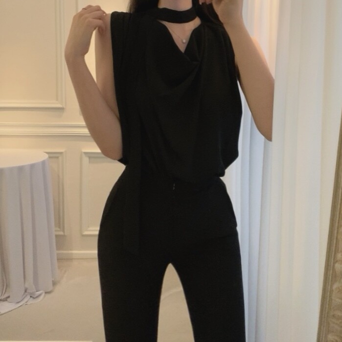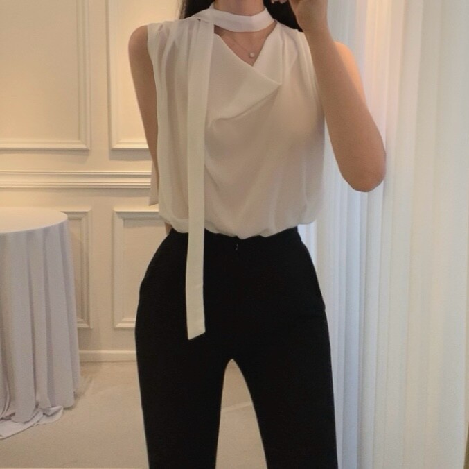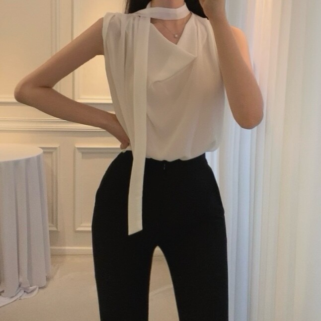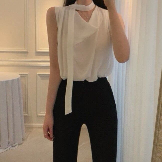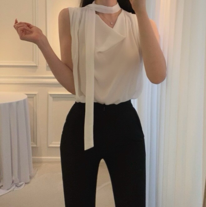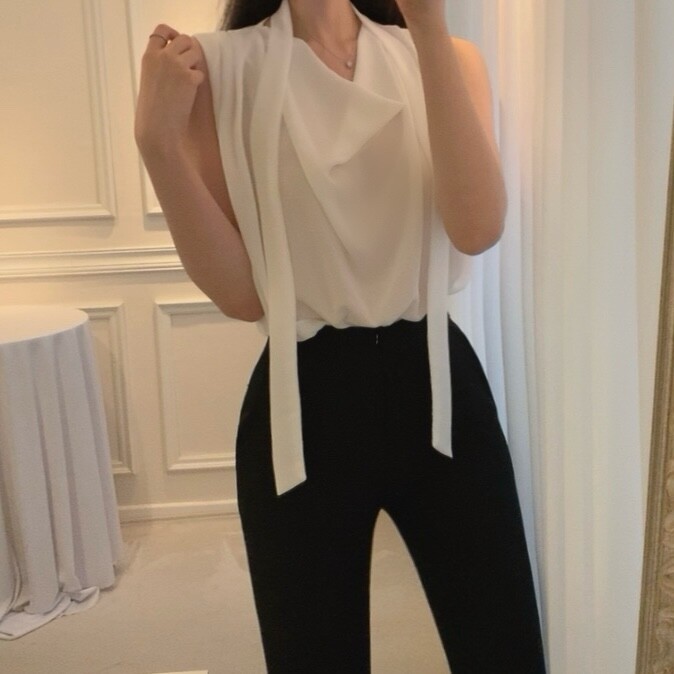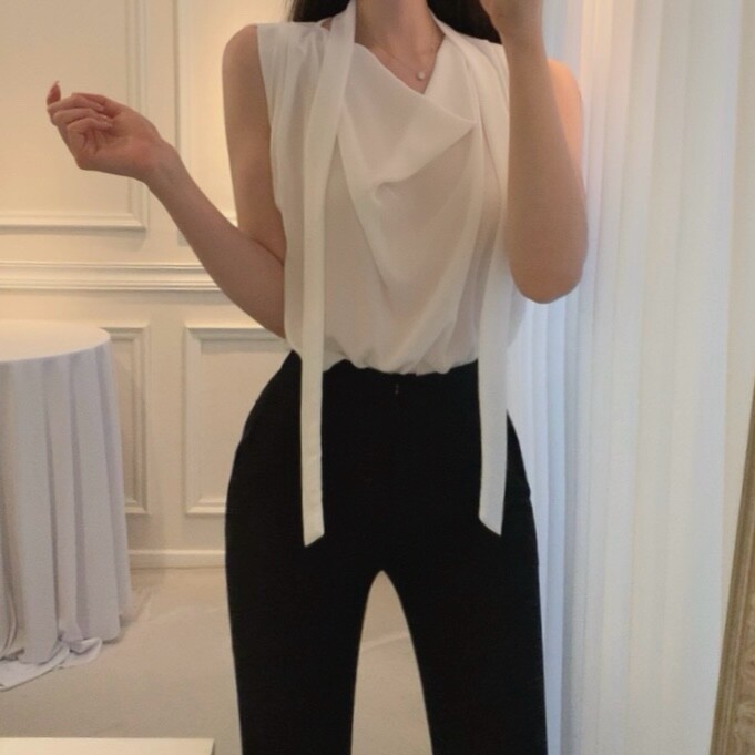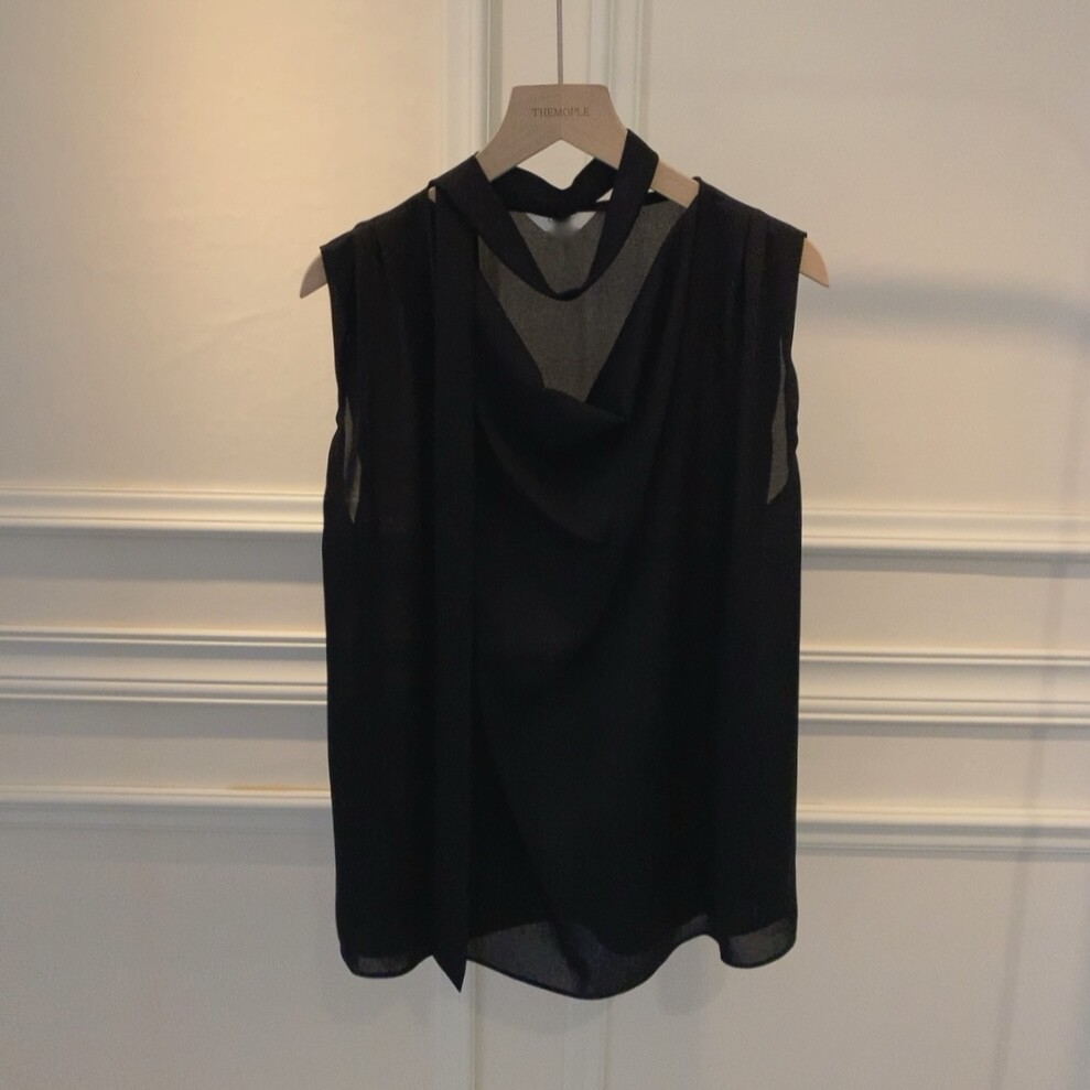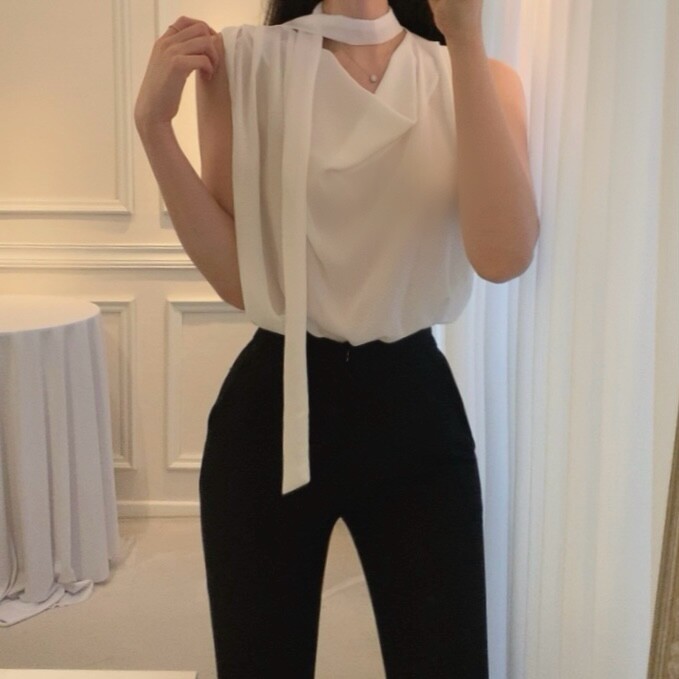 카울넥 타이 탈부착 드레이프 주름 나시 블라우스 (하객룩 결혼식 오피스룩)