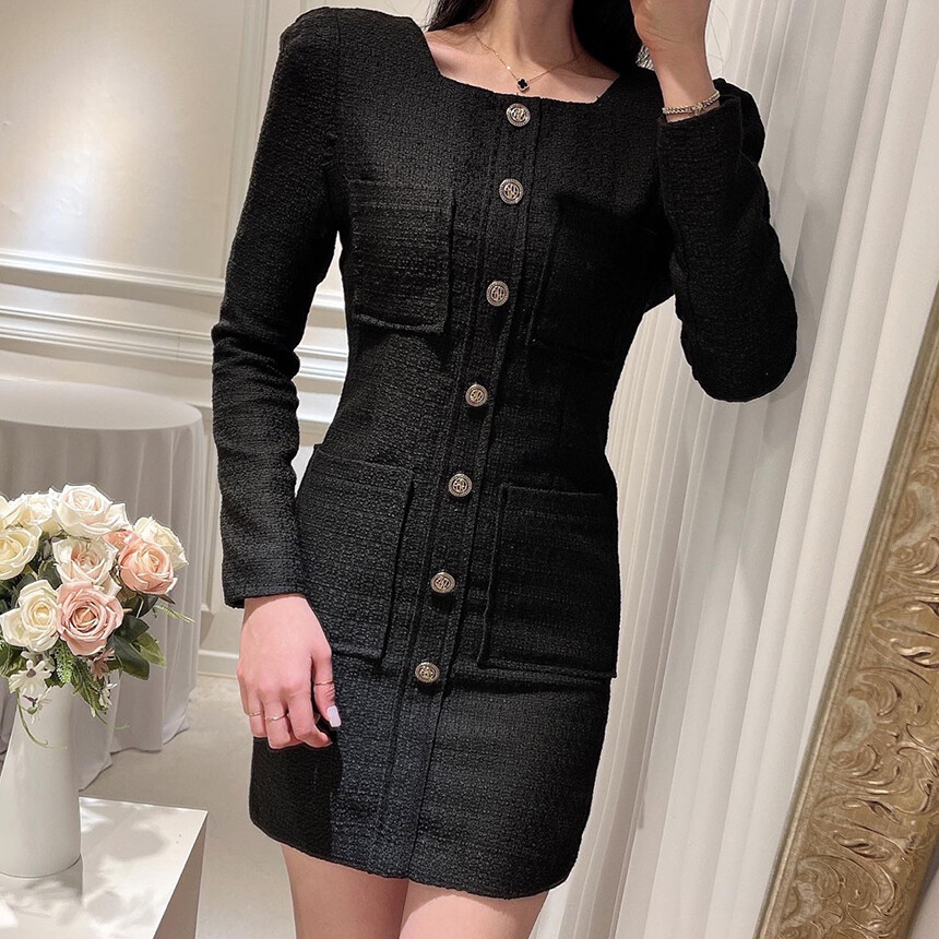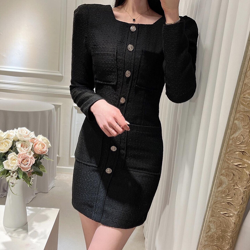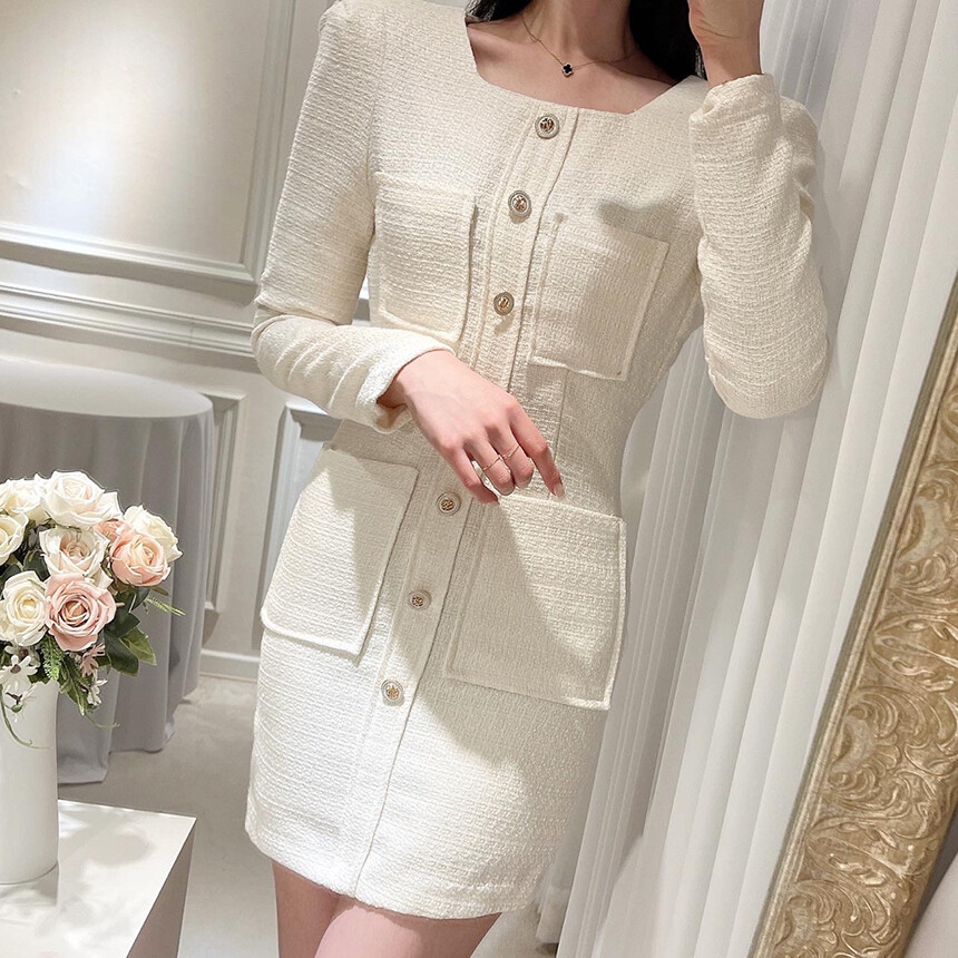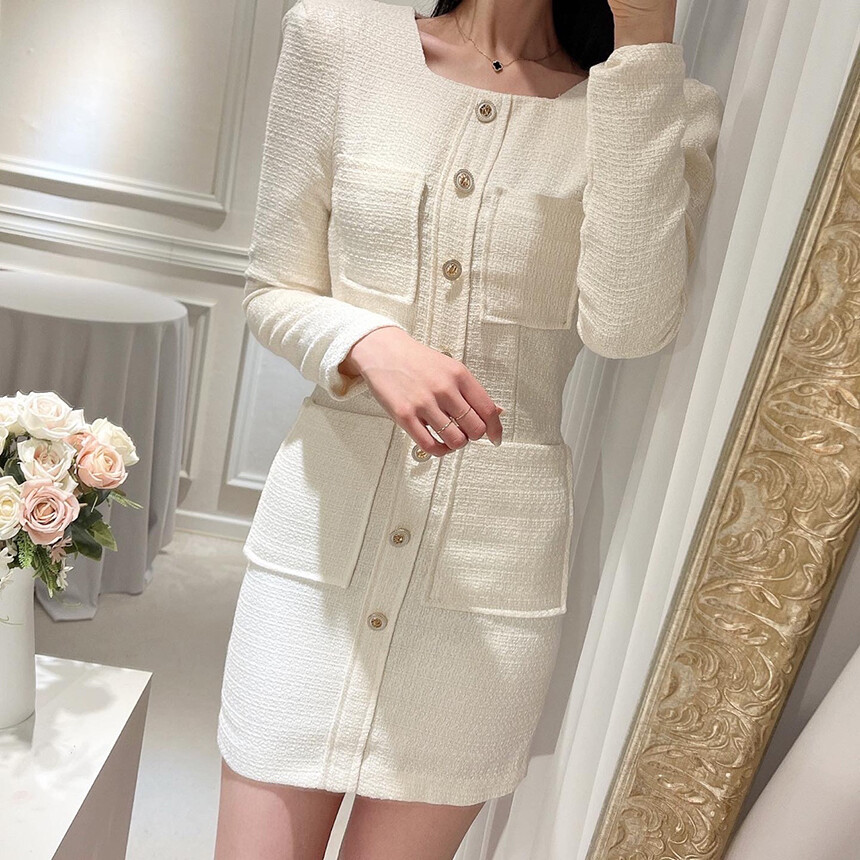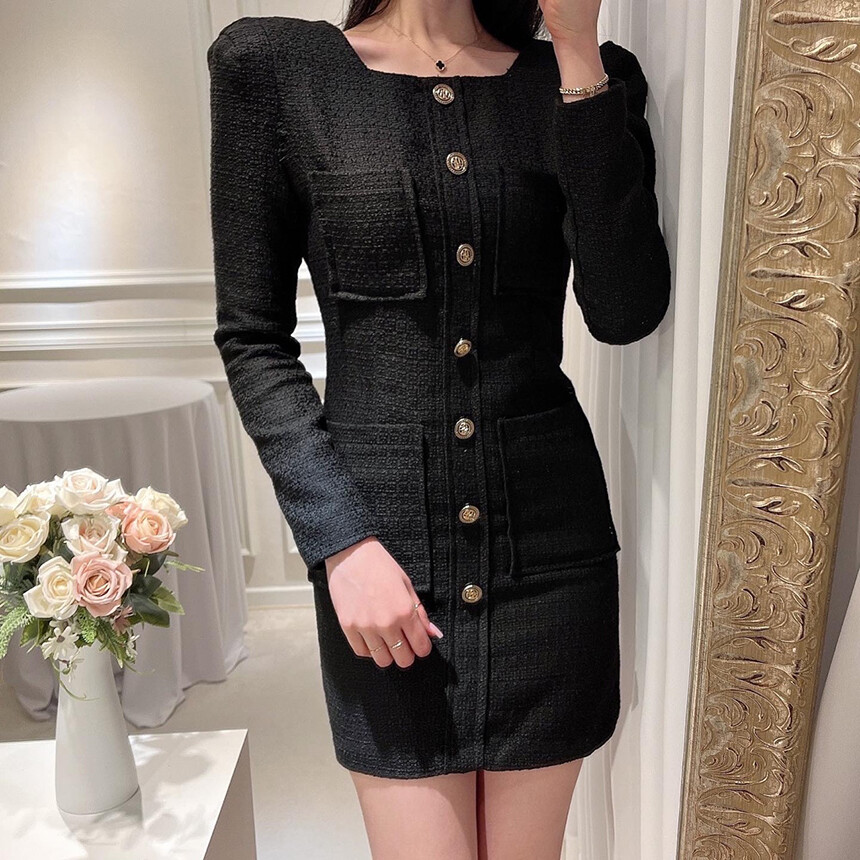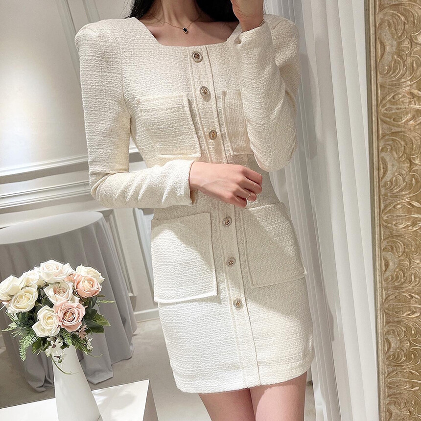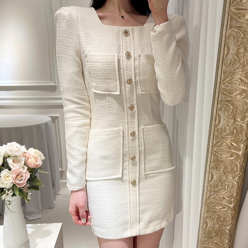 트위드 금장 버튼 스퀘어넥 슬림핏 미니원피스 (하객룩 파티룩 데이트룩)