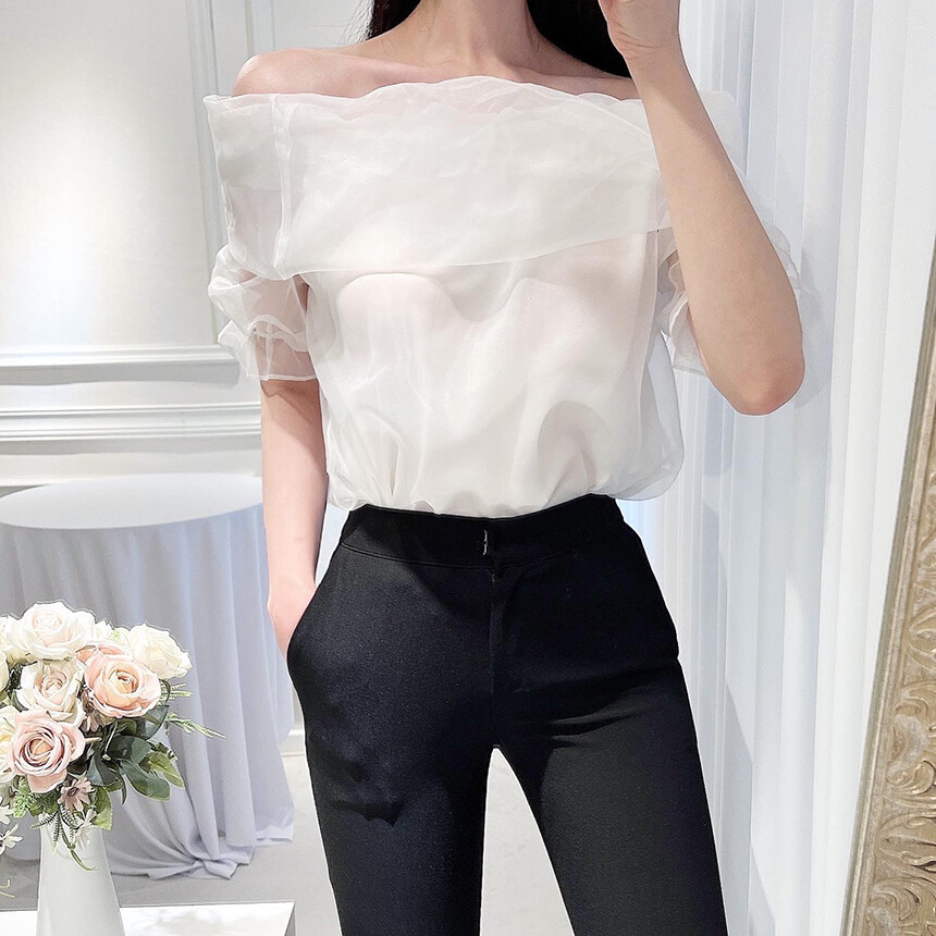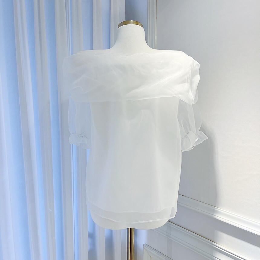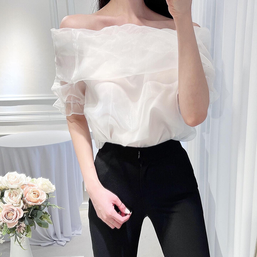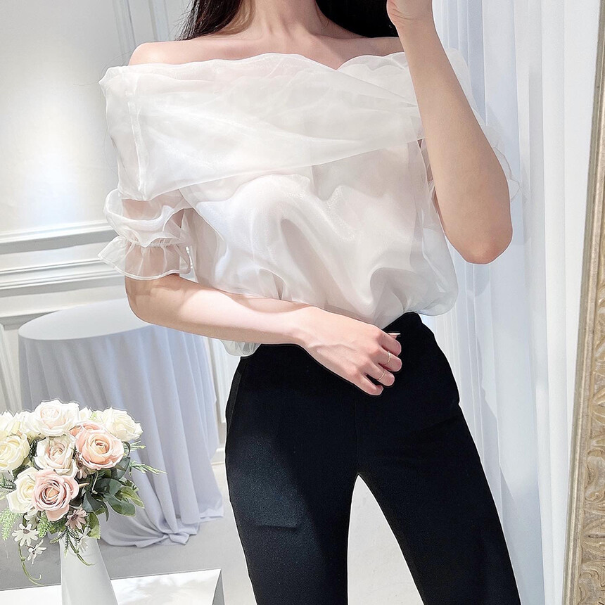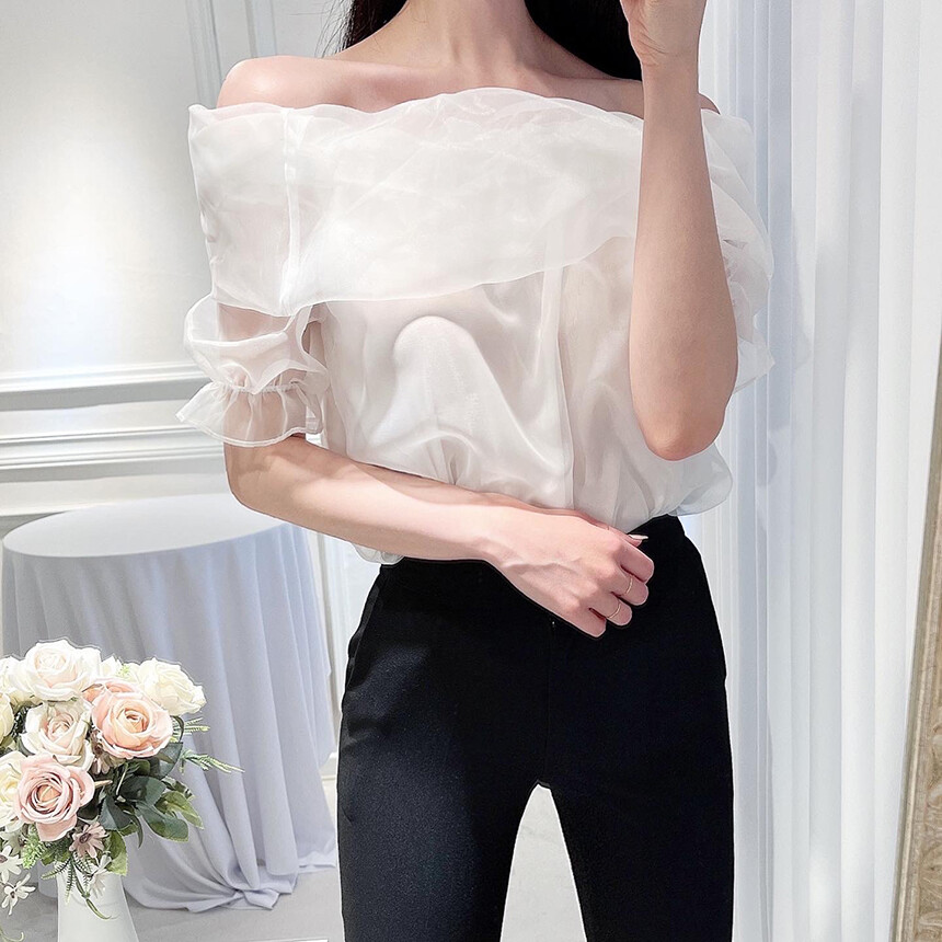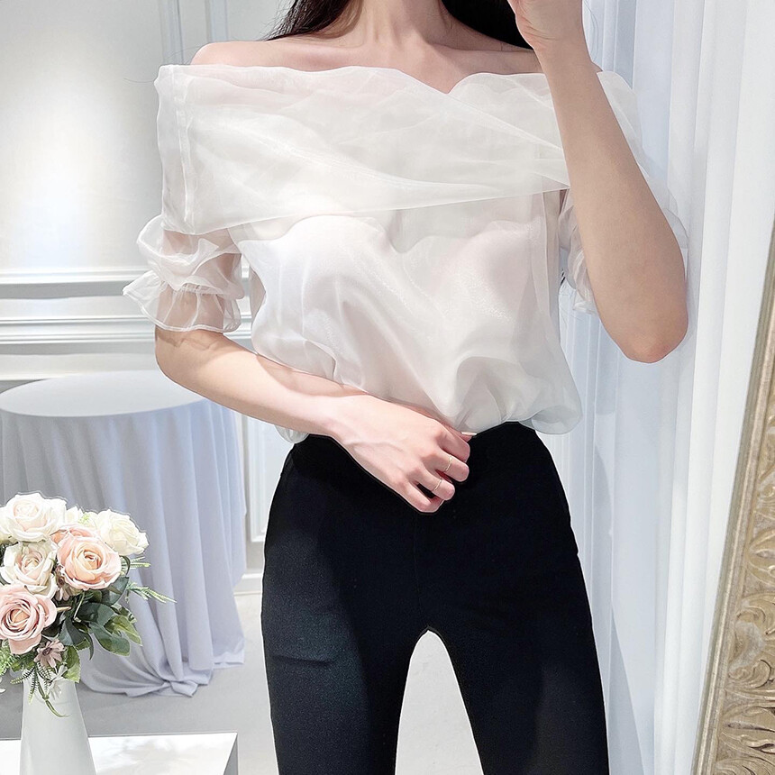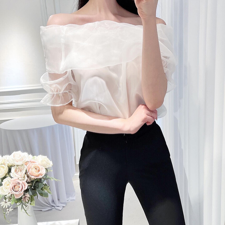 (고퀄리티) 반팔 노방 오간자 시스루 오프숄더 블라우스