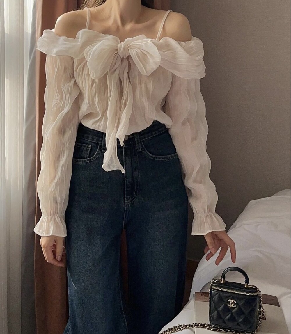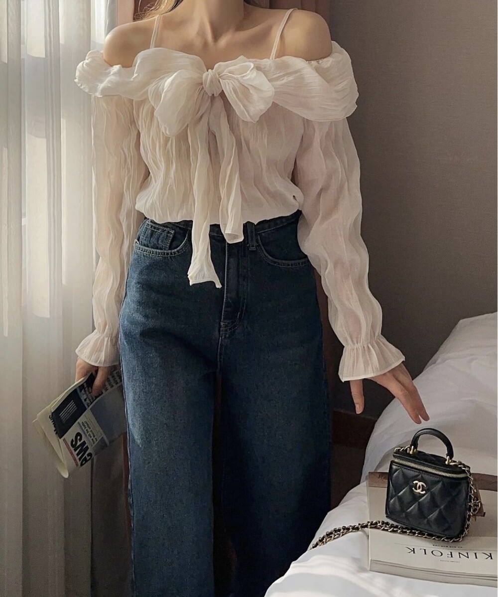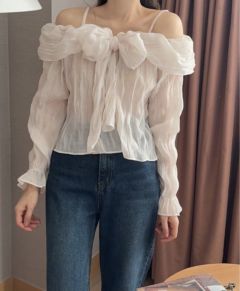 리본 스카프 타이 끈 오프숄더 셔링 주름 러블리 블라우스 (연말룩 파티룩 데이트룩)