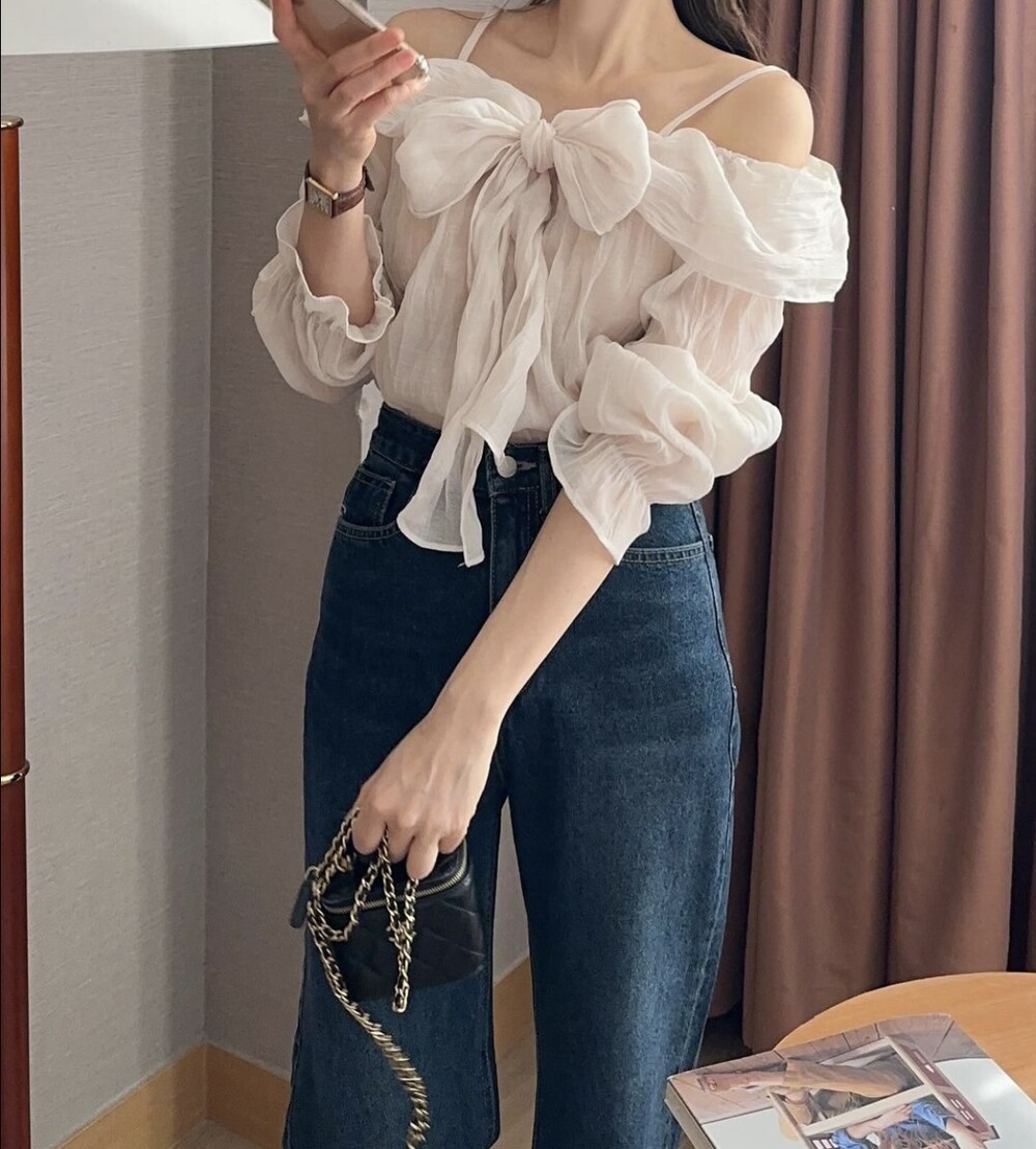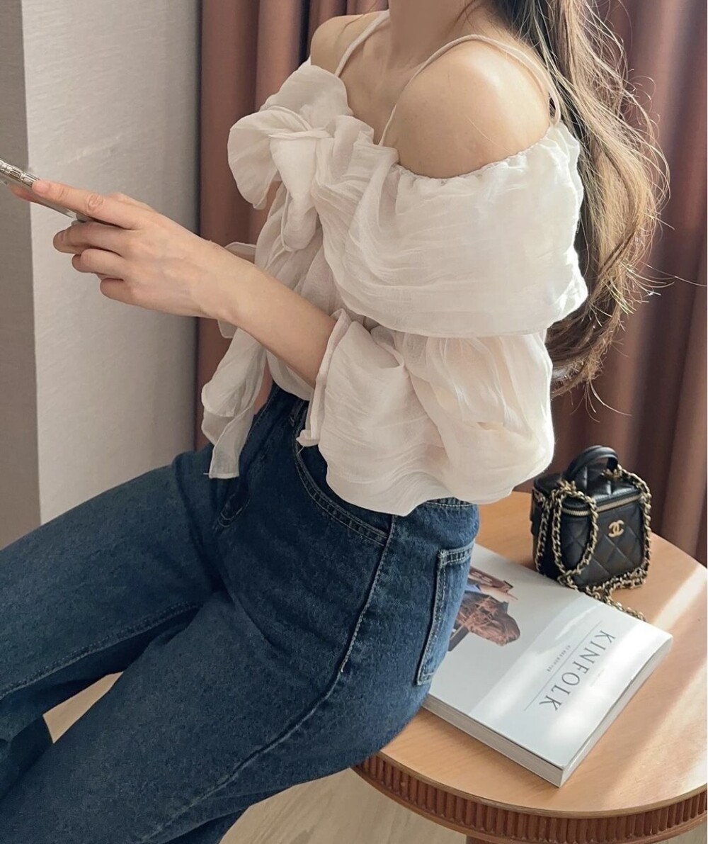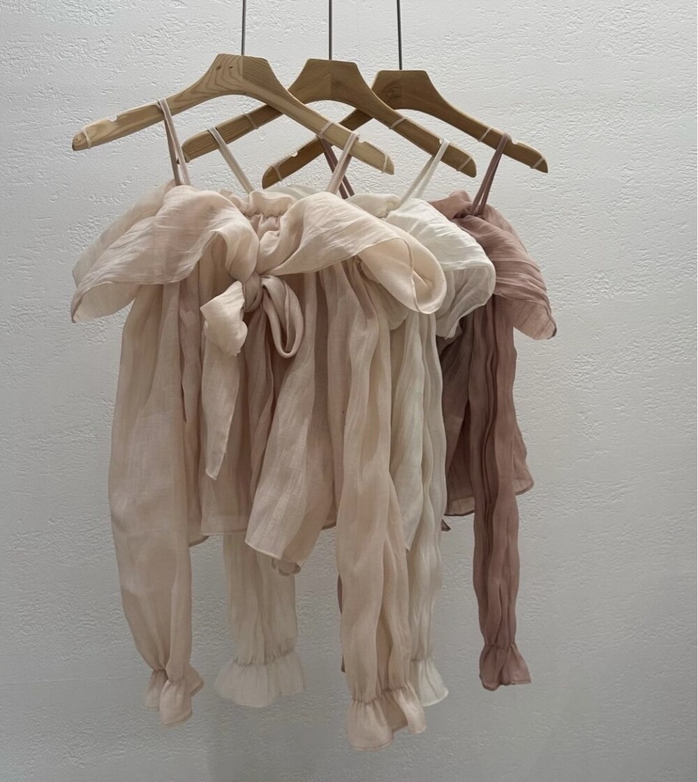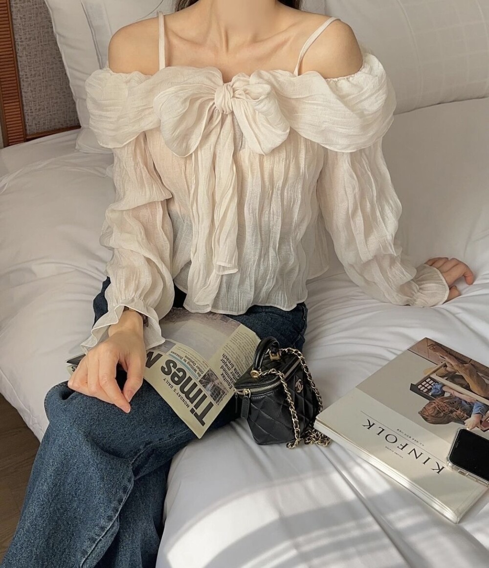 리본 스카프 타이 끈 오프숄더 셔링 주름 러블리 블라우스 (연말룩 파티룩 데이트룩)