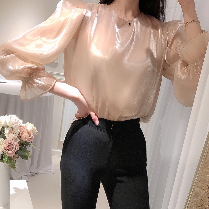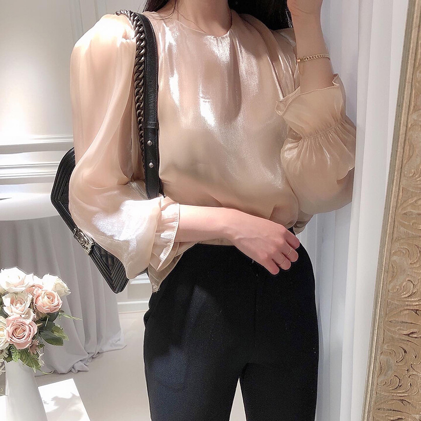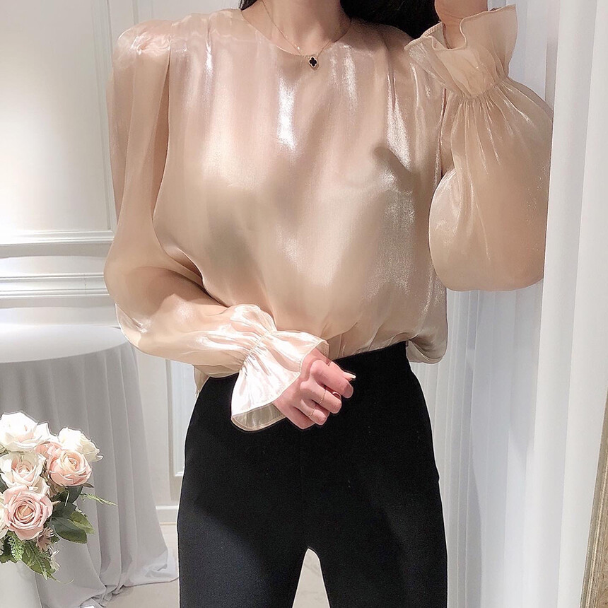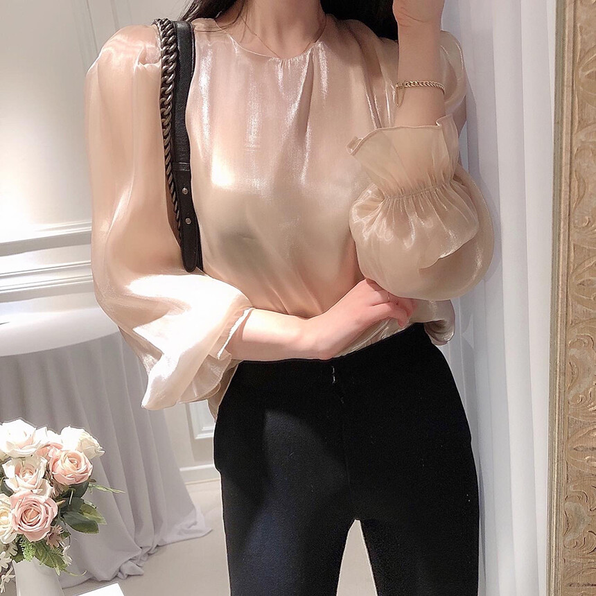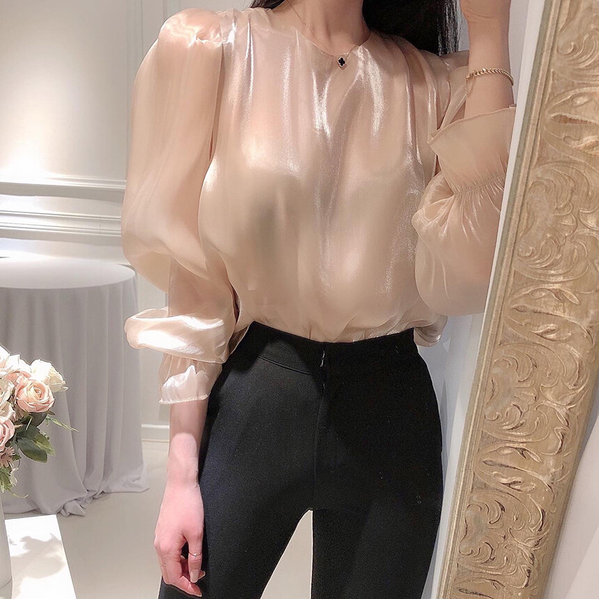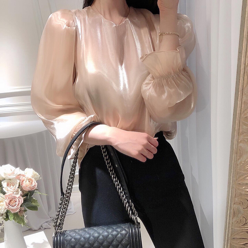 (고퀄리티) 고급 새틴 광택 퍼프 볼륨 소매 여리여리 블라우스 (하객룩 데이트룩 연말룩)