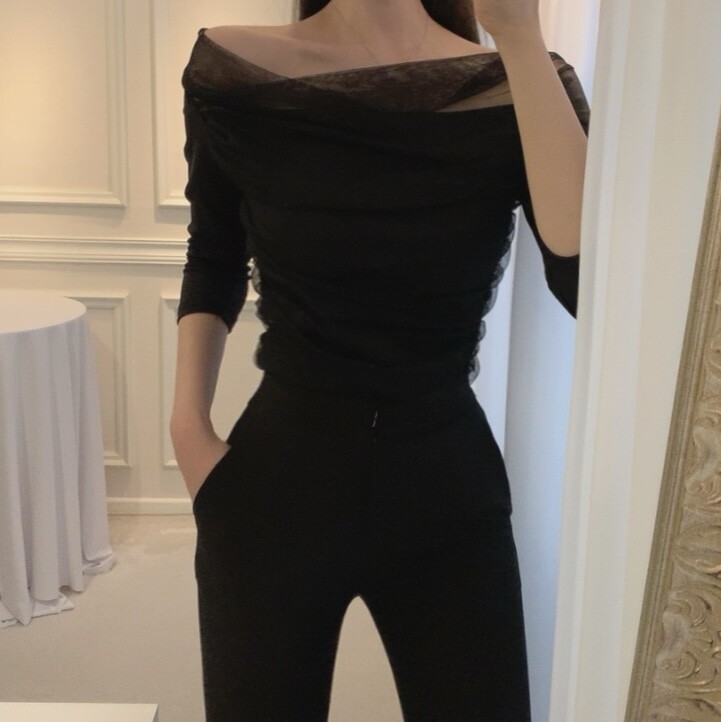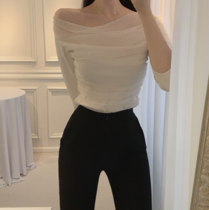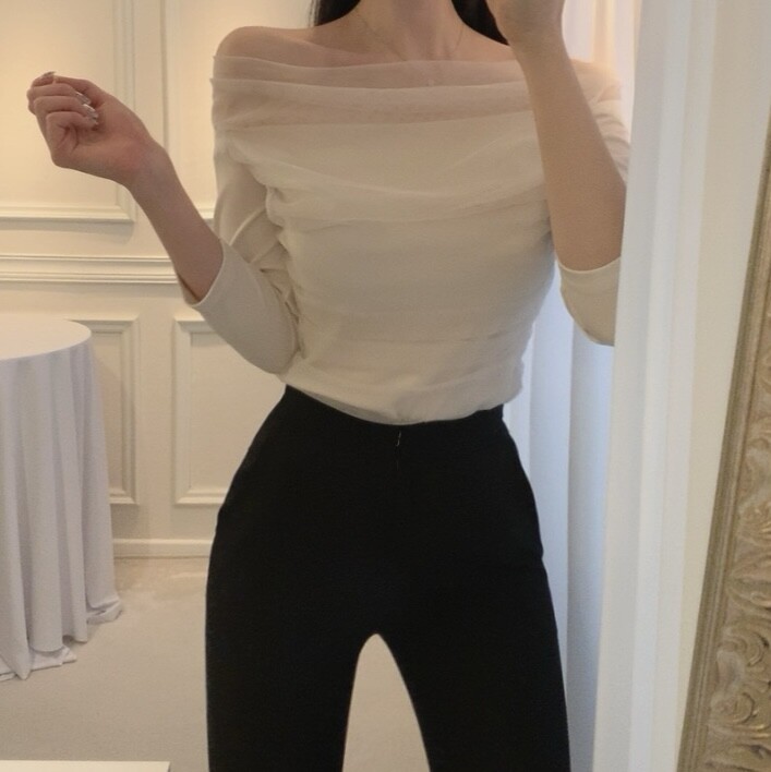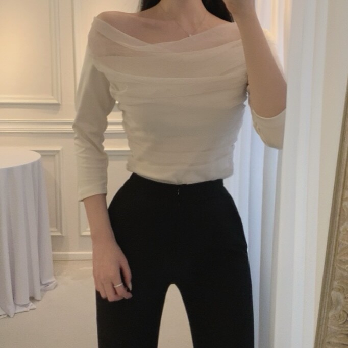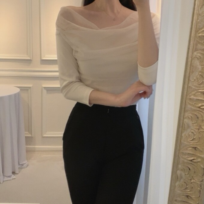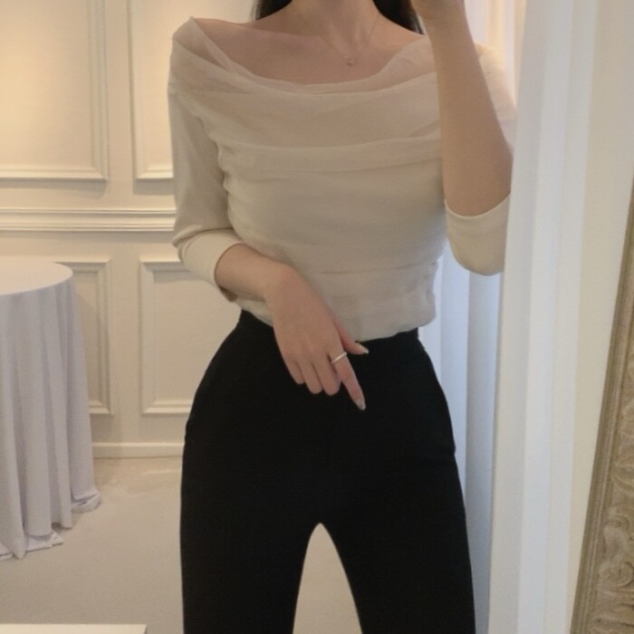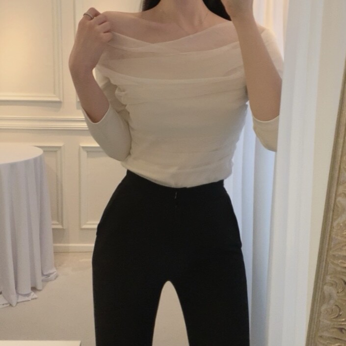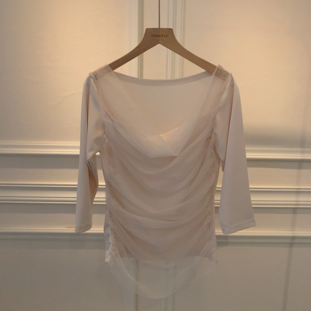 시스루 망사 오간자 드레이프 주름 셔링 7부 소매 블라우스 티셔츠