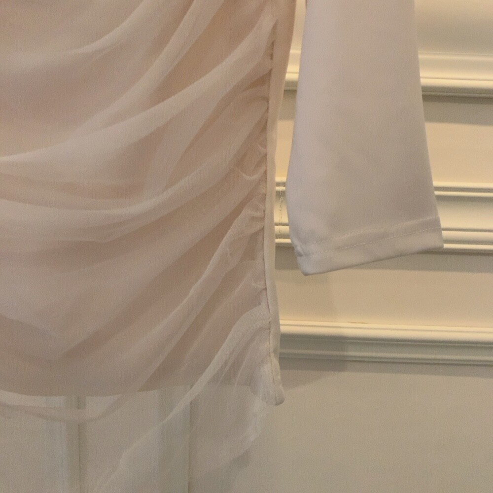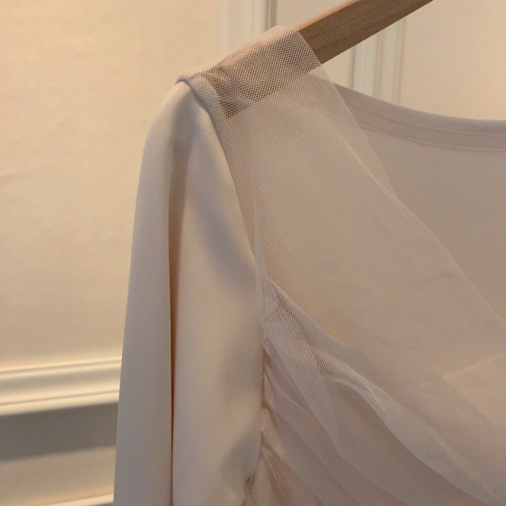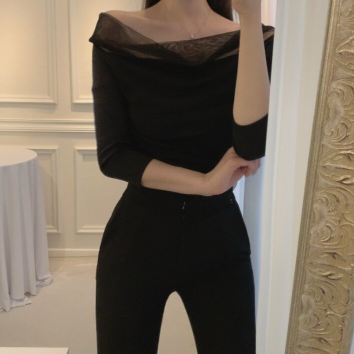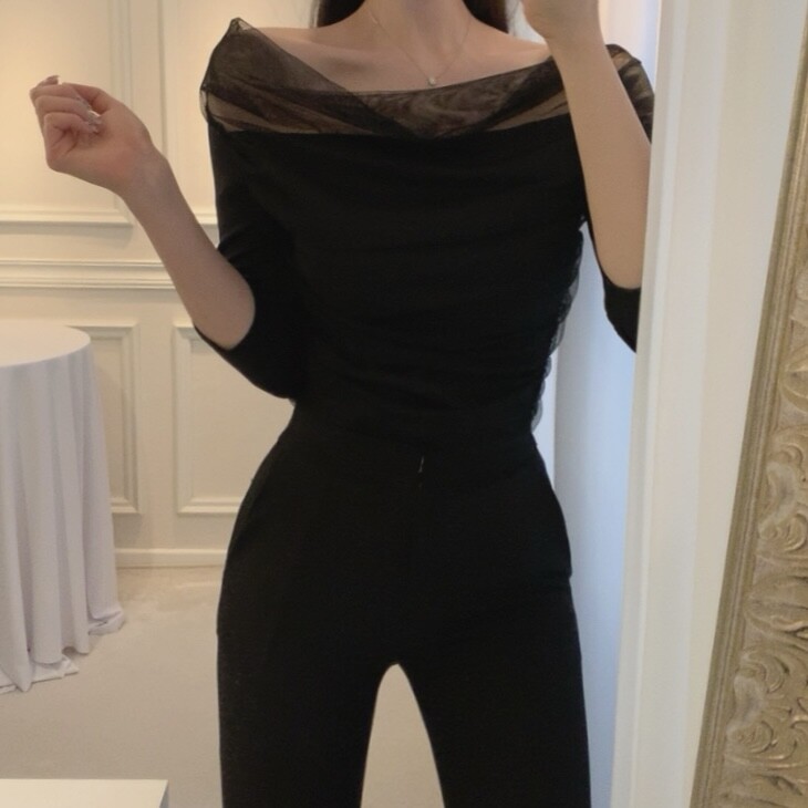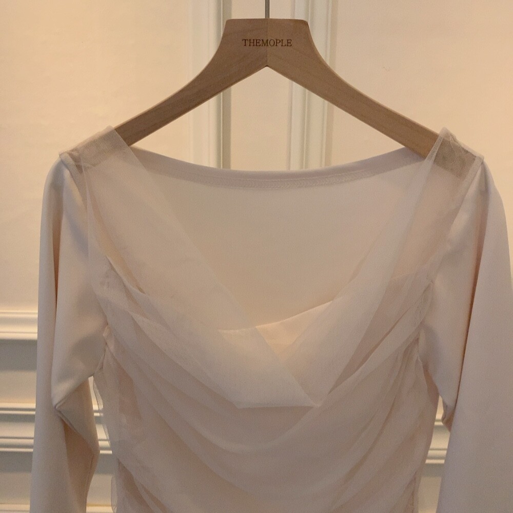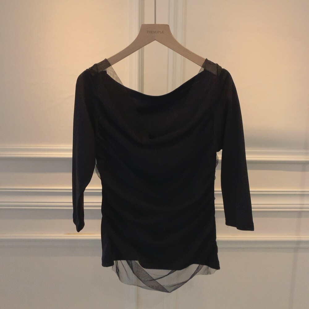 시스루 망사 오간자 드레이프 주름 셔링 7부 소매 블라우스 티셔츠