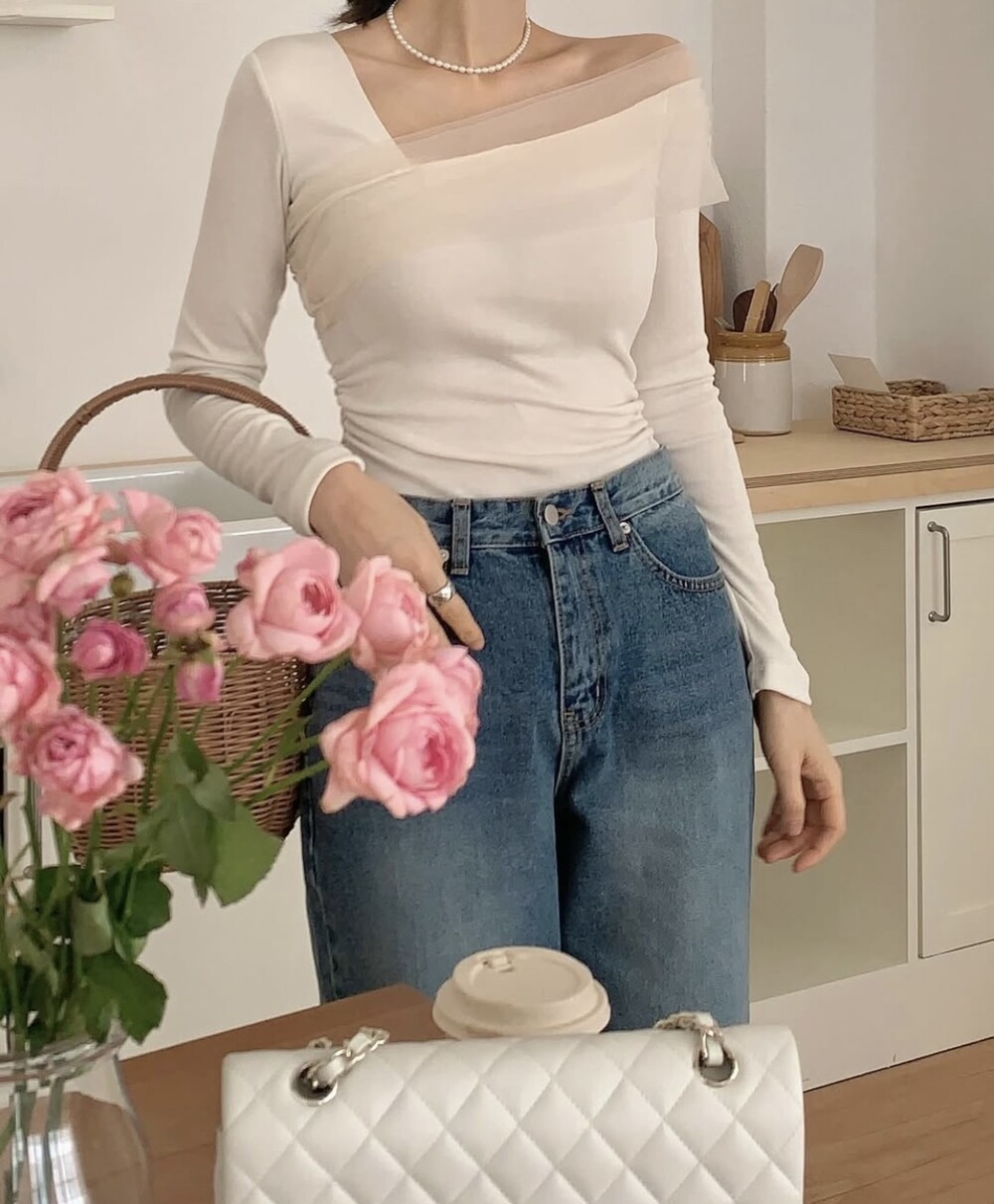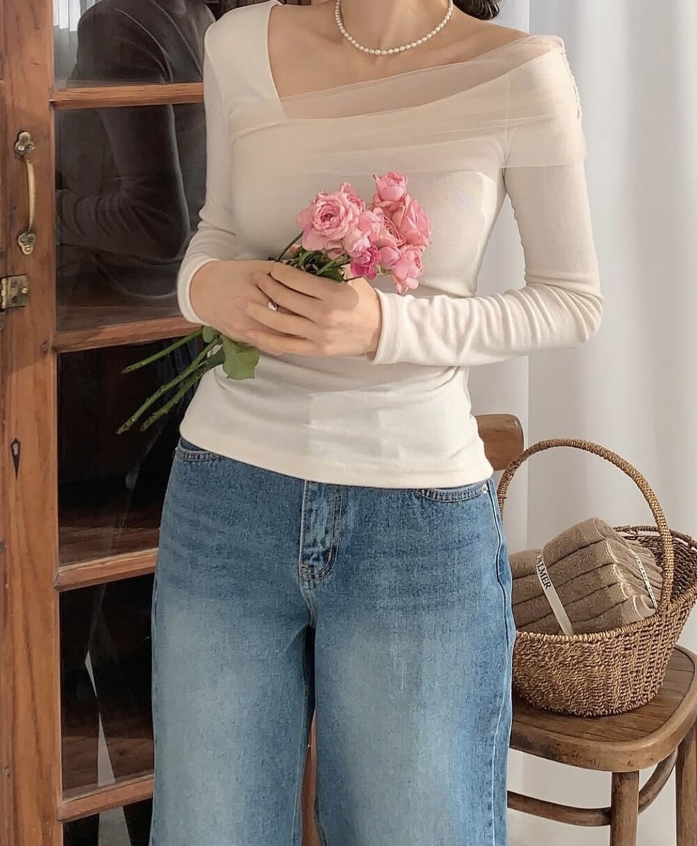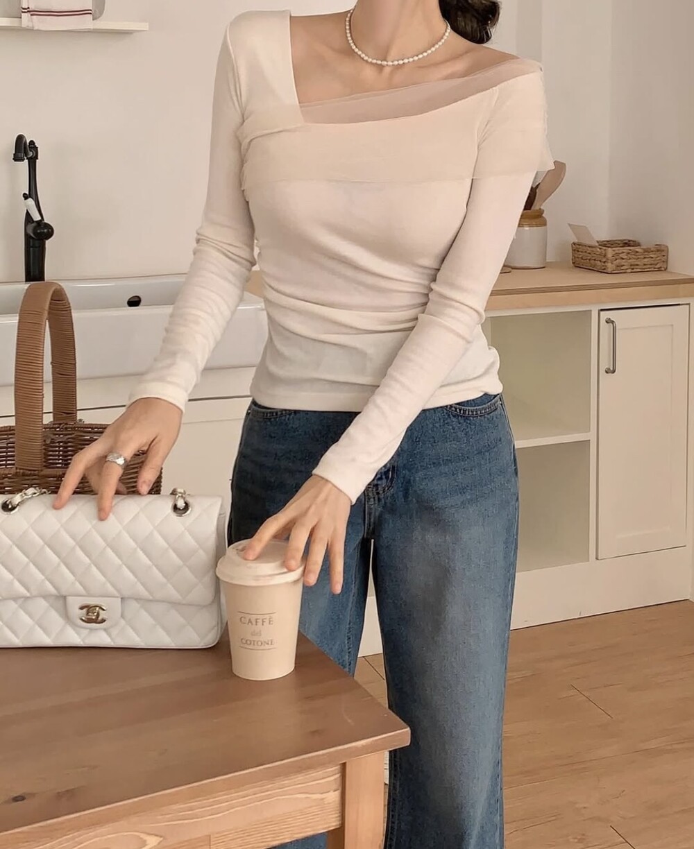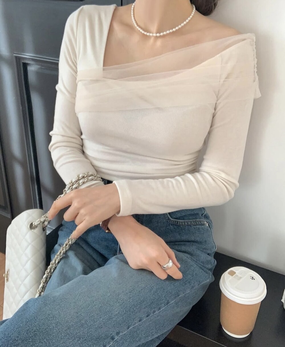 노방 시스루 언발란스 스판 긴팔 티셔츠