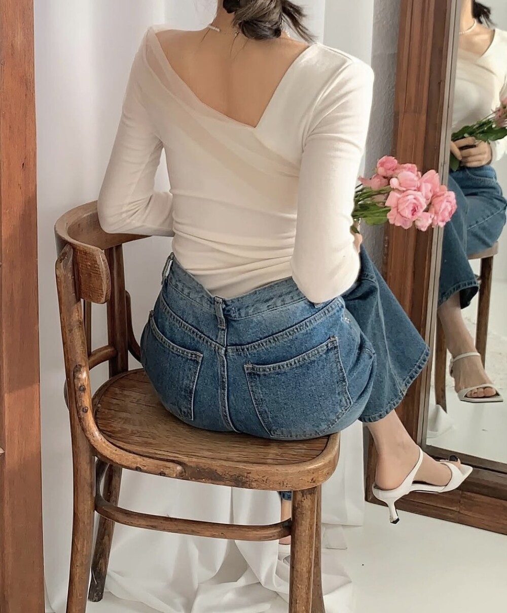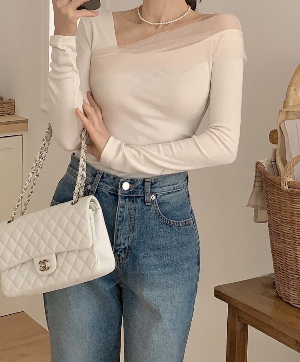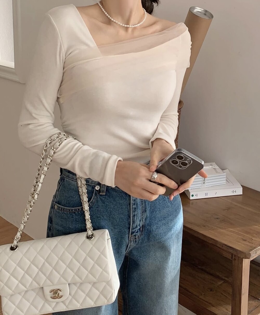 노방 시스루 언발란스 스판 긴팔 티셔츠