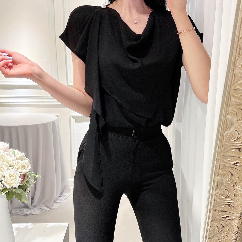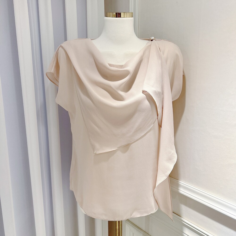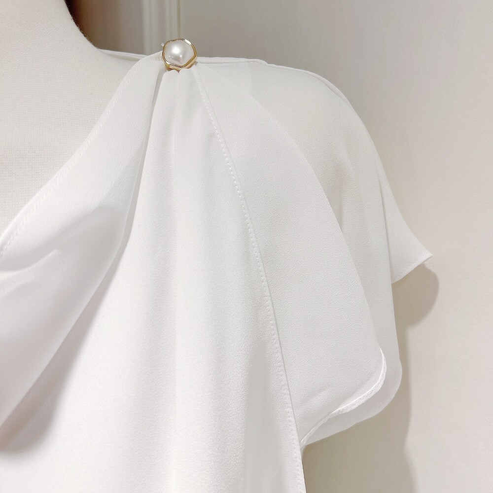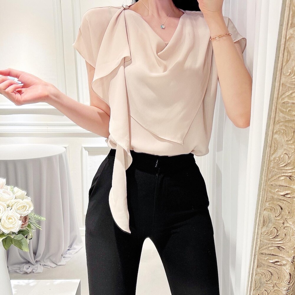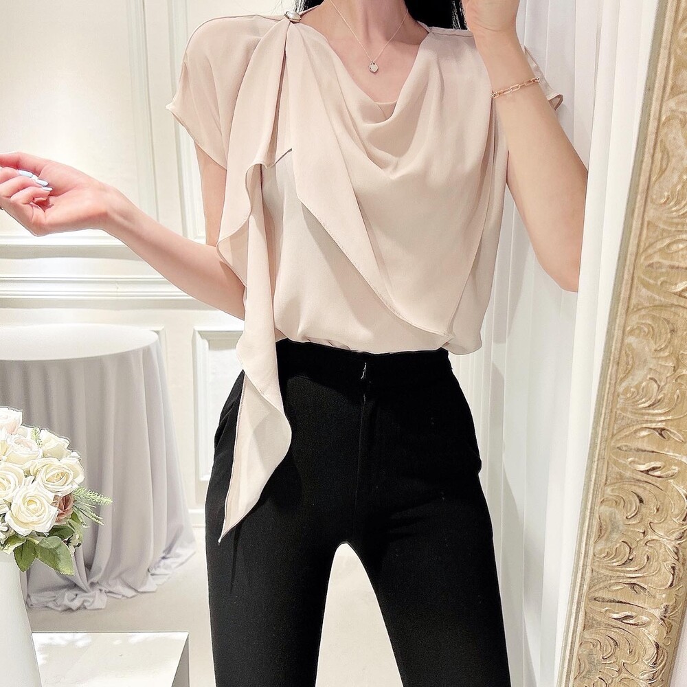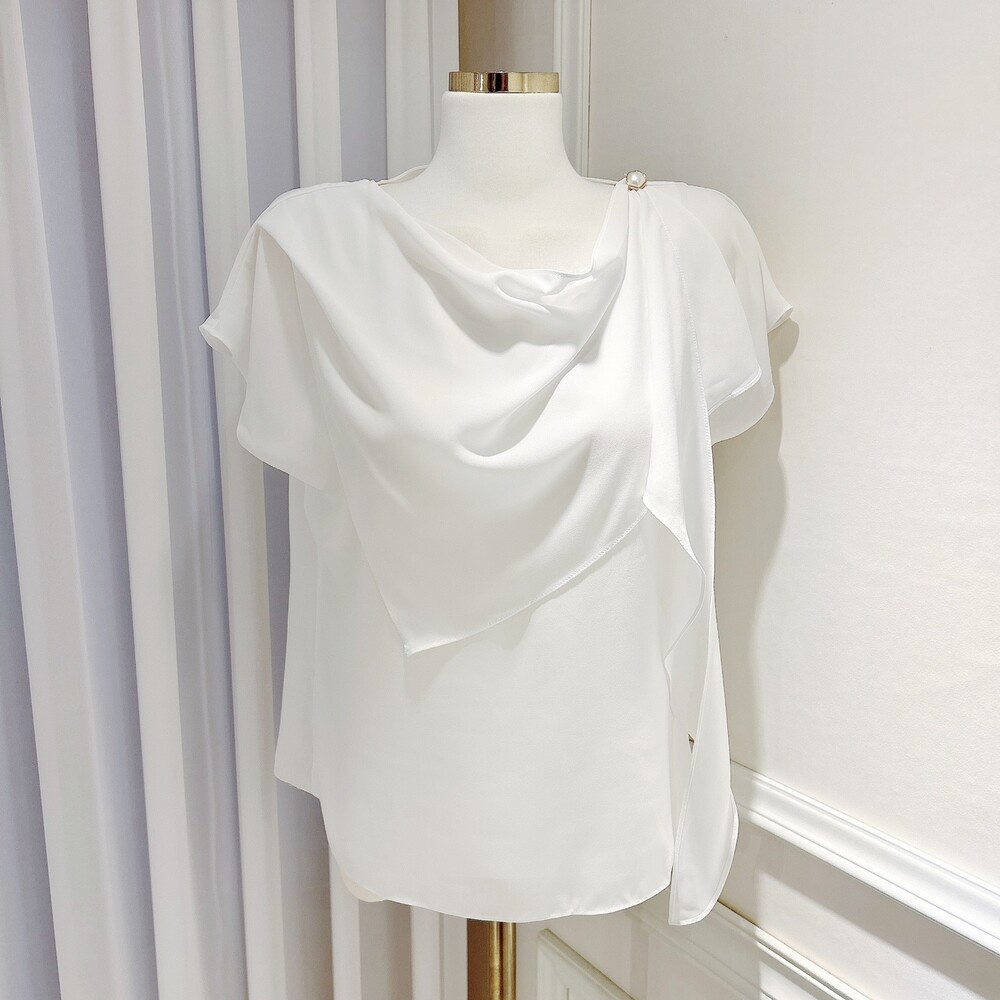 쉬폰 글로시 스카프 진주 단추 여신 반팔 블라우스 (하객룩 럭셔리룩 모임룩)