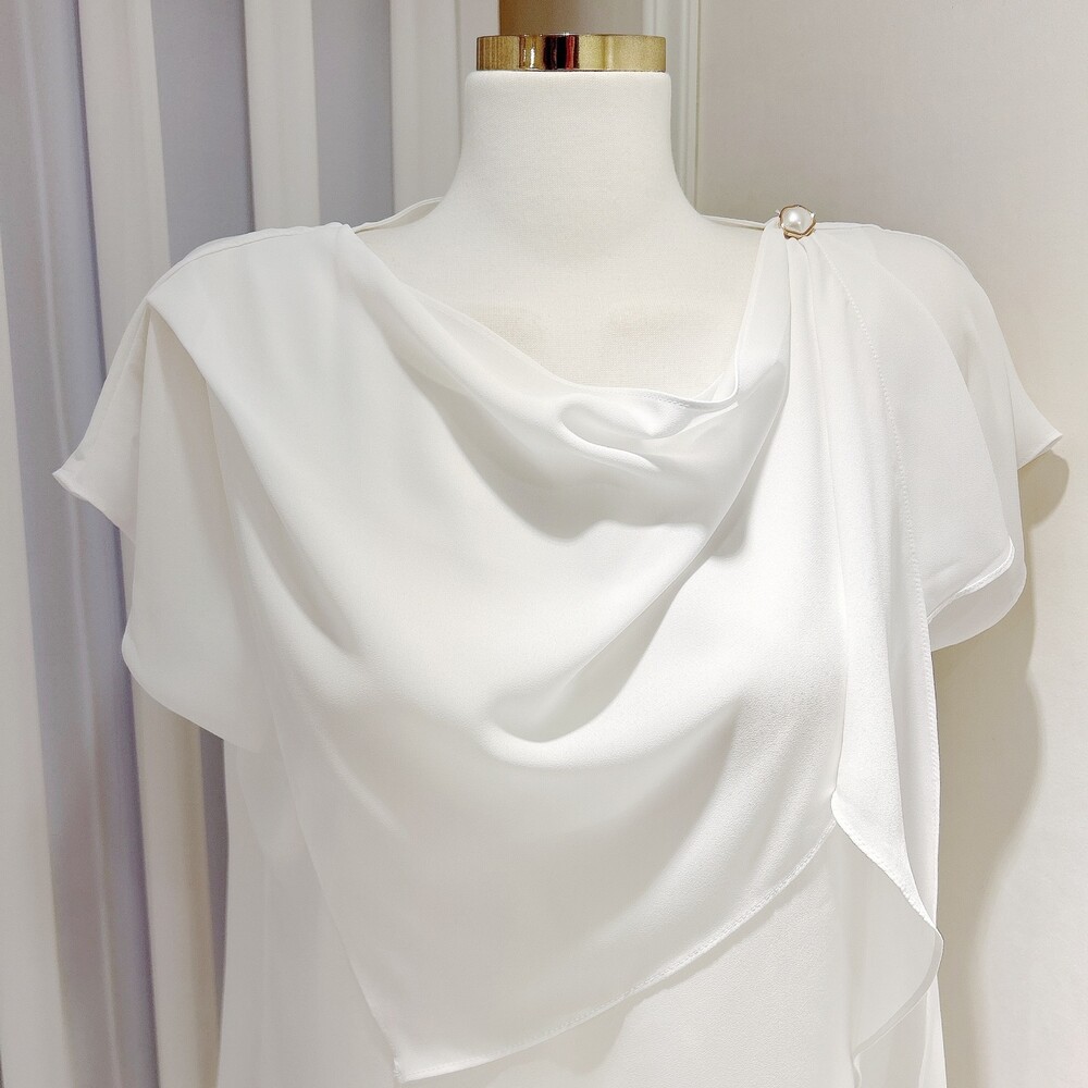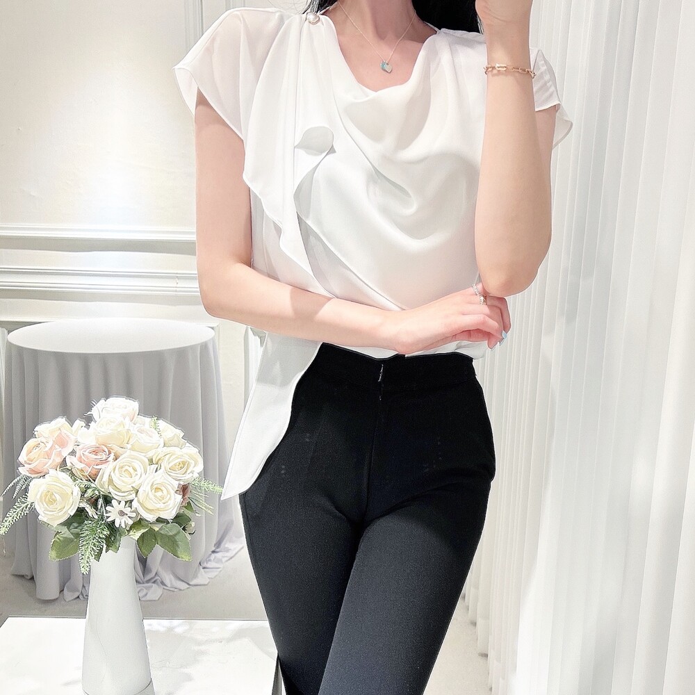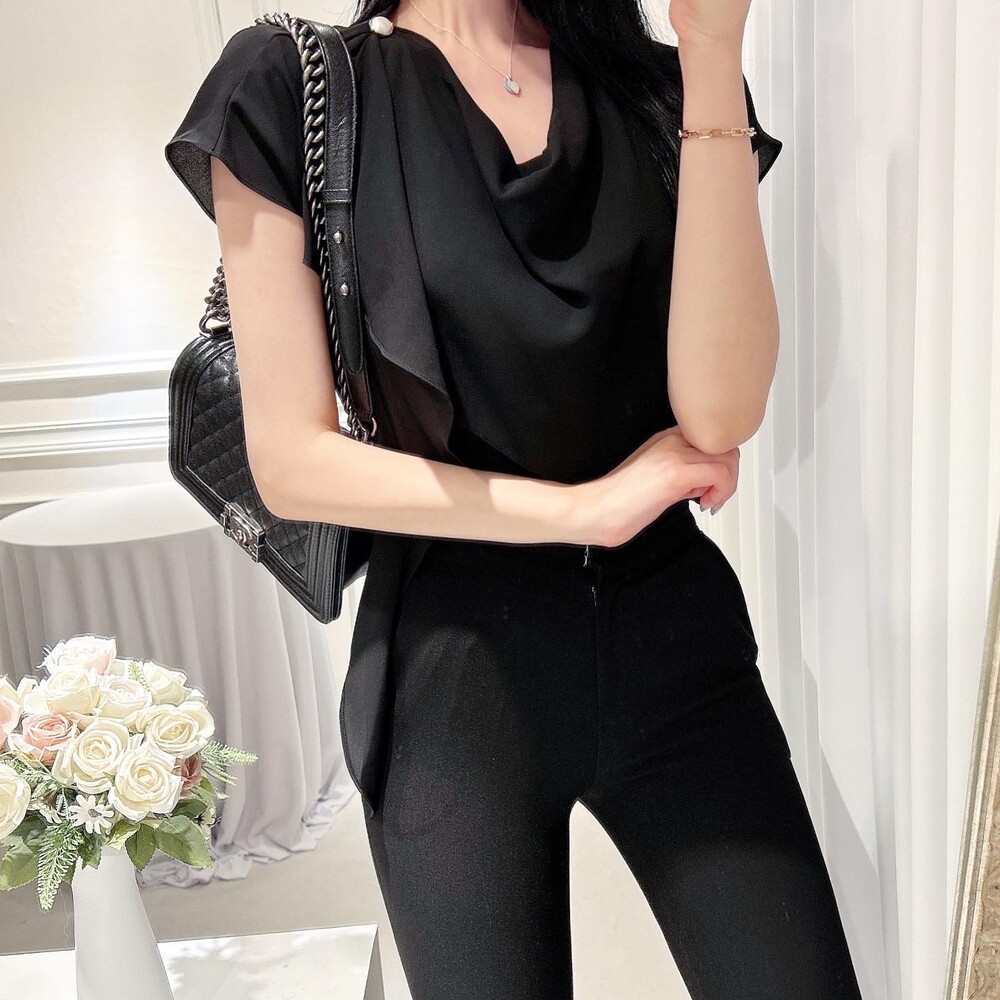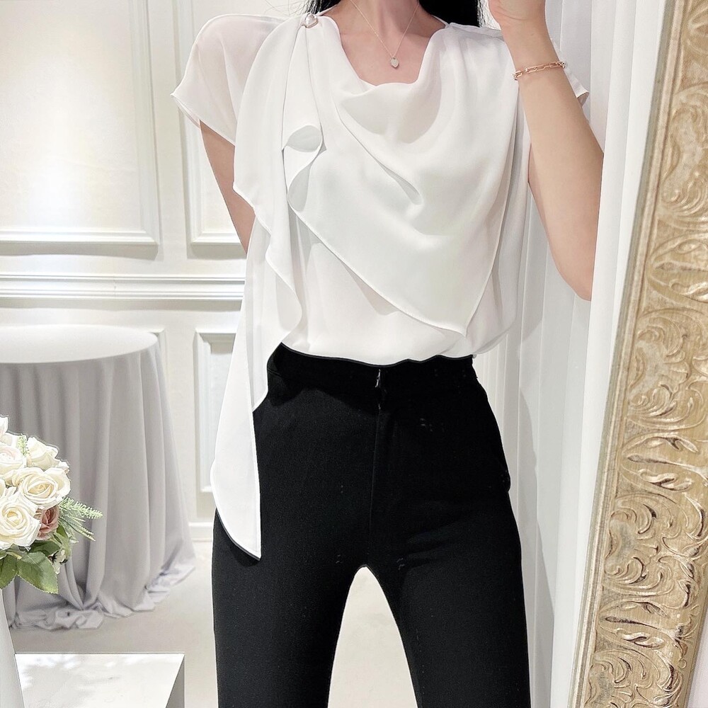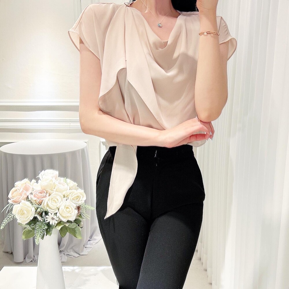 쉬폰 글로시 스카프 진주 단추 여신 반팔 블라우스 (하객룩 럭셔리룩 모임룩)