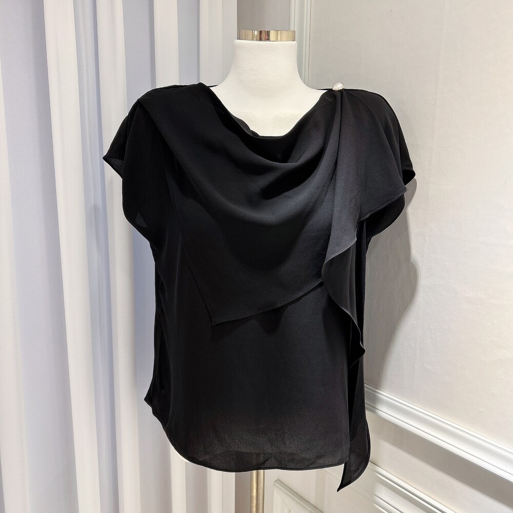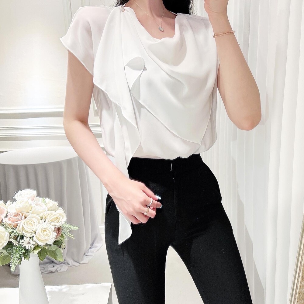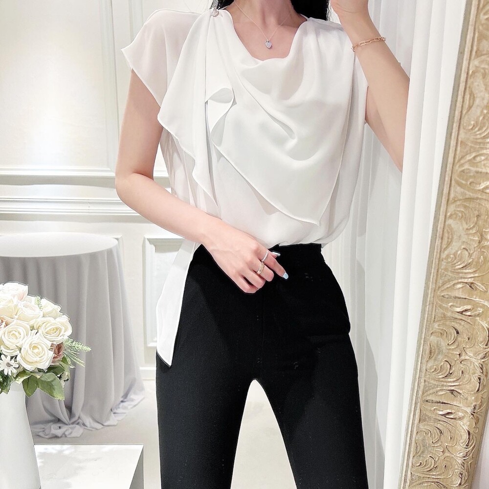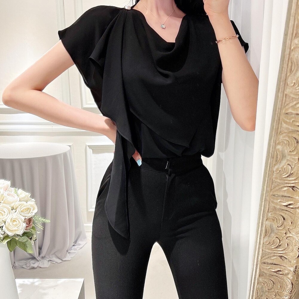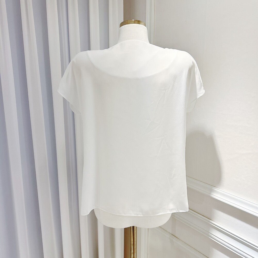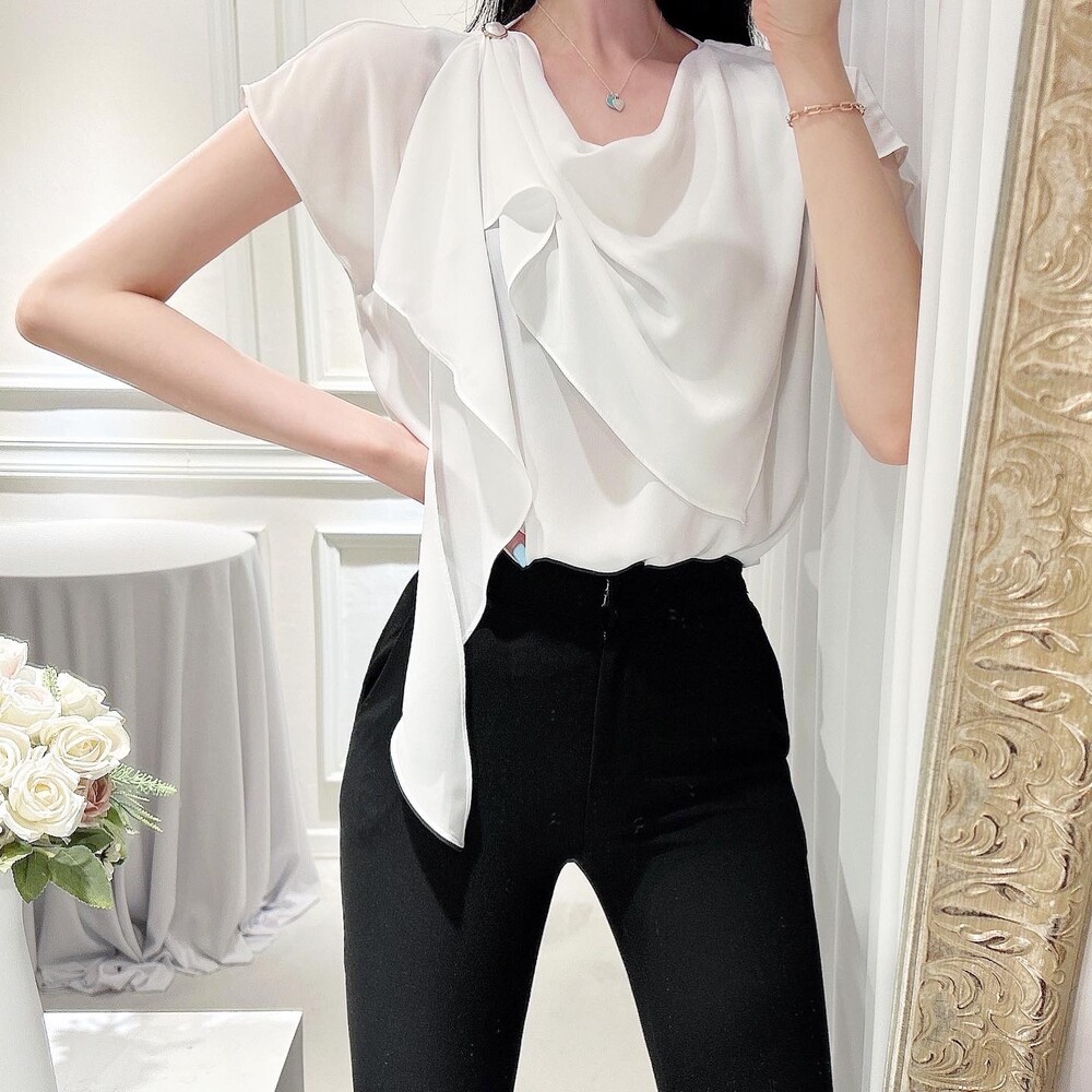 쉬폰 글로시 스카프 진주 단추 여신 반팔 블라우스 (하객룩 럭셔리룩 모임룩)