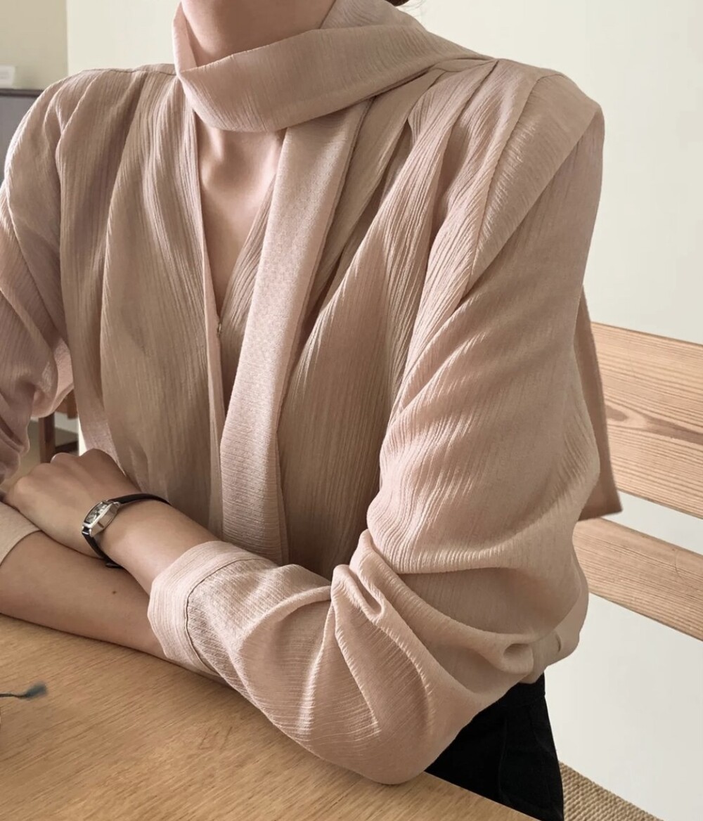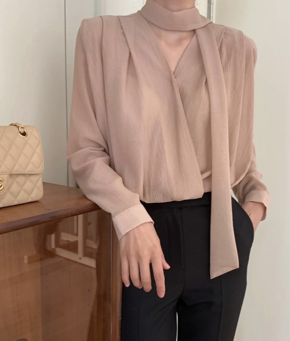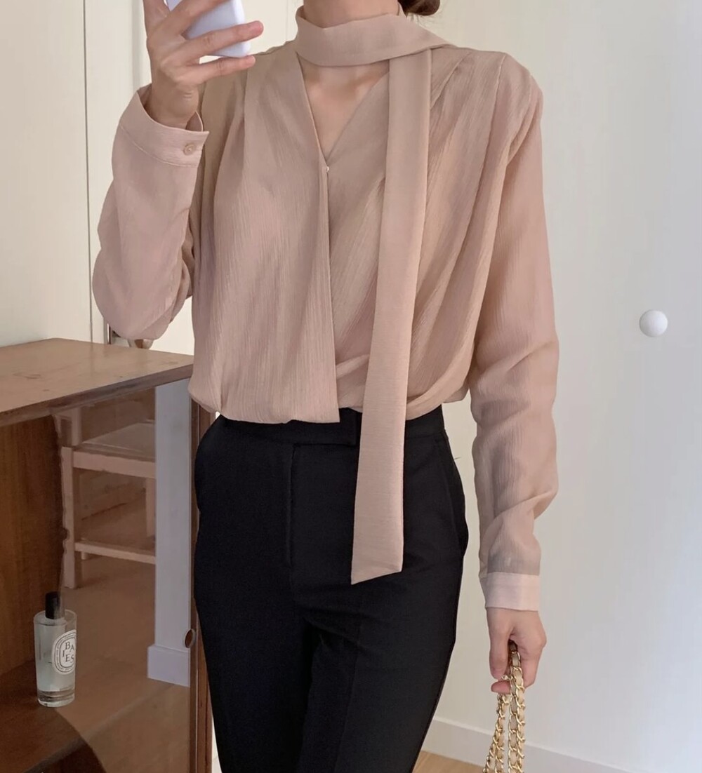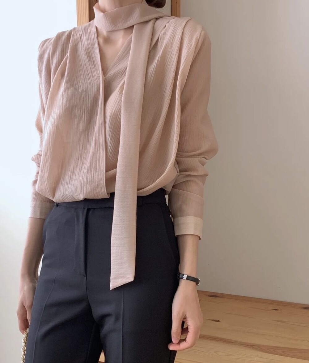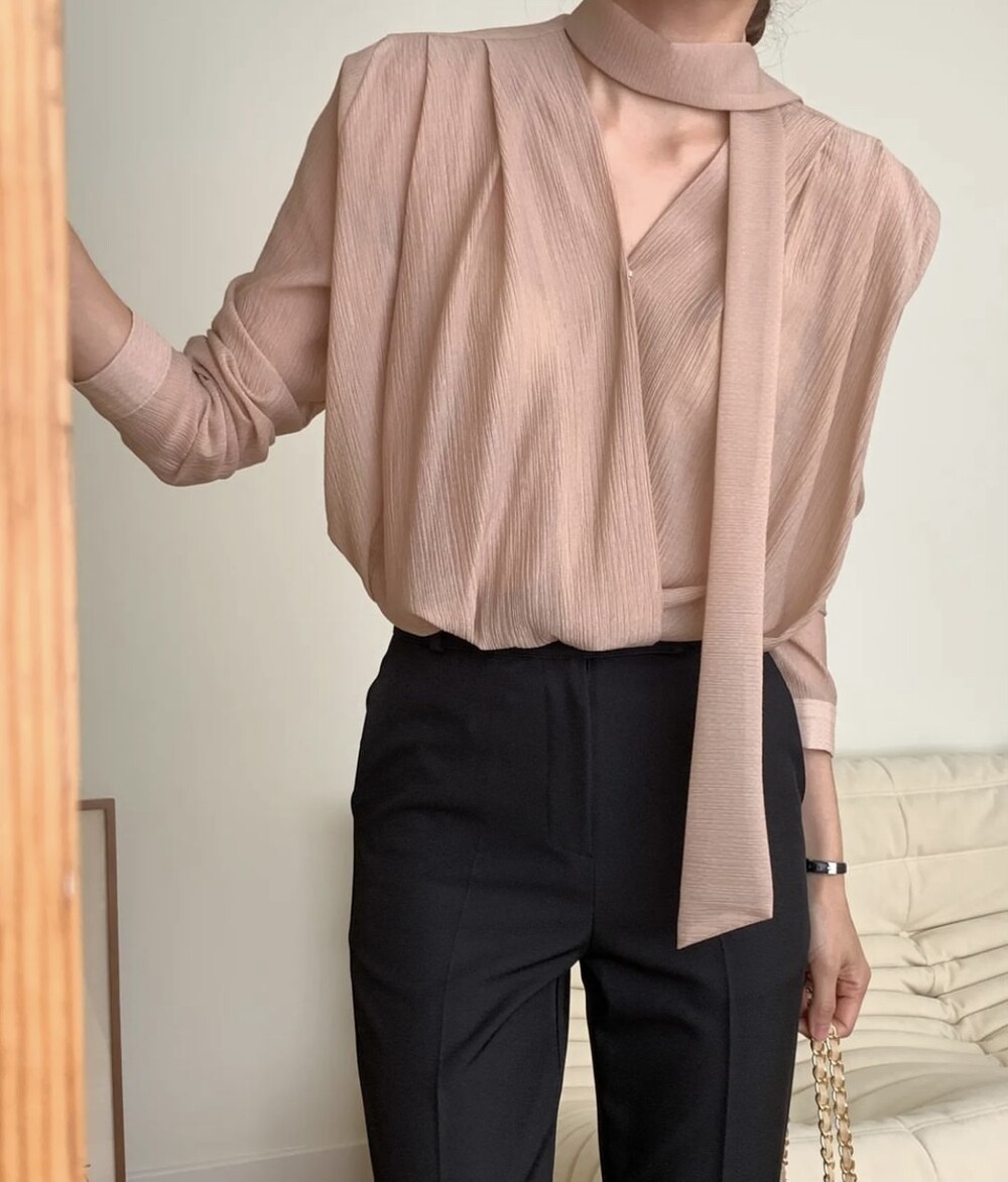 무드 랩스타일 셔링 스카프 타이 블라우스 (하객룩 결혼식 오피스룩)