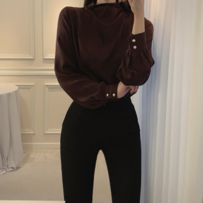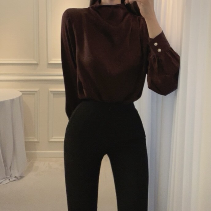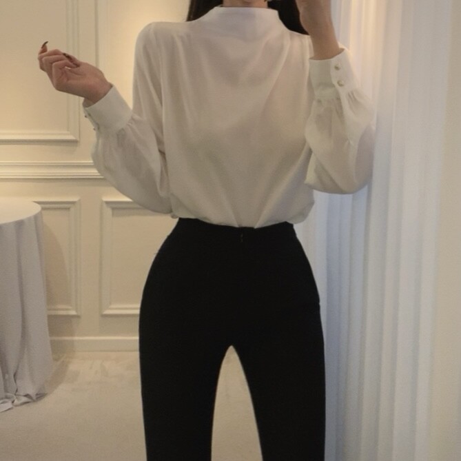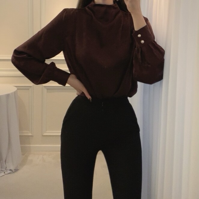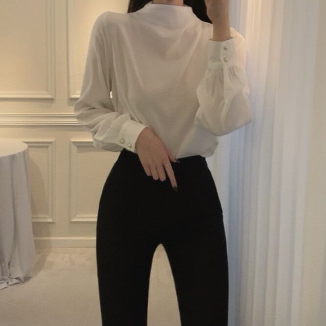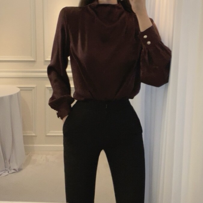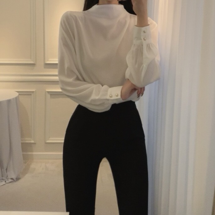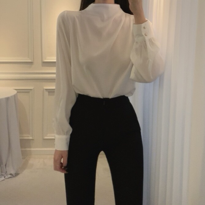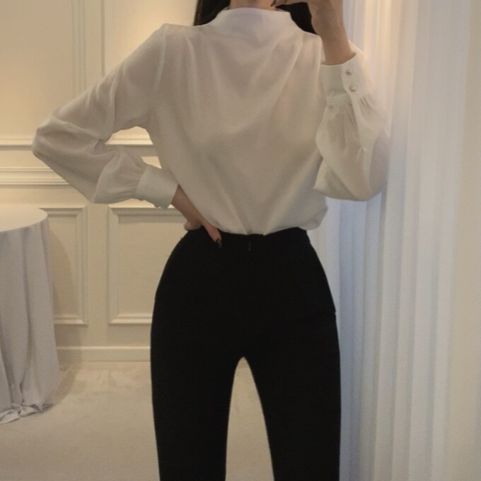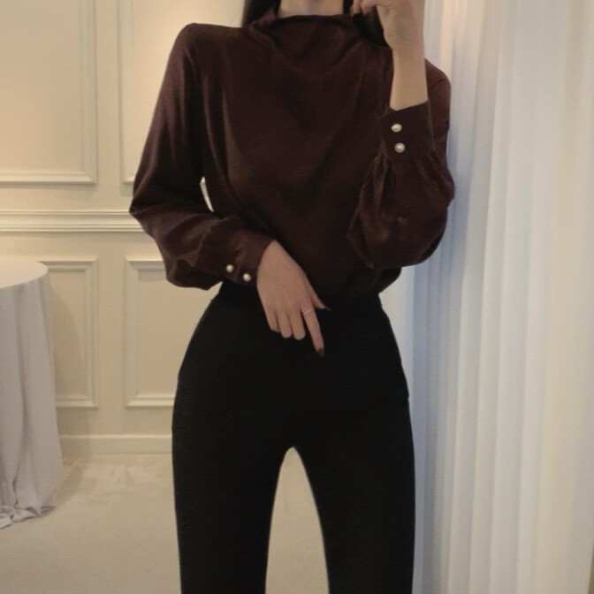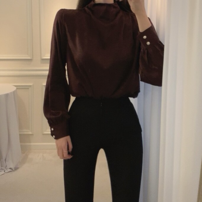 겨울 반하이넥 글로시 고급 광택 언발란스 셔링 진주 단추 소매 블라우스 (하객룩 오피스룩 럭셔리룩)