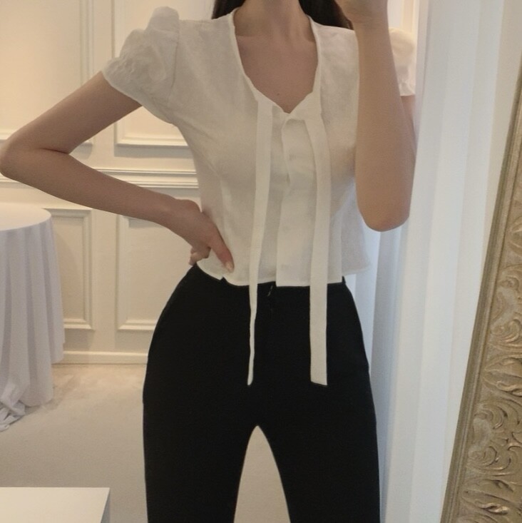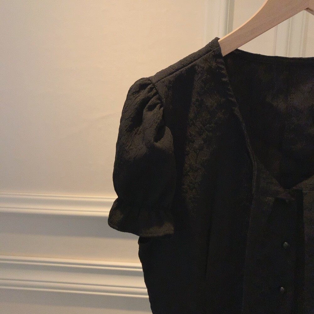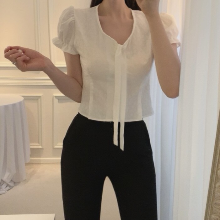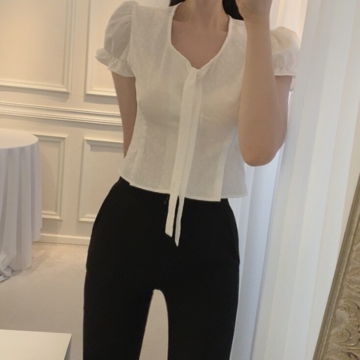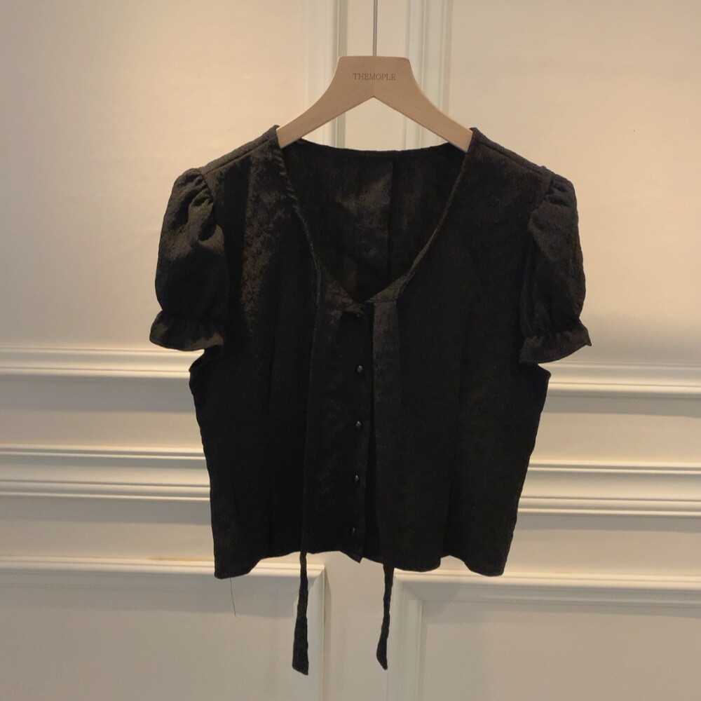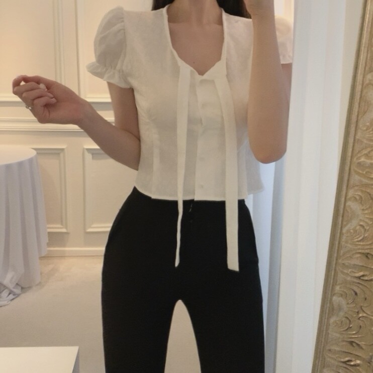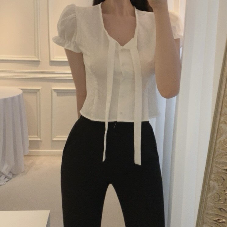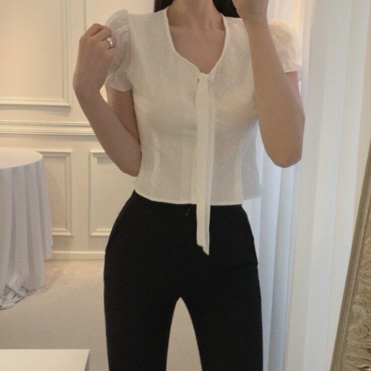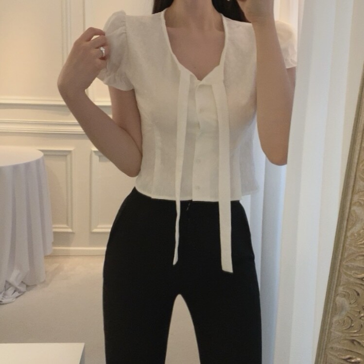 자가드 타이 퍼프 반팔 소매 블라우스 (하객룩 데이트룩 페미닌룩)