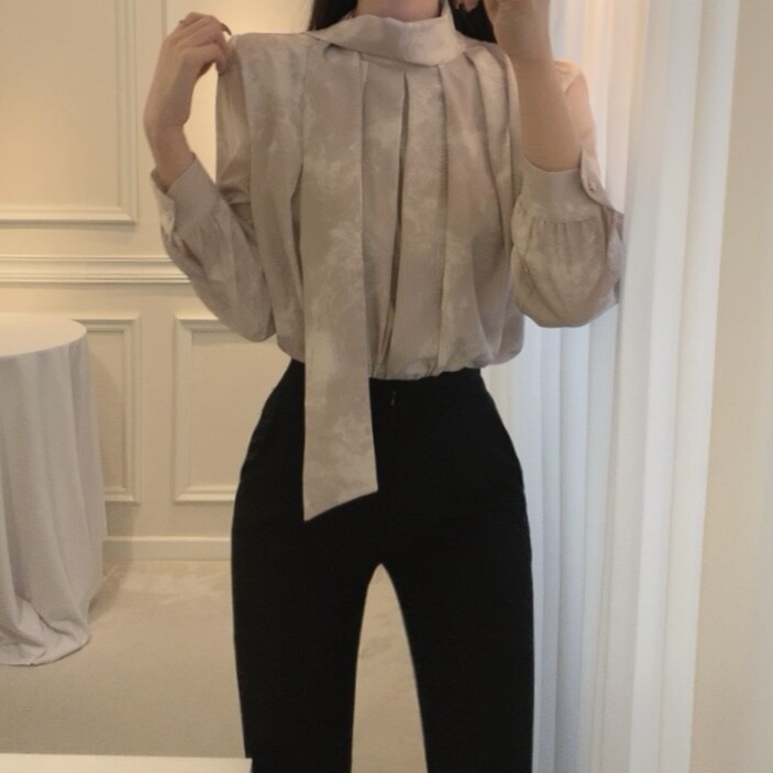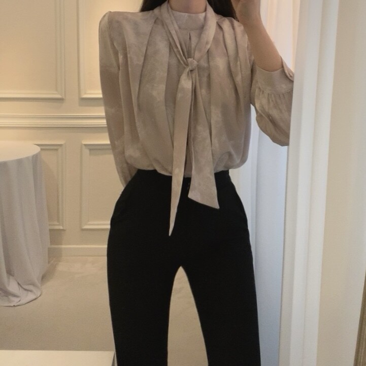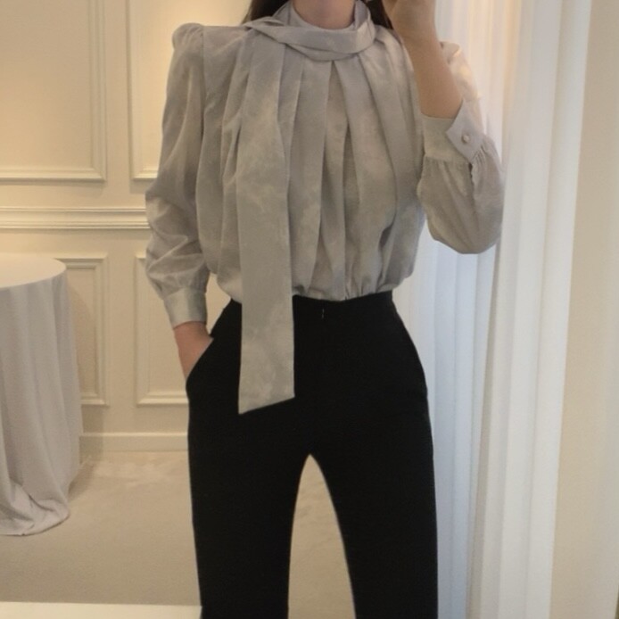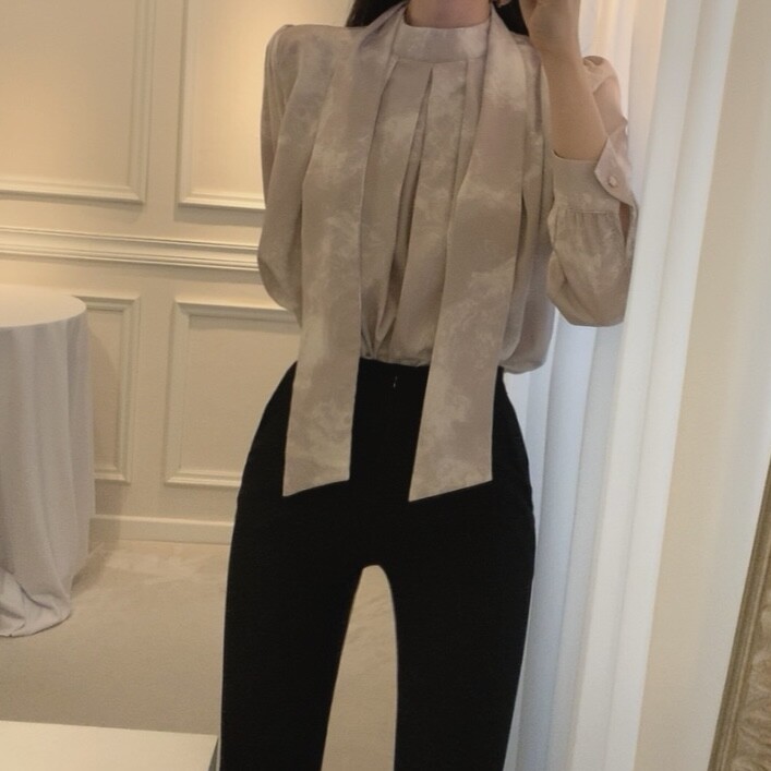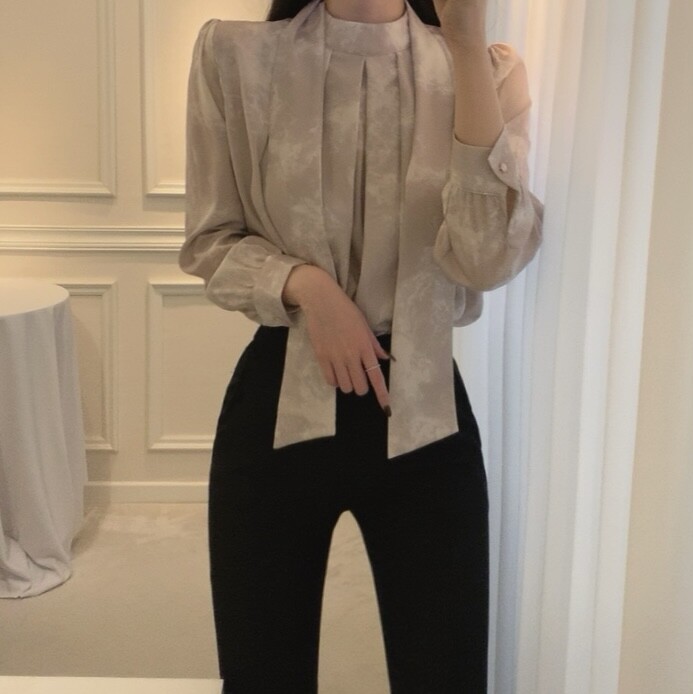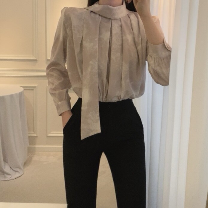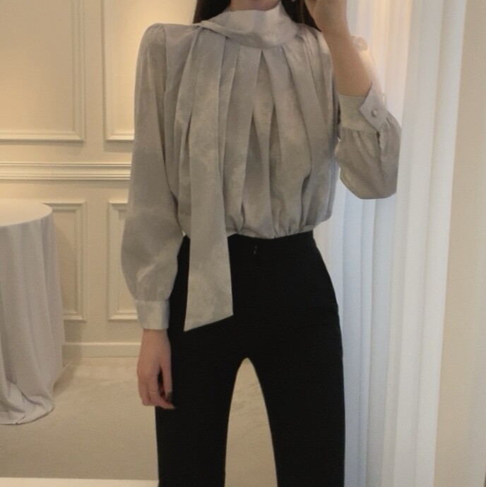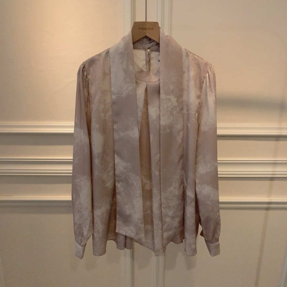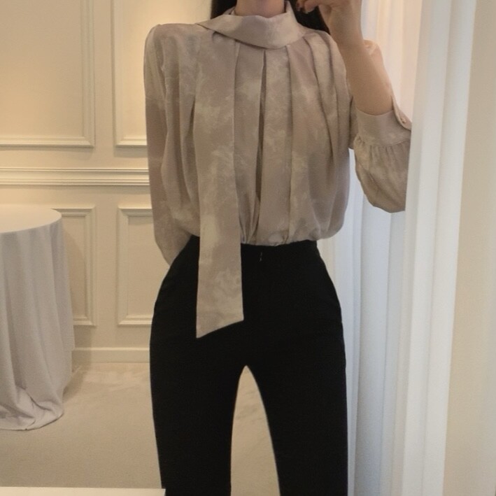 고급 나염 주름 스카프 타이 쉬폰 블라우스 (하객룩 결혼식 오피스룩)