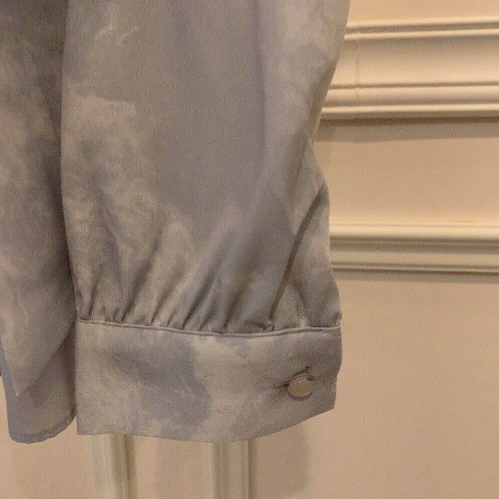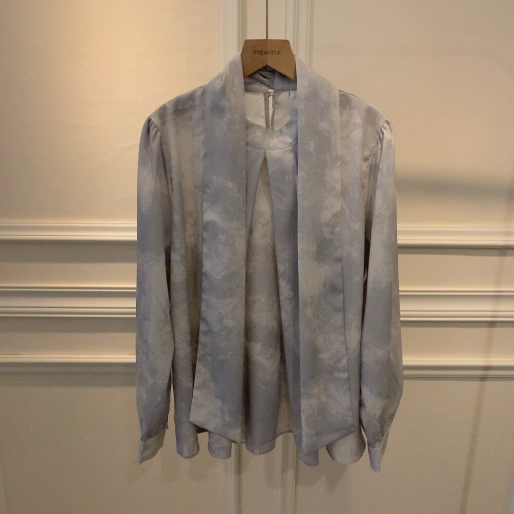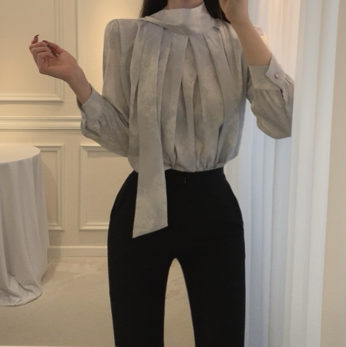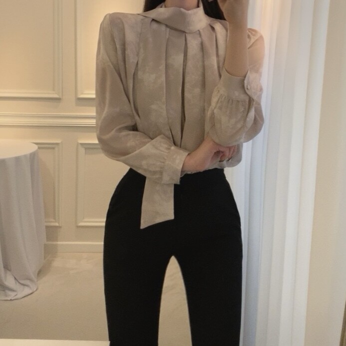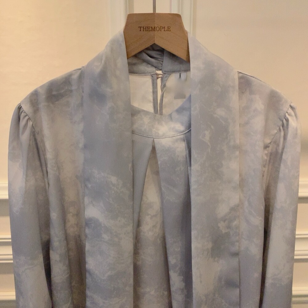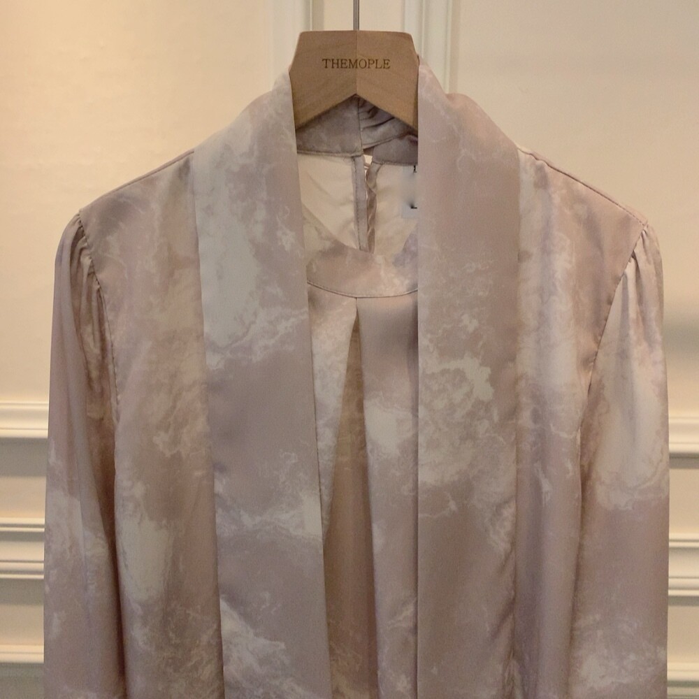 고급 나염 주름 스카프 타이 쉬폰 블라우스 (하객룩 결혼식 오피스룩)