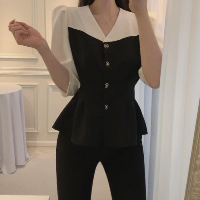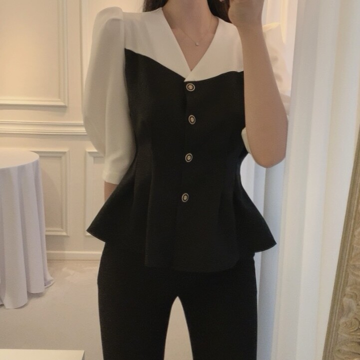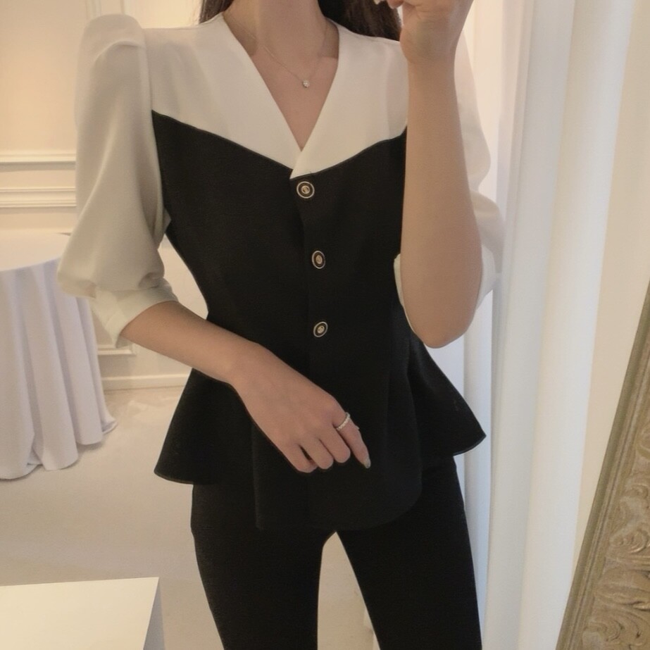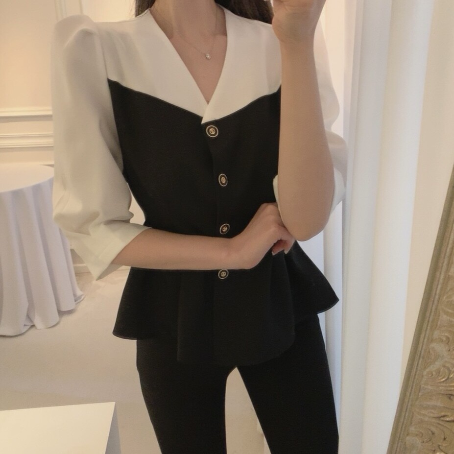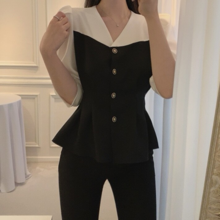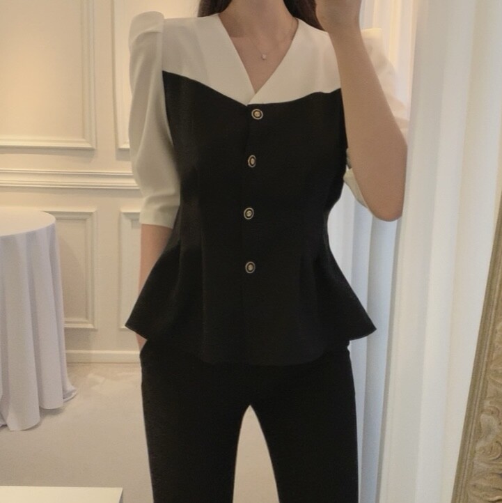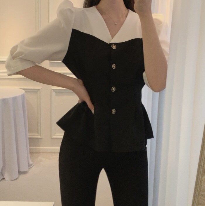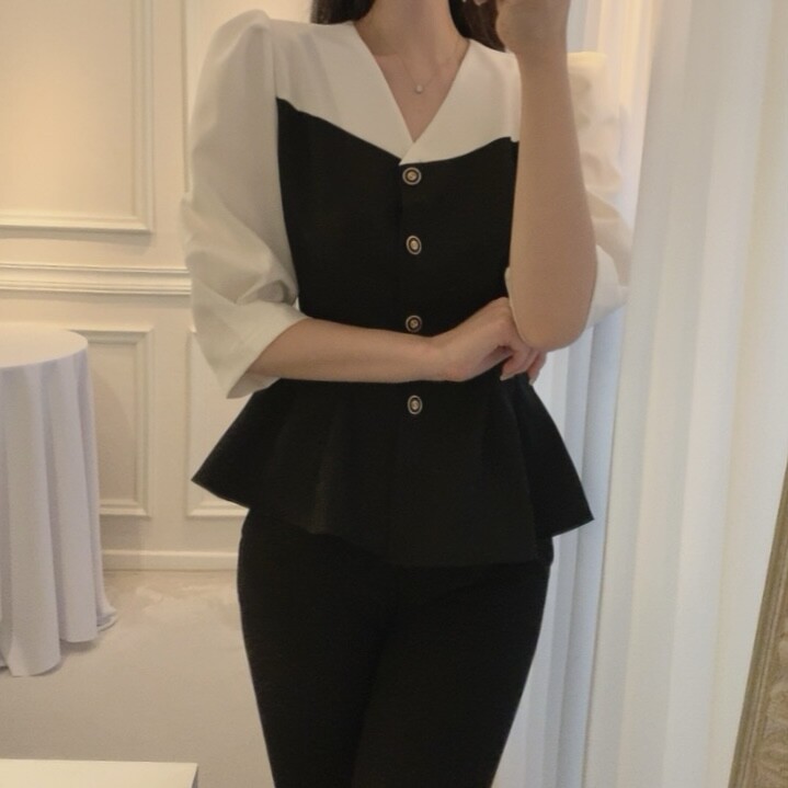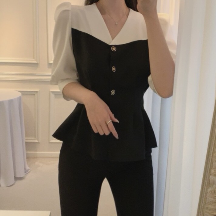 배색 골드버튼 7부 퍼프 소매 브이넥 블라우스 (하객룩 오피스룩 결혼식)