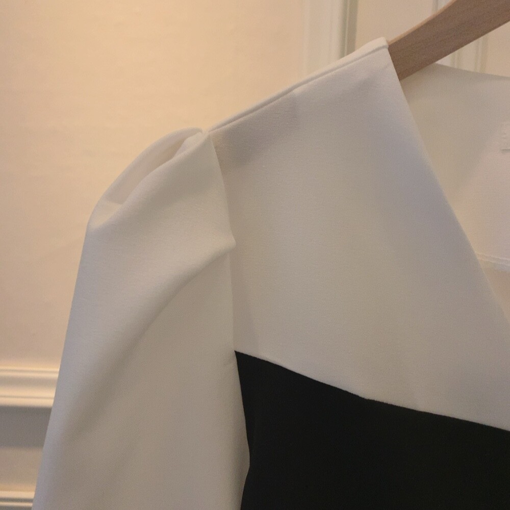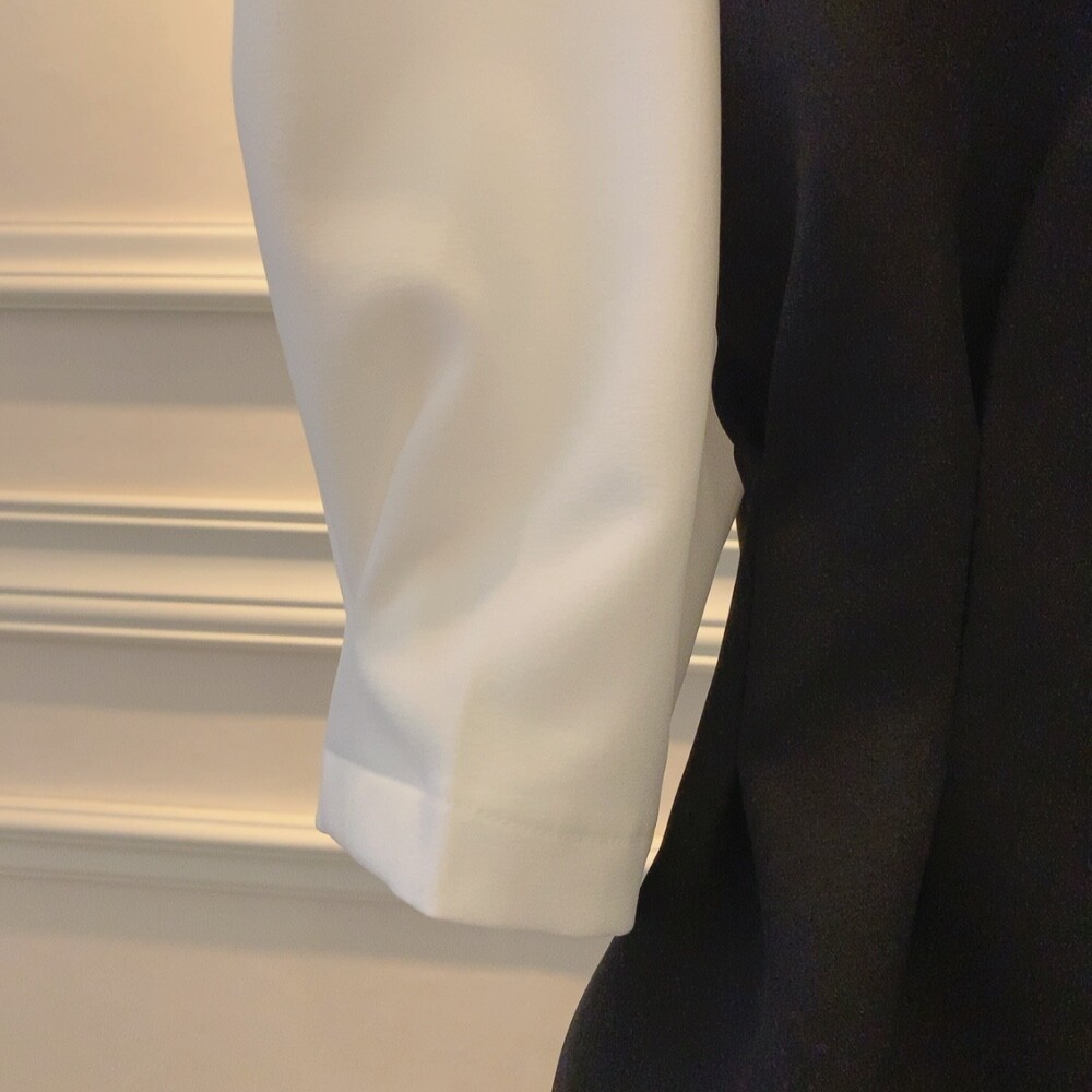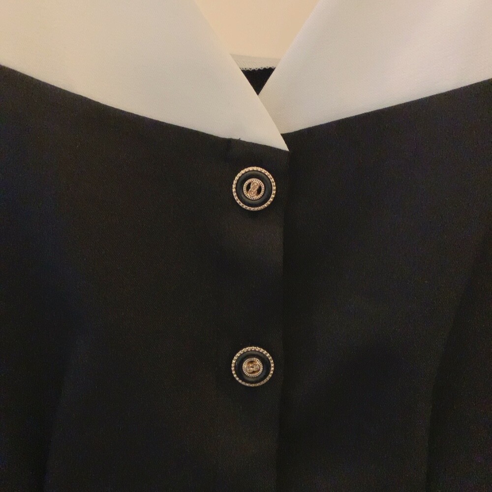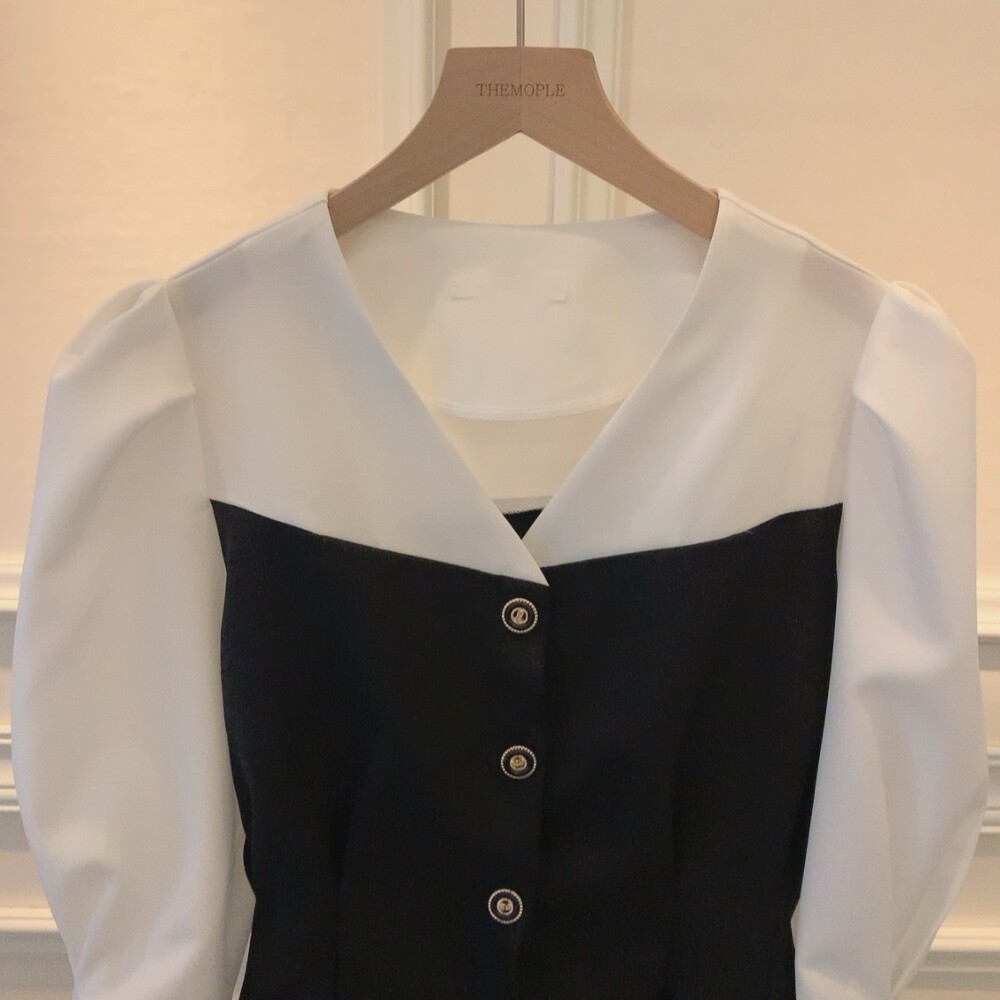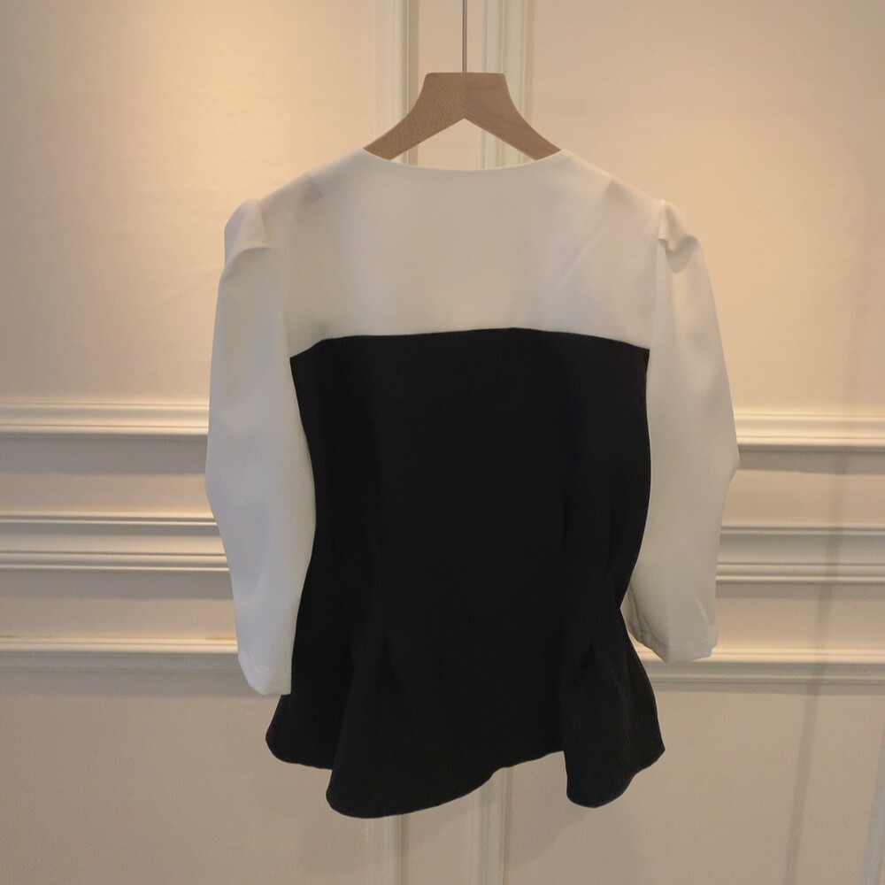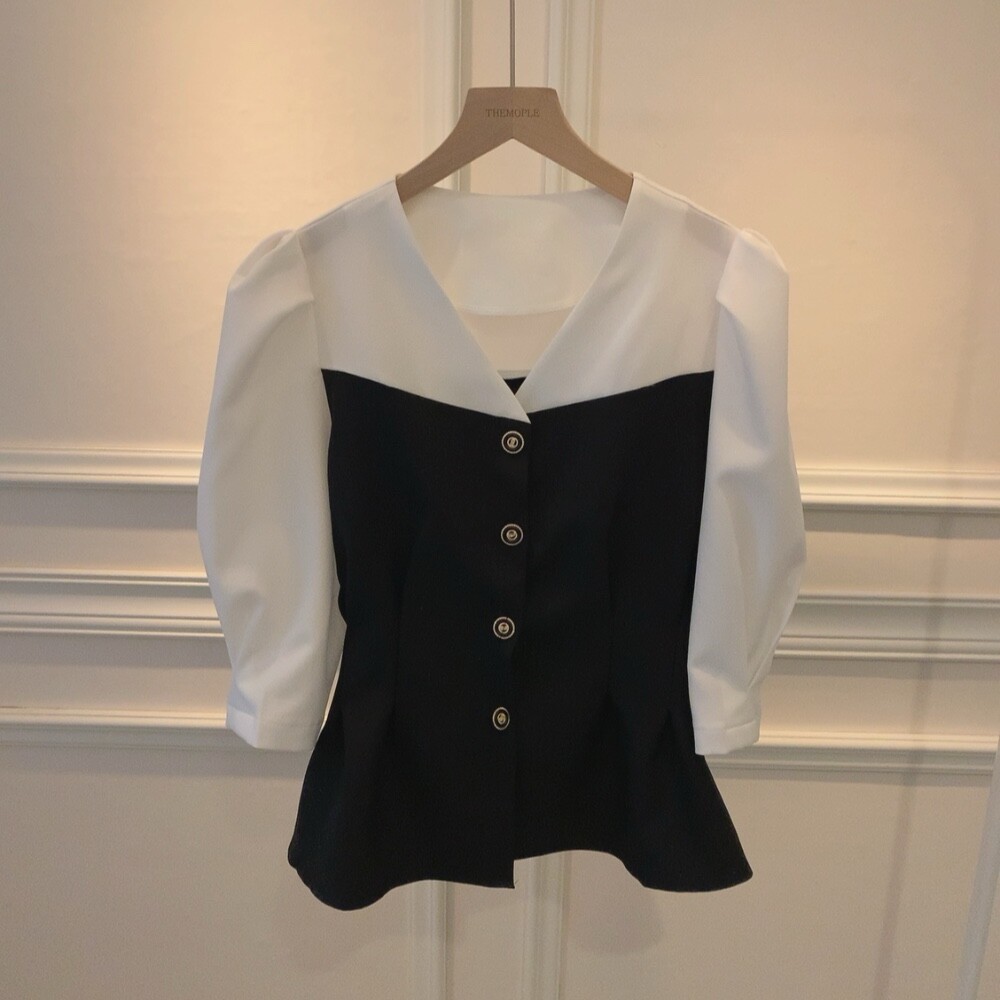배색 골드버튼 7부 퍼프 소매 브이넥 블라우스 (하객룩 오피스룩 결혼식)
