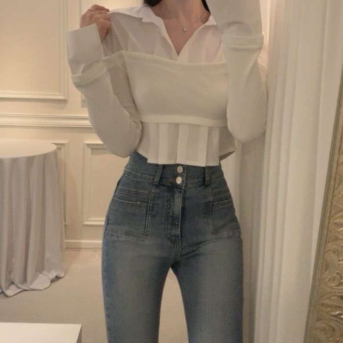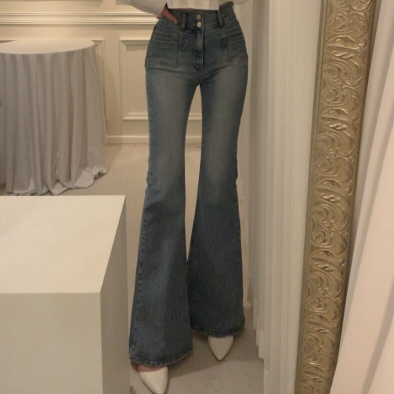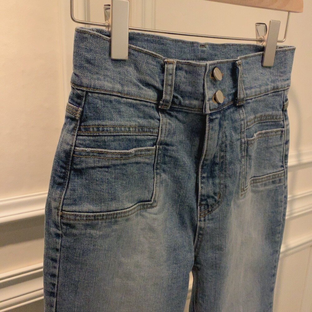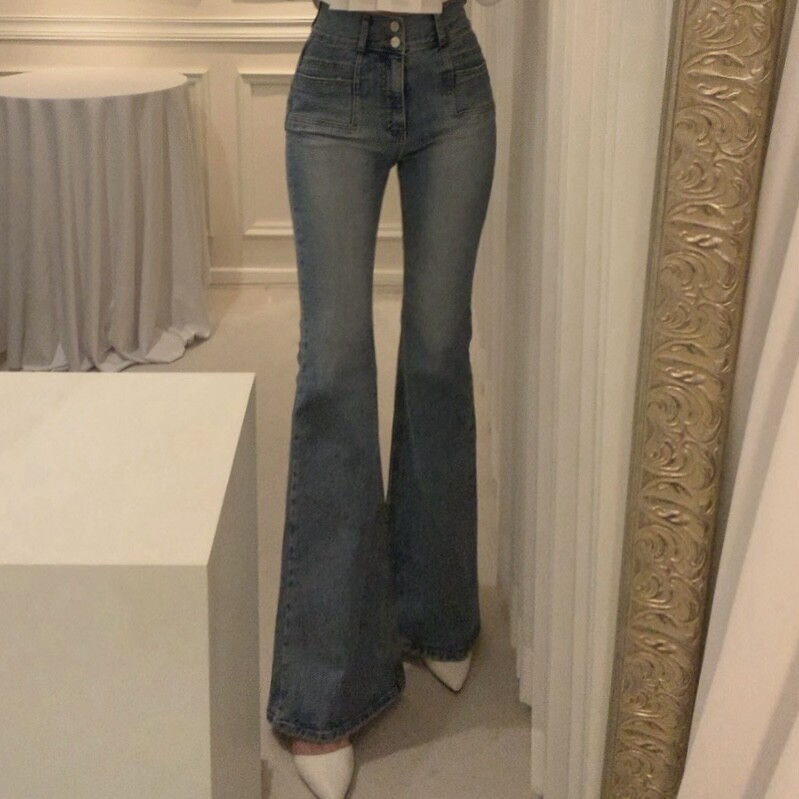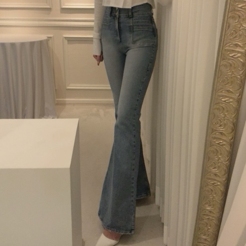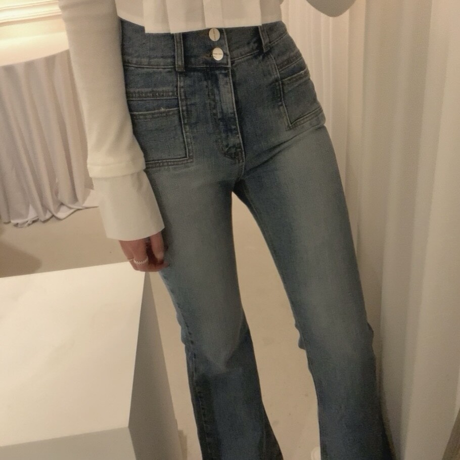 [고퀄리티] 투버튼 포켓 하이웨스트 슬림 세미부츠컷 슬릿 데님 청바지