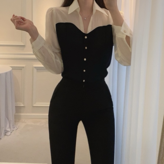 긴팔 배색 오간자 쉬폰 퍼프 소매 뷔스티에 브이넥 단추 블라우스 (하객룩 오피스룩 결혼식)