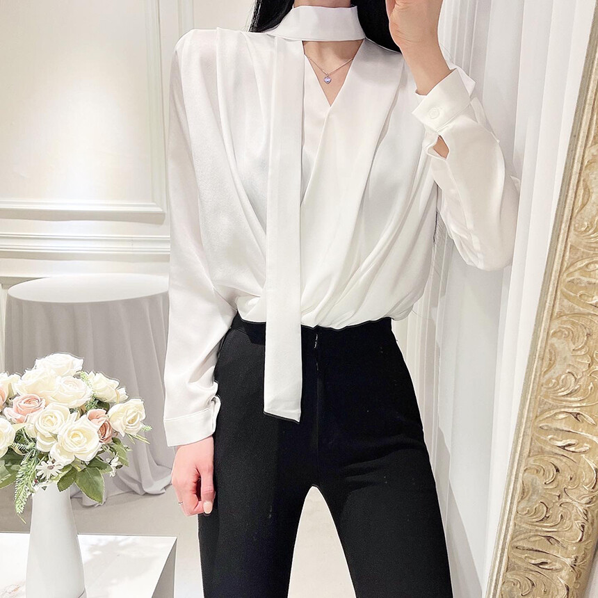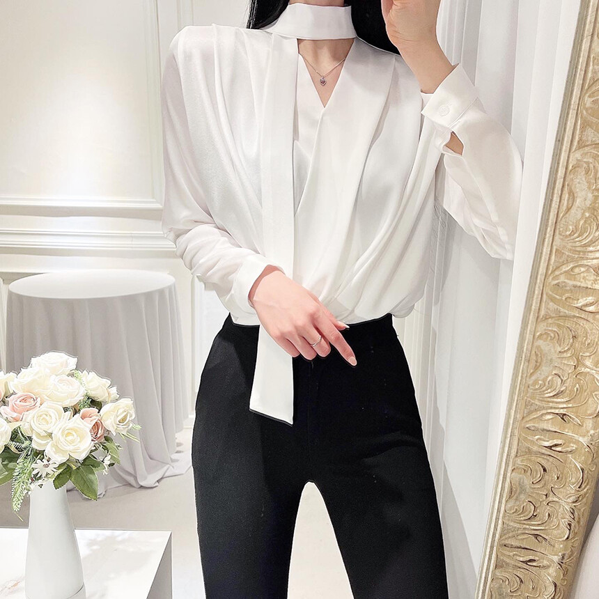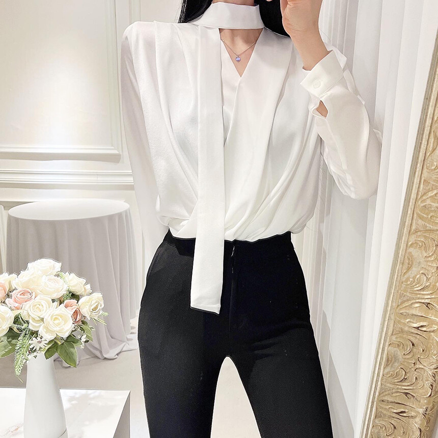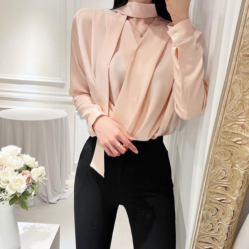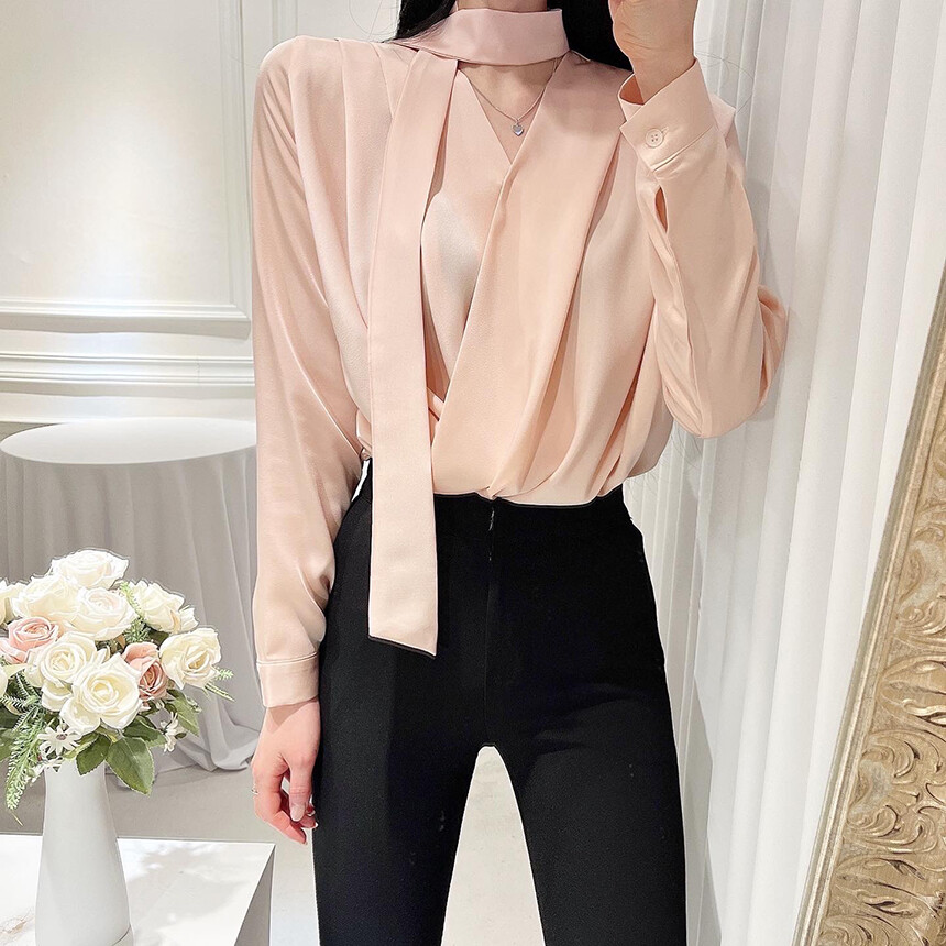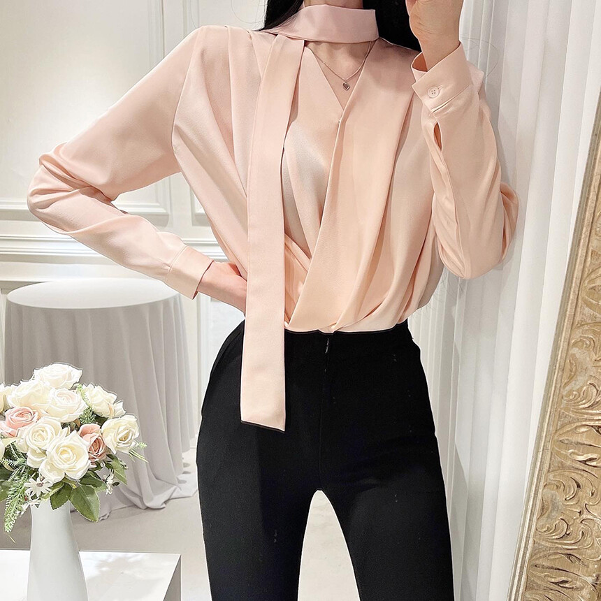타이 스카프 셔링 주름 랩스타일 블라우스 (하객룩 데이트룩 오피스룩)
