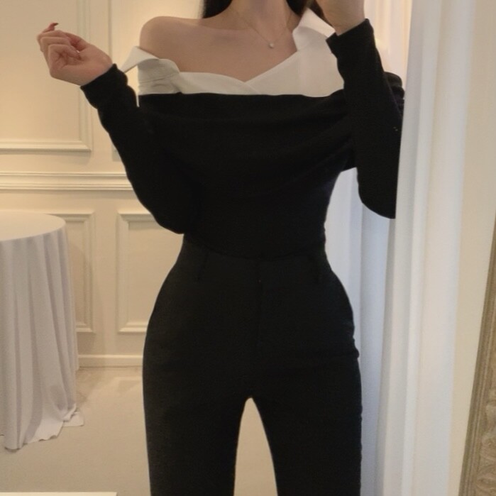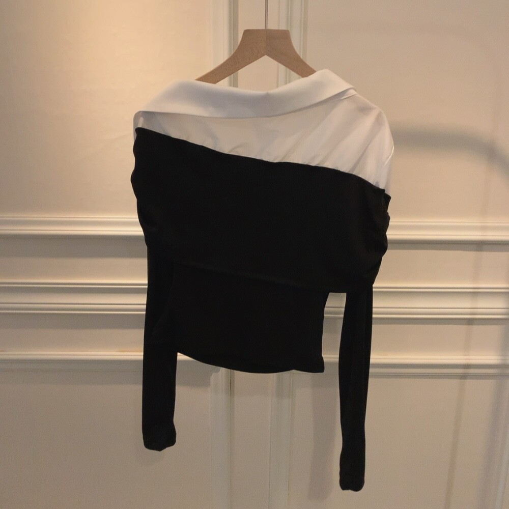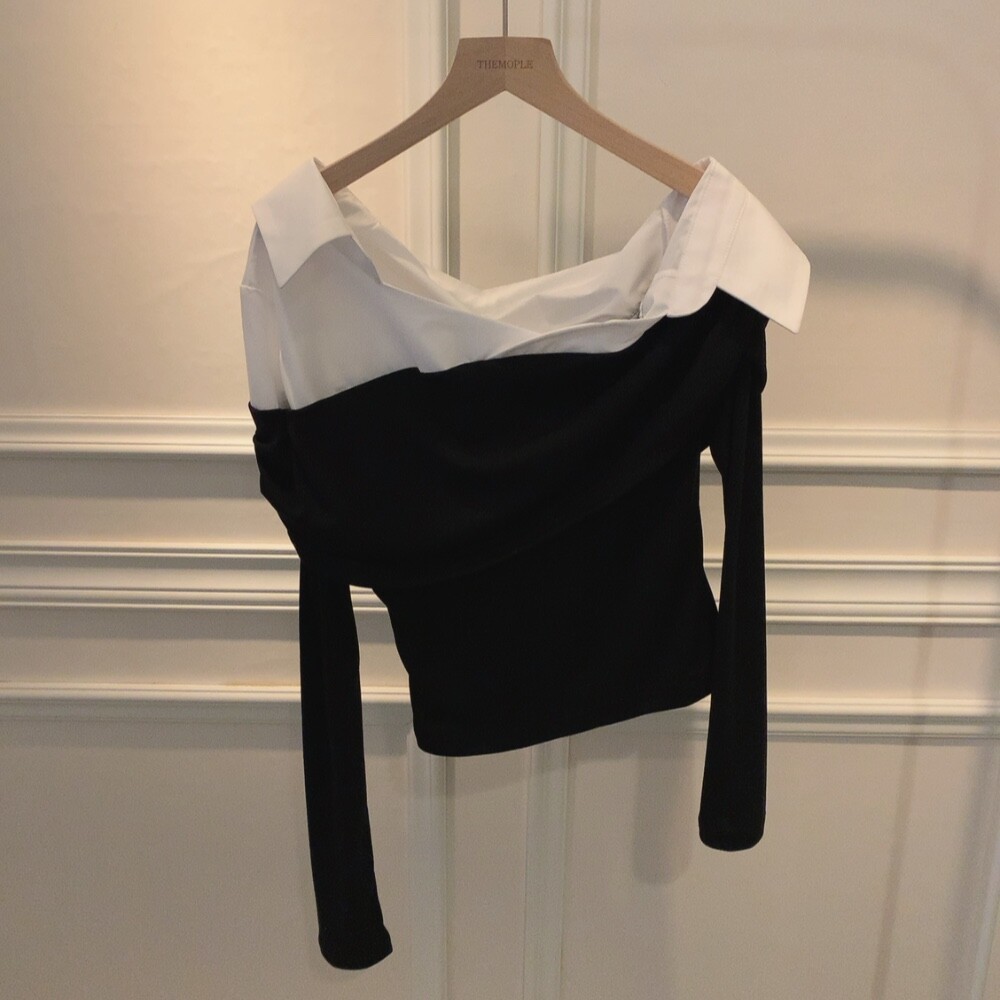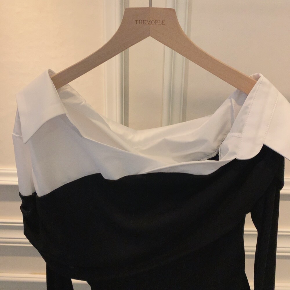 카라 셔츠 배색 언발란스 오프숄더 니트 셔링 레이어드 블라우스