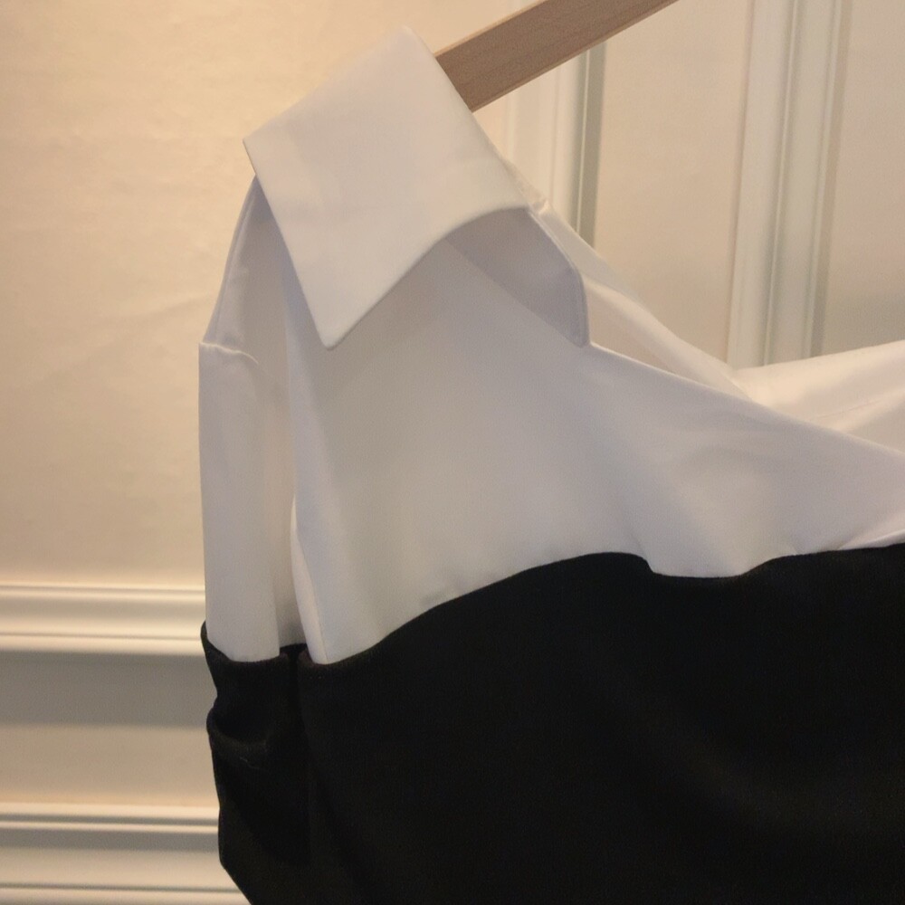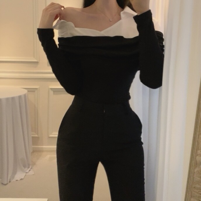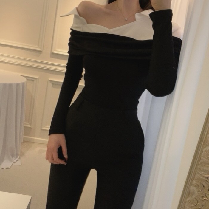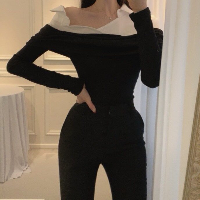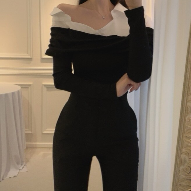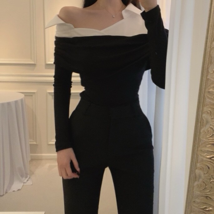 카라 셔츠 배색 언발란스 오프숄더 니트 셔링 레이어드 블라우스