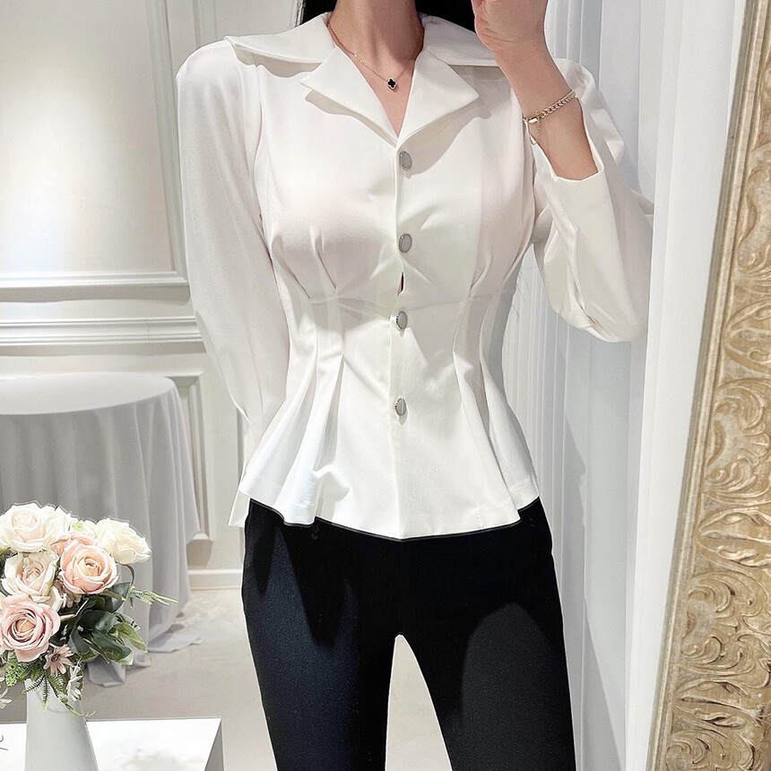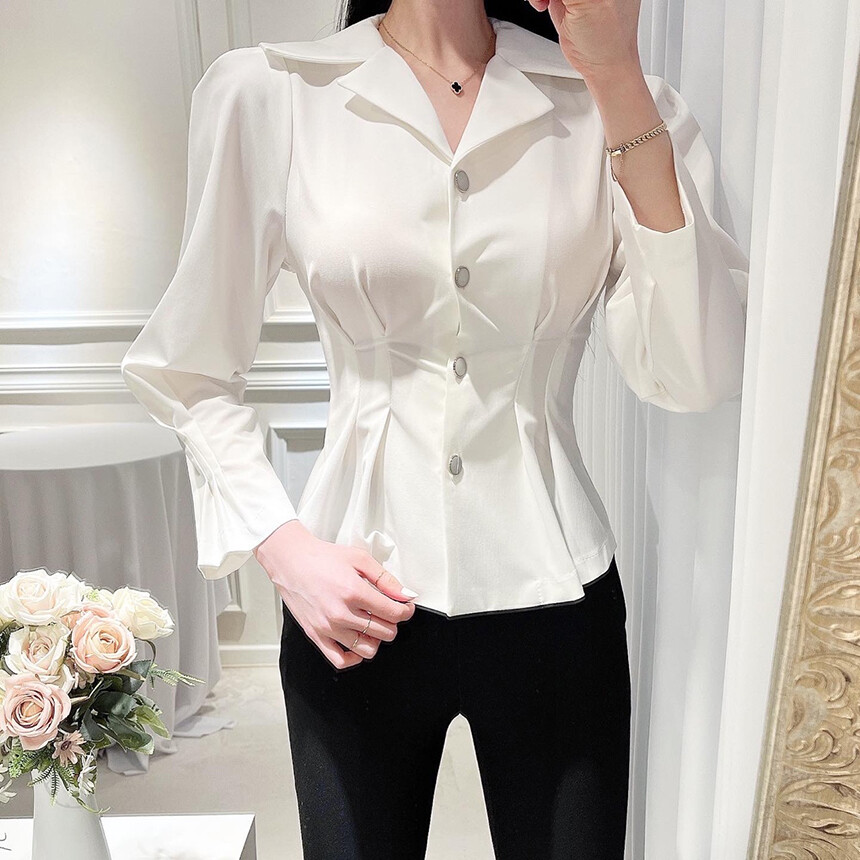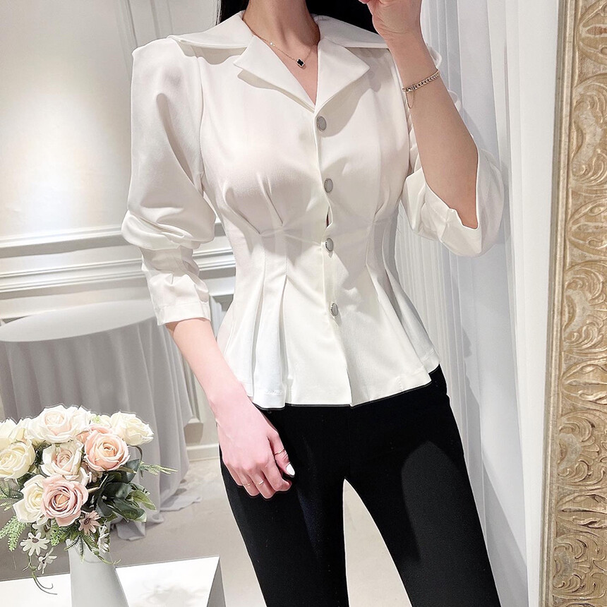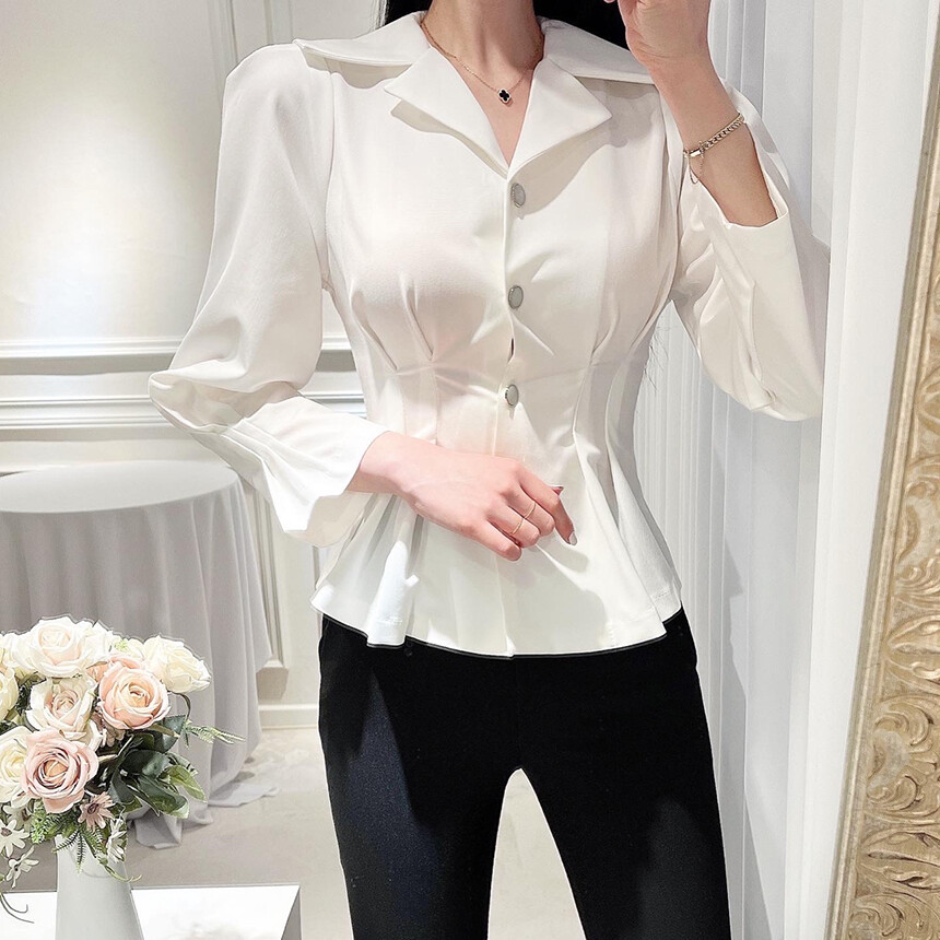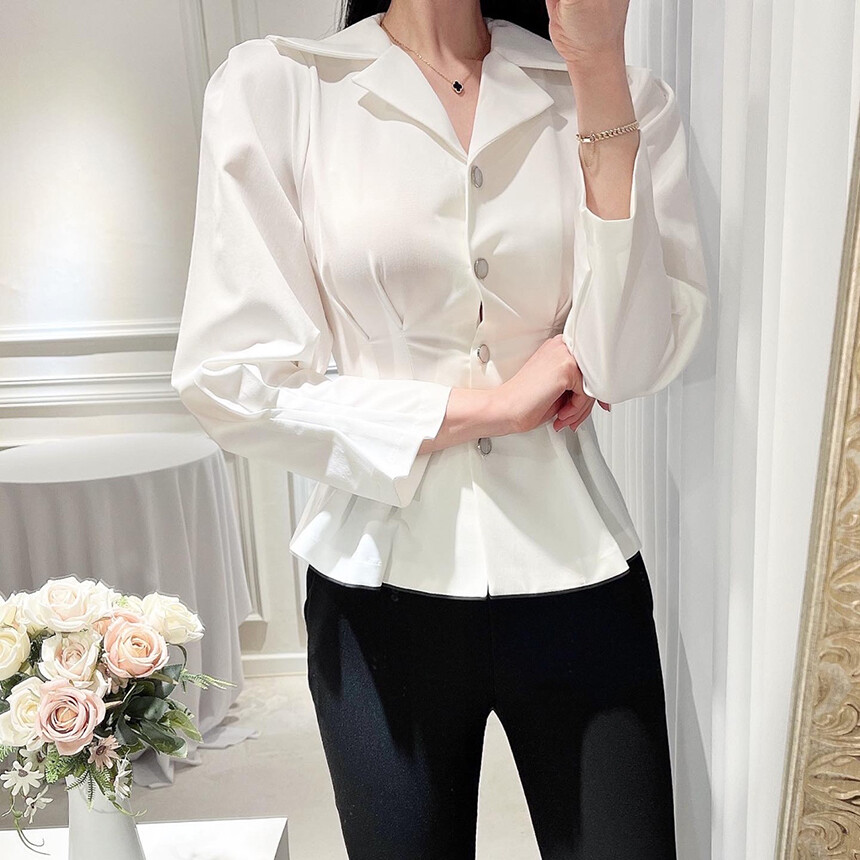 핀턱 카라 퍼프 소매 슬림핏 단추 블라우스 (하객룩 청담룩 럭셔리룩)