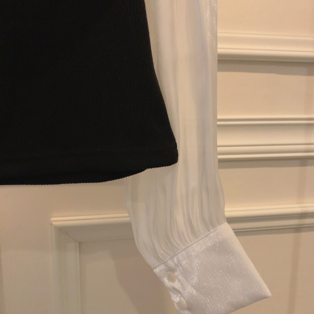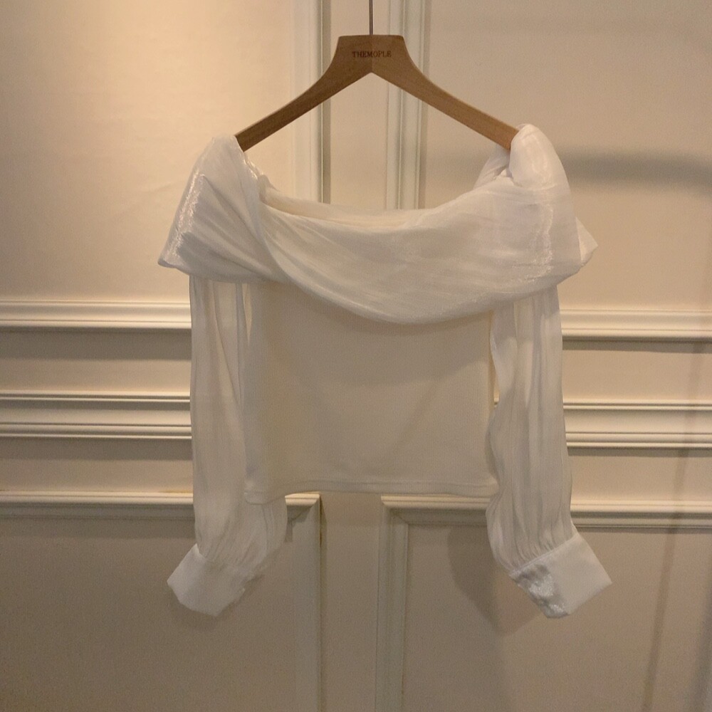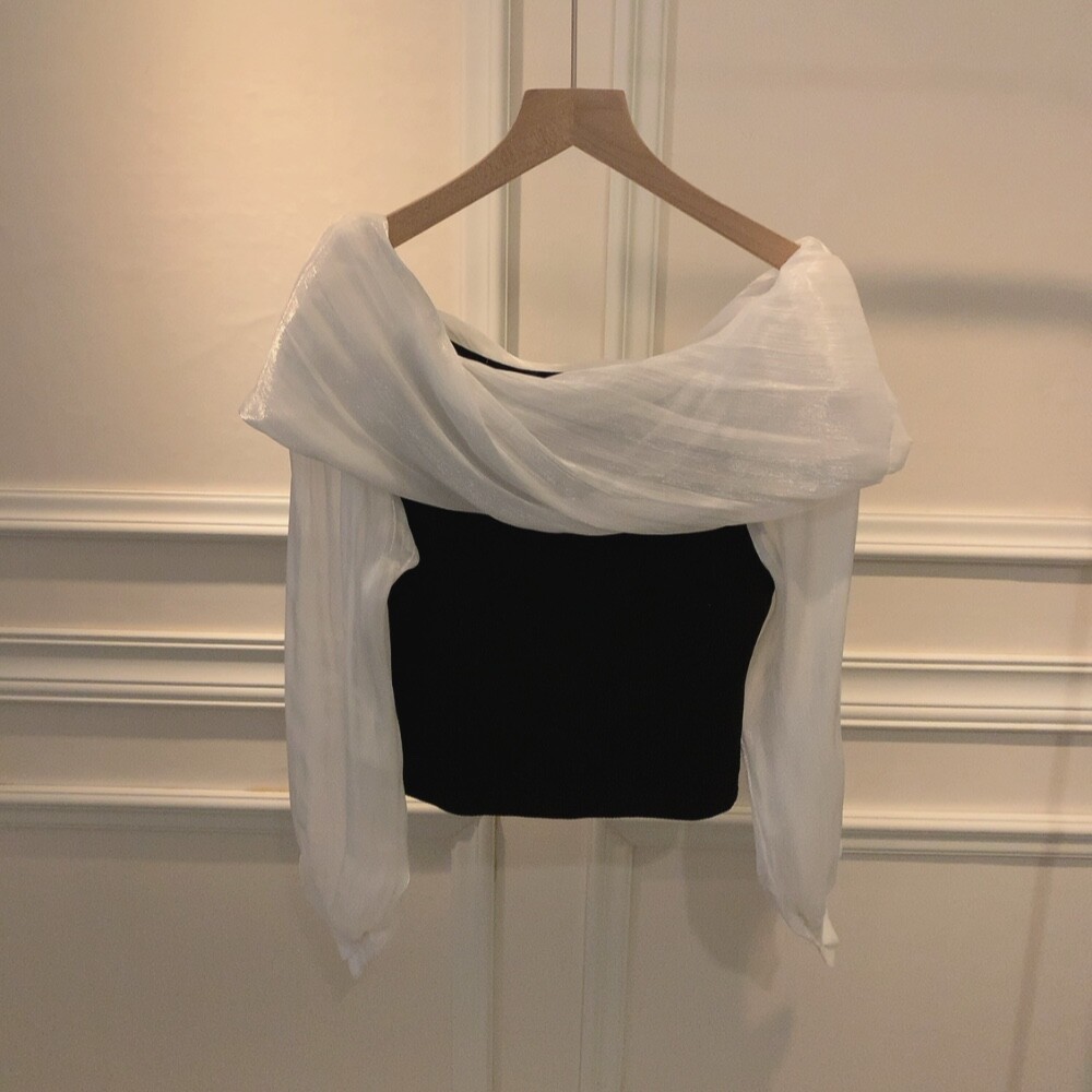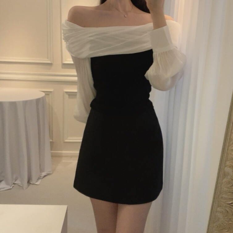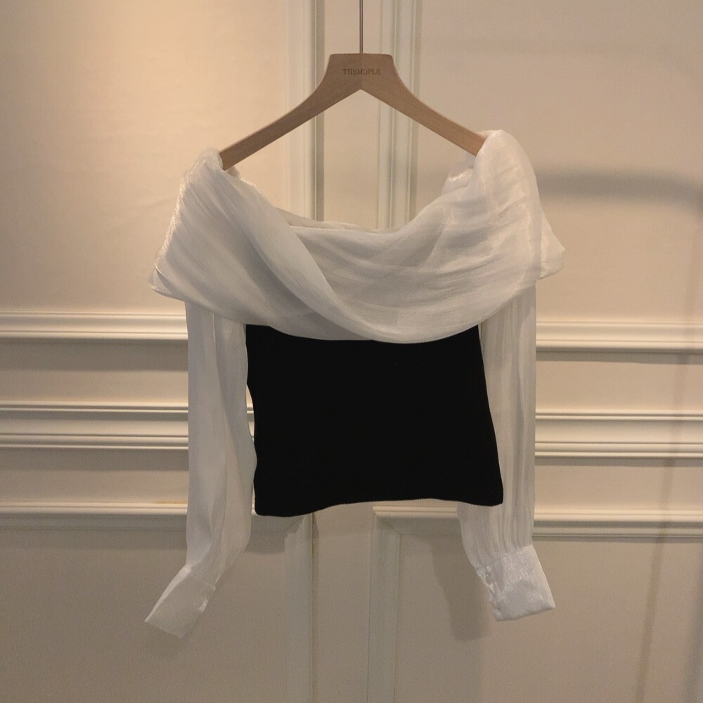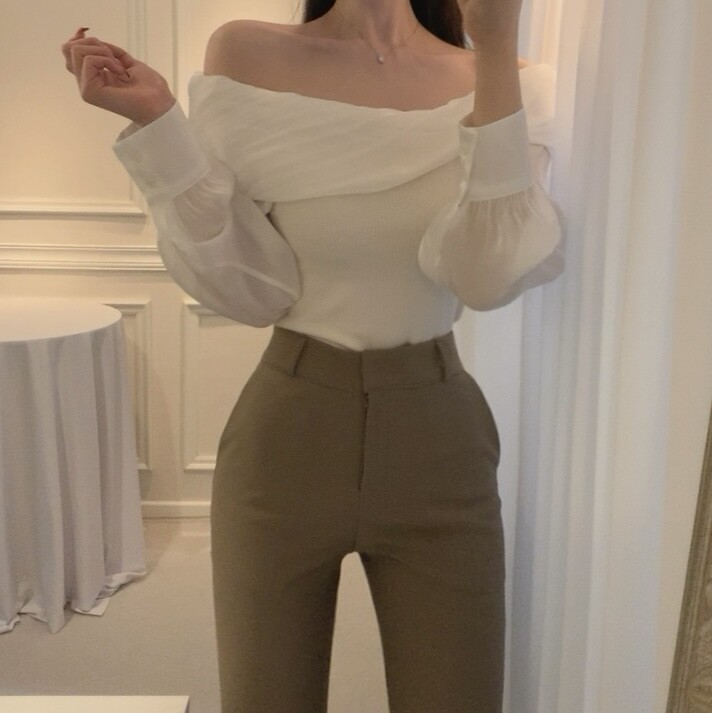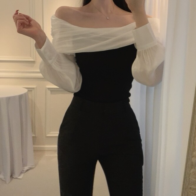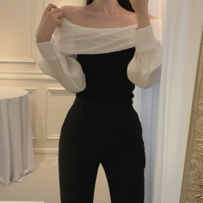 [단독*당일출고!] 오프숄더 새틴 퍼프 볼륨 소매 골지 니트 배색 블라우스