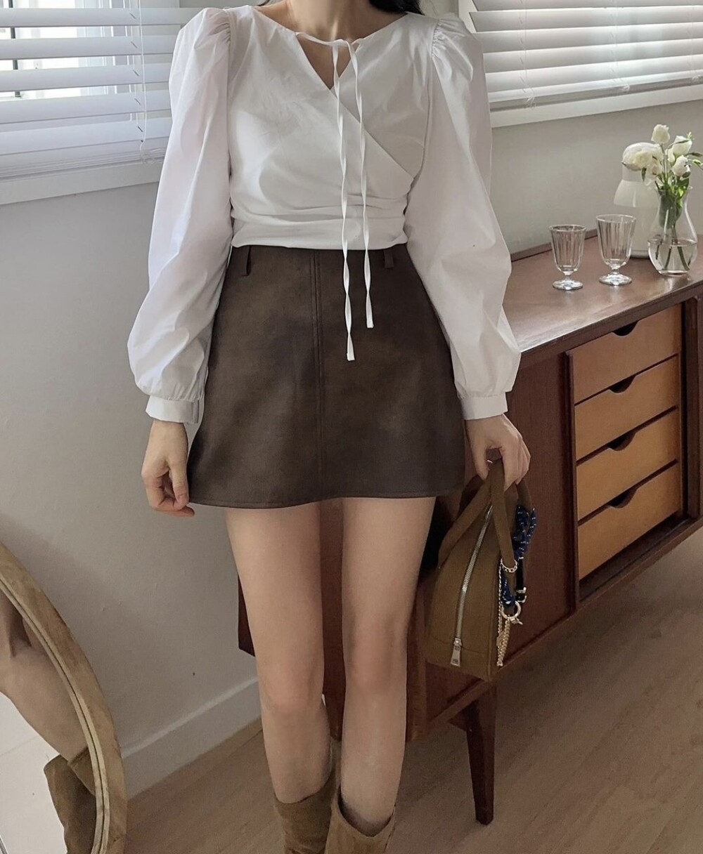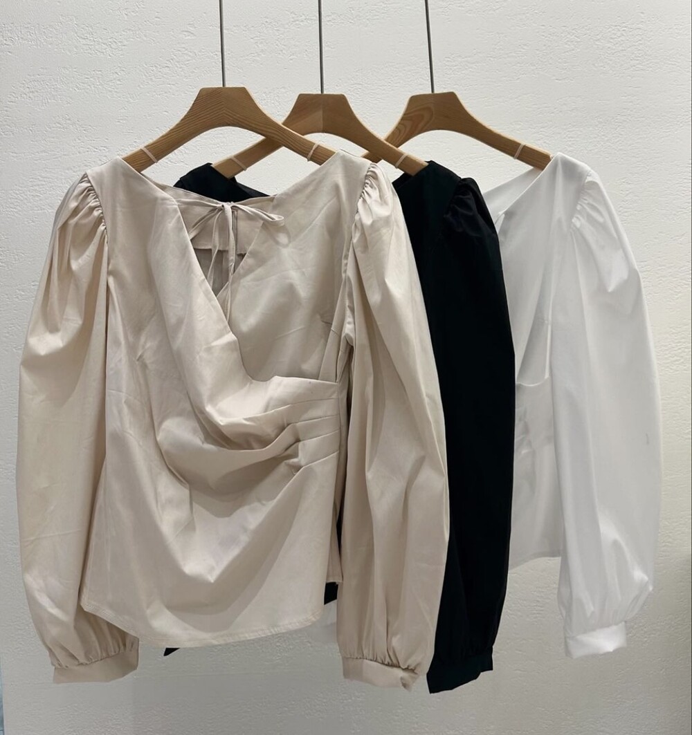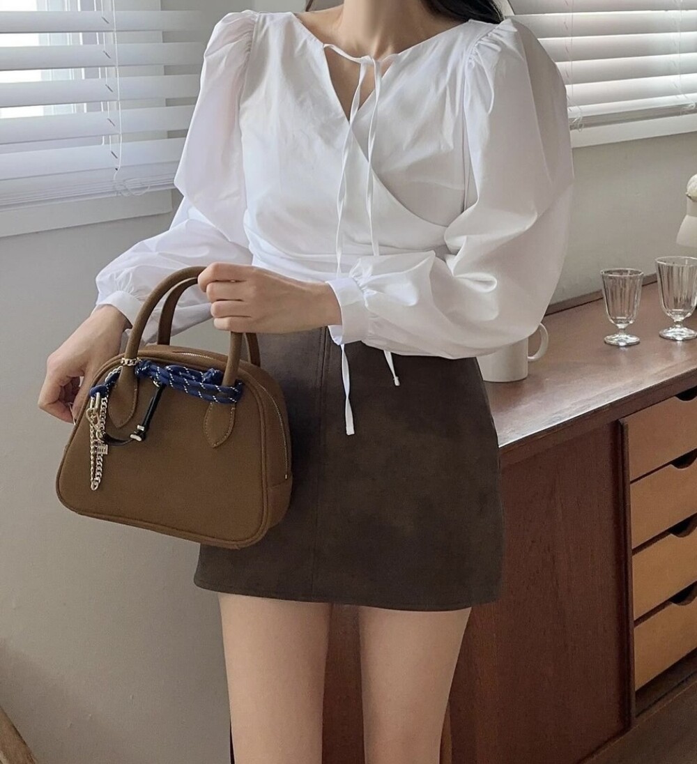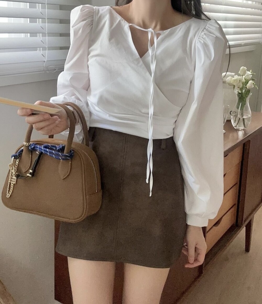 셔츠 리본 끈 퍼프 소매 핀턱 셔링 긴팔 블라우스