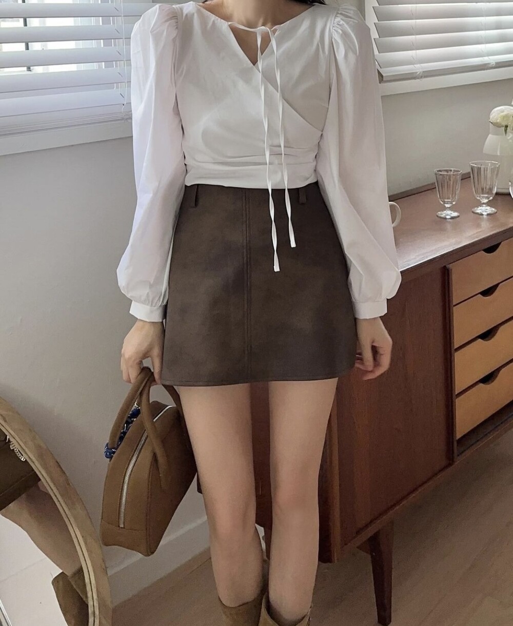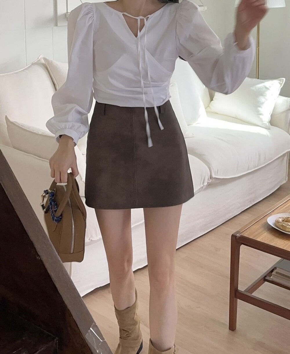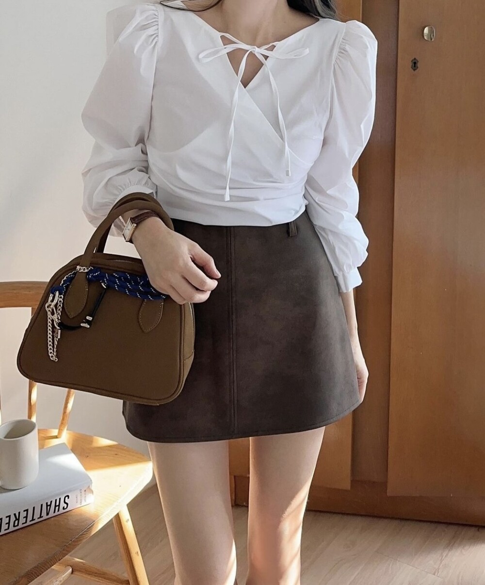 셔츠 리본 끈 퍼프 소매 핀턱 셔링 긴팔 블라우스