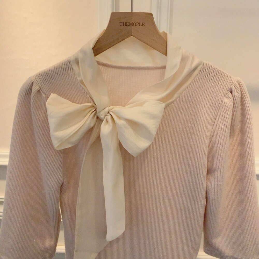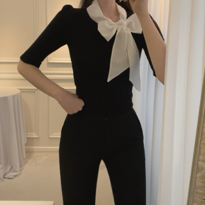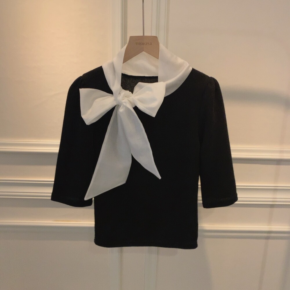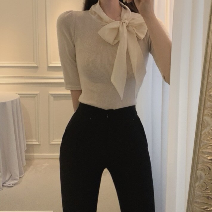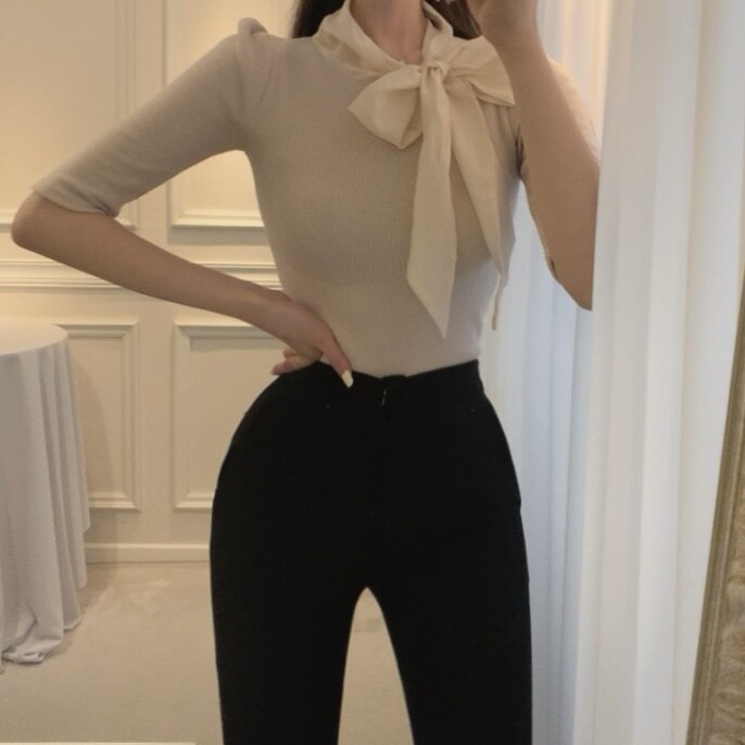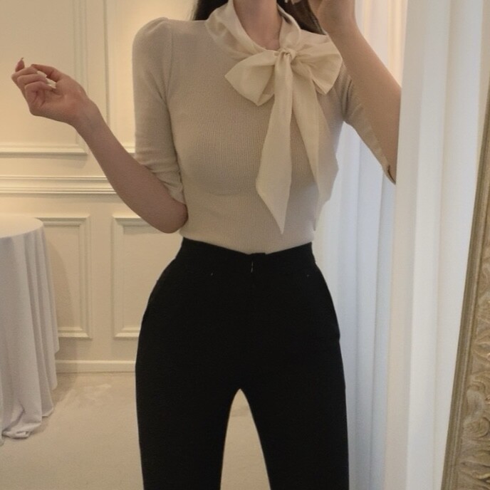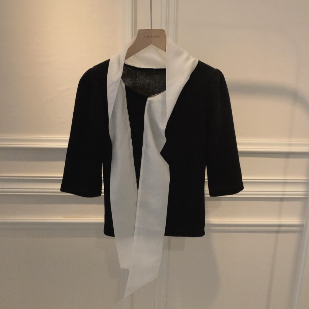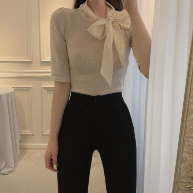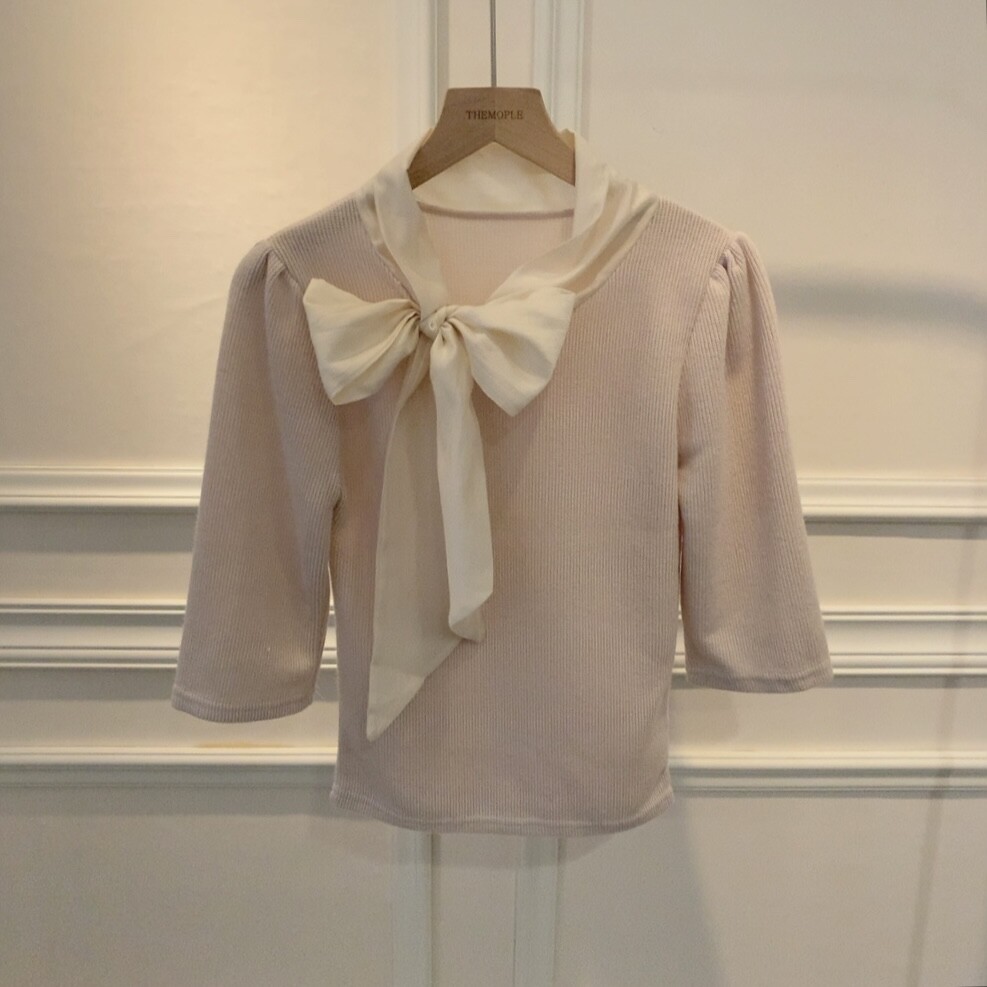 오간자 스카프 리본 타이 5부 소매 니트 블라우스 티셔츠