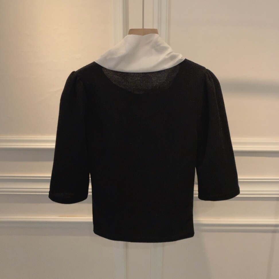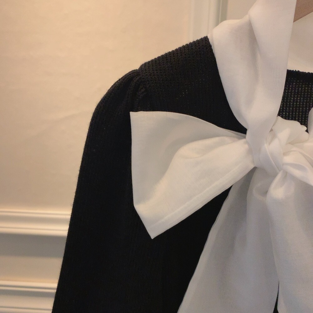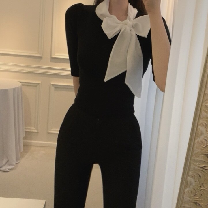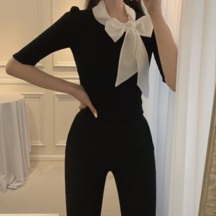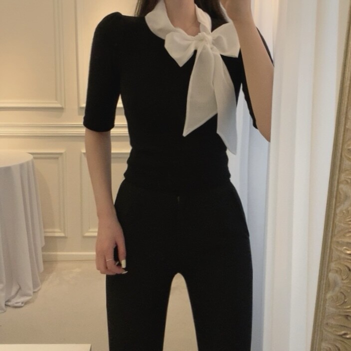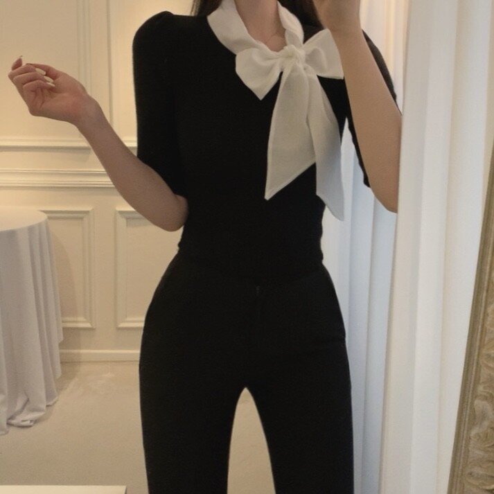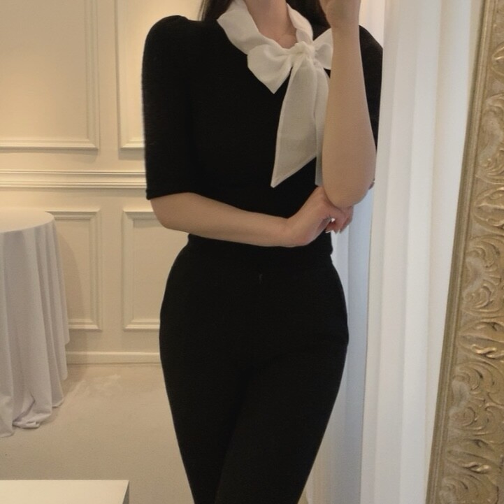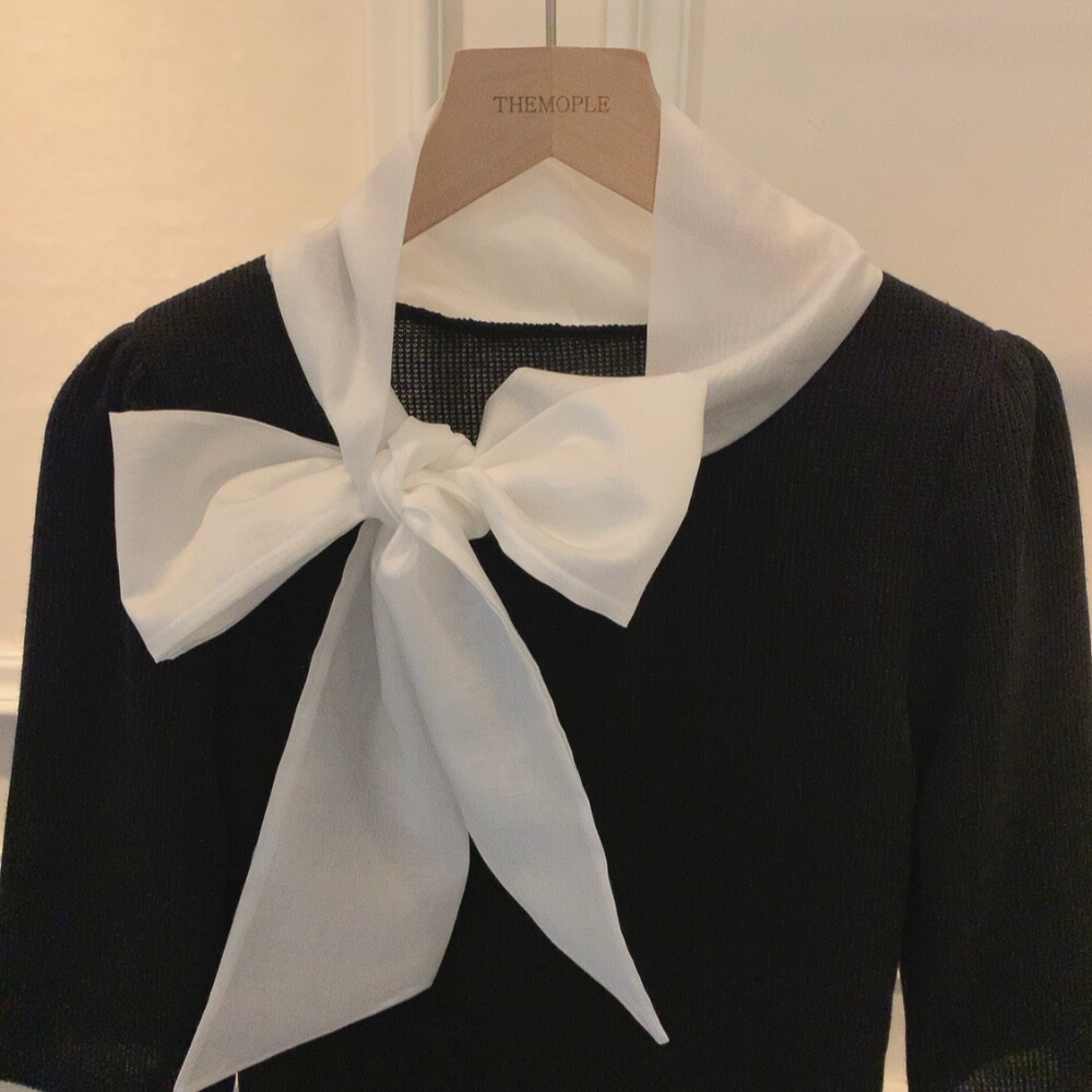 오간자 스카프 리본 타이 5부 소매 니트 블라우스 티셔츠