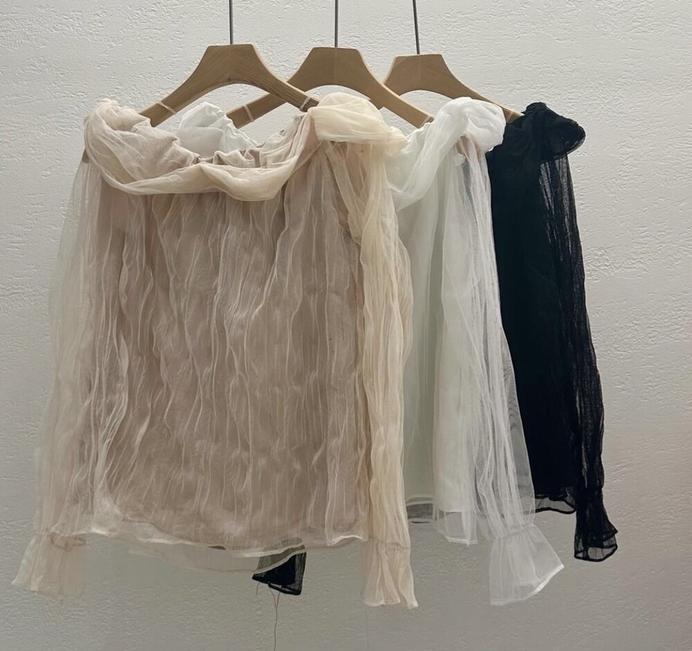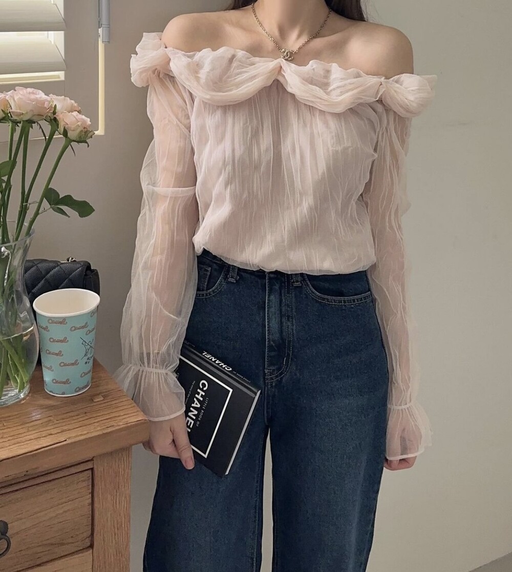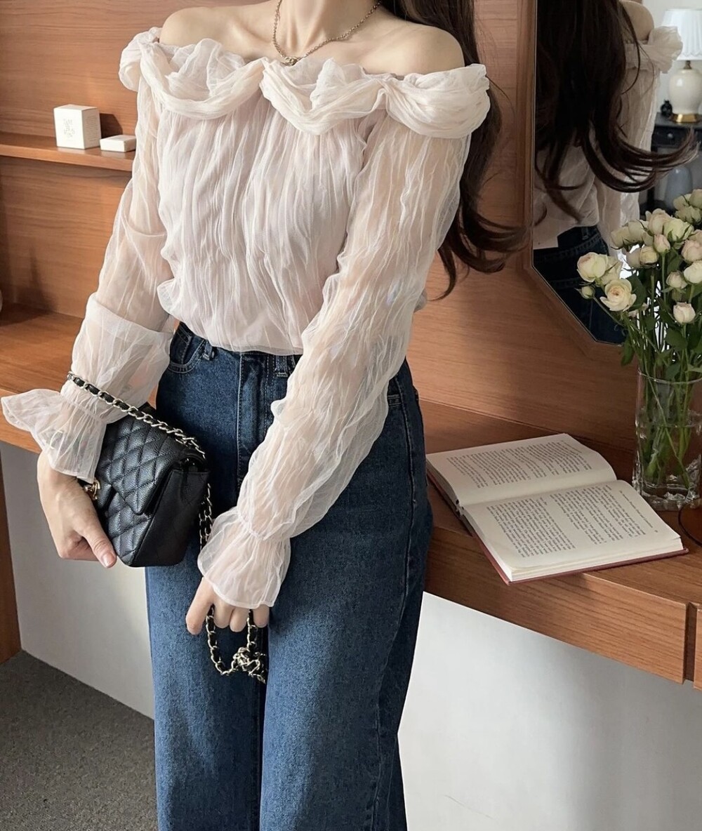 레이스 시스루 물결 꼬임 오프숄더 블라우스 (연말룩 파티룩 데이트룩)