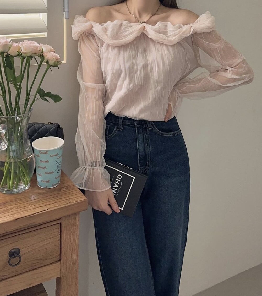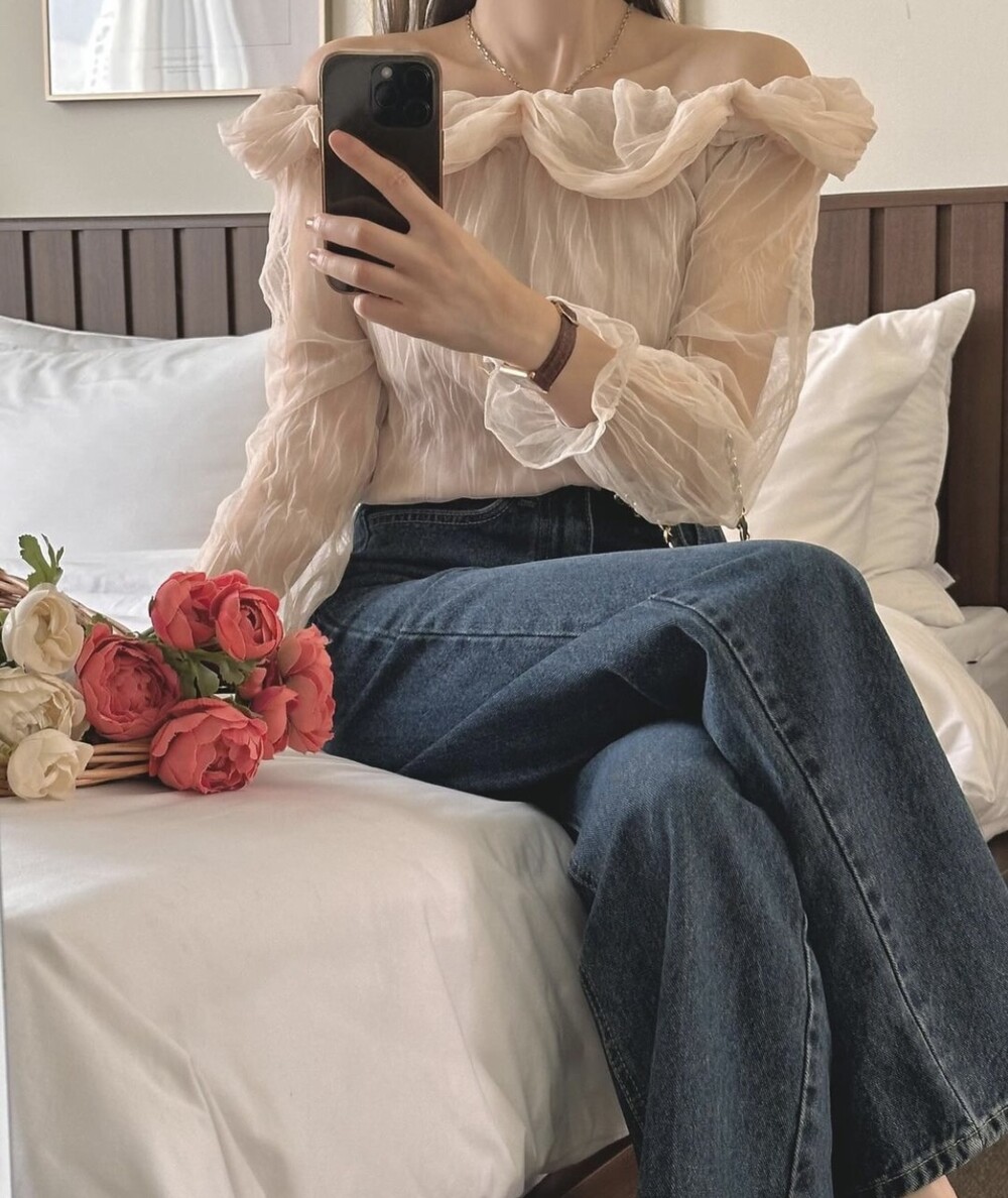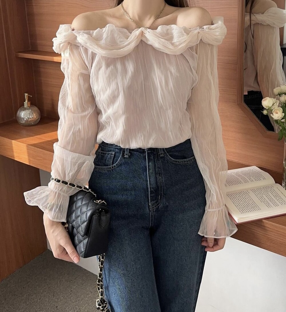 레이스 시스루 물결 꼬임 오프숄더 블라우스 (연말룩 파티룩 데이트룩)