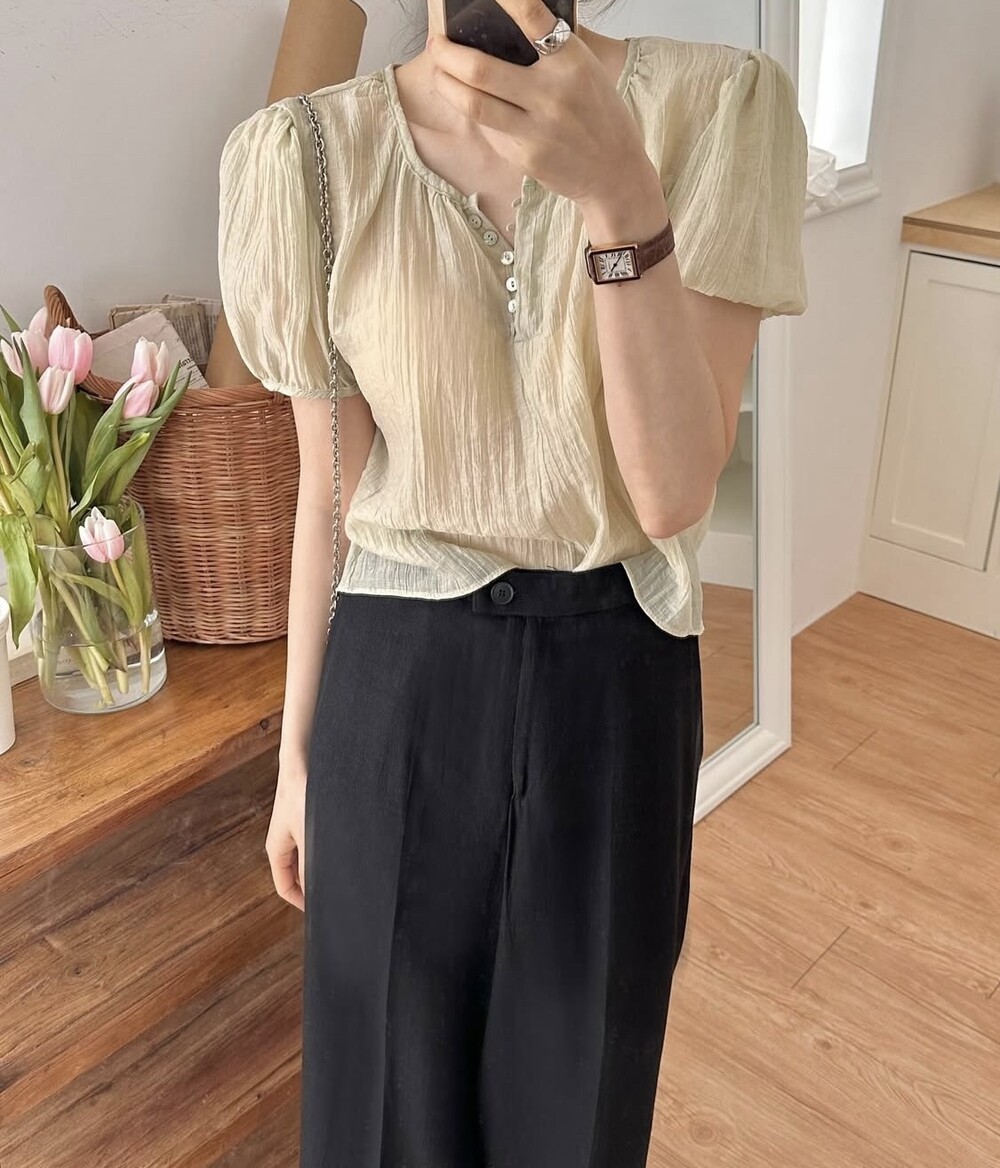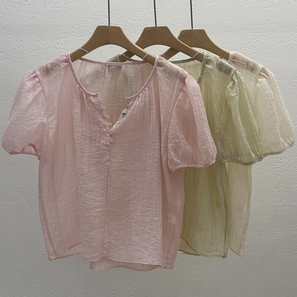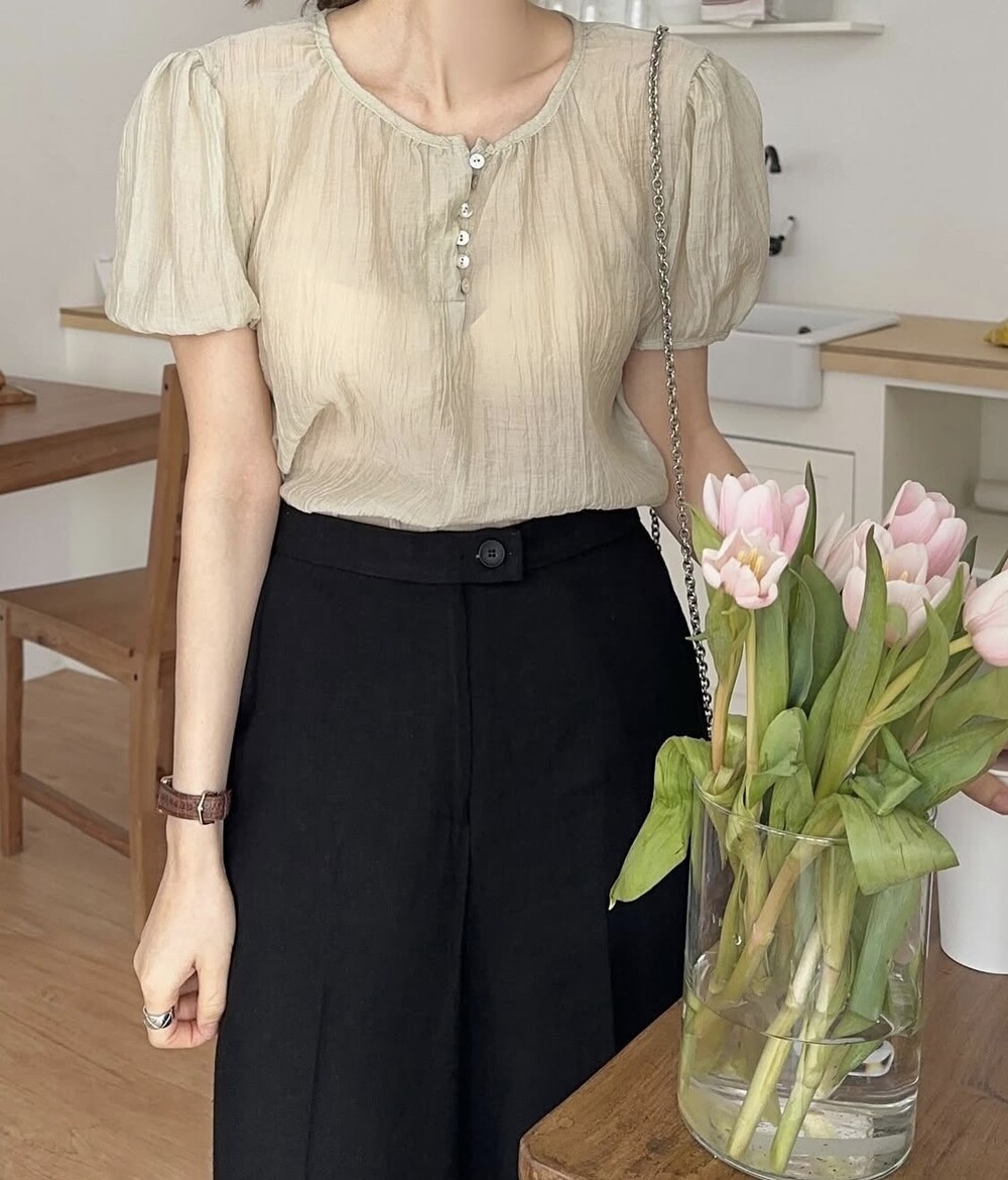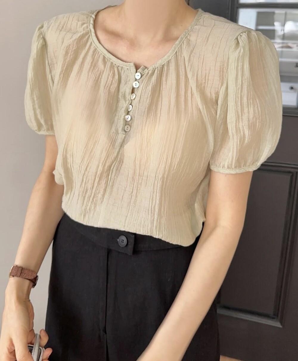 셔링 주름 단추 시스루 반팔 퍼프 블라우스