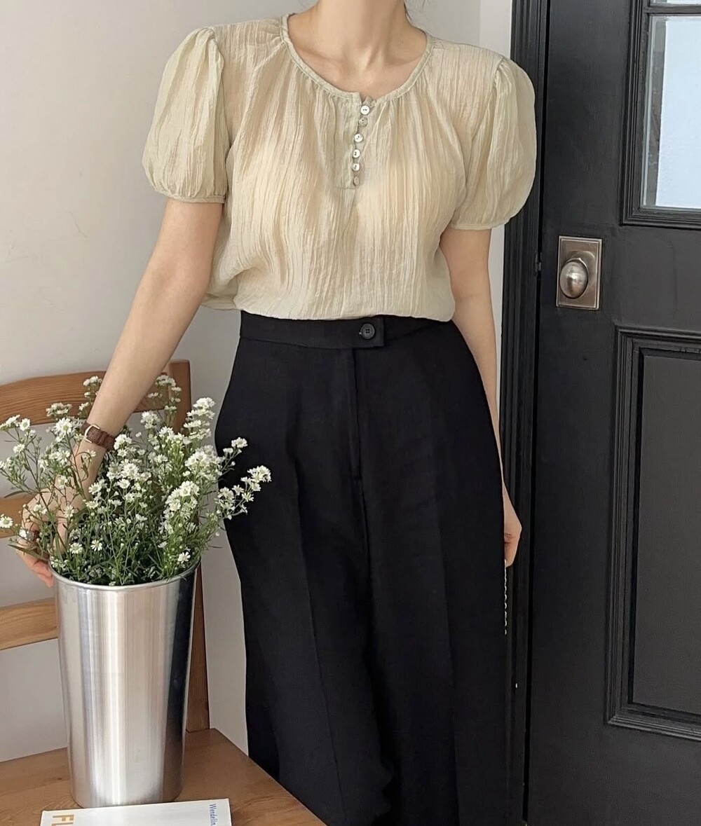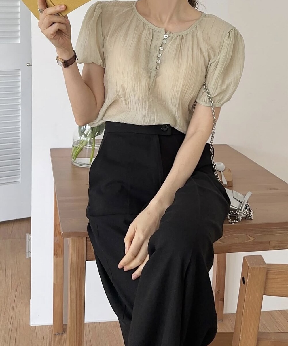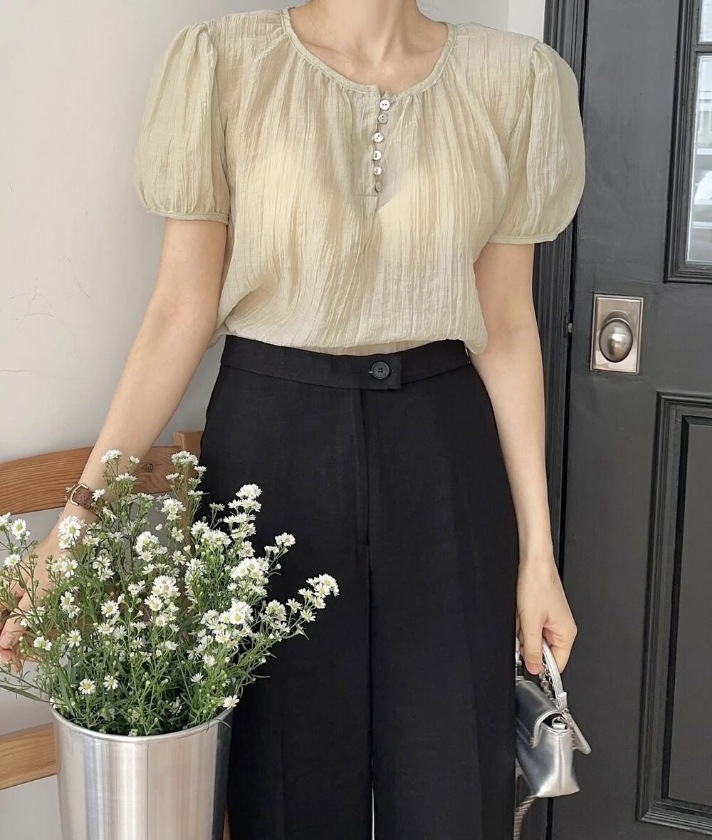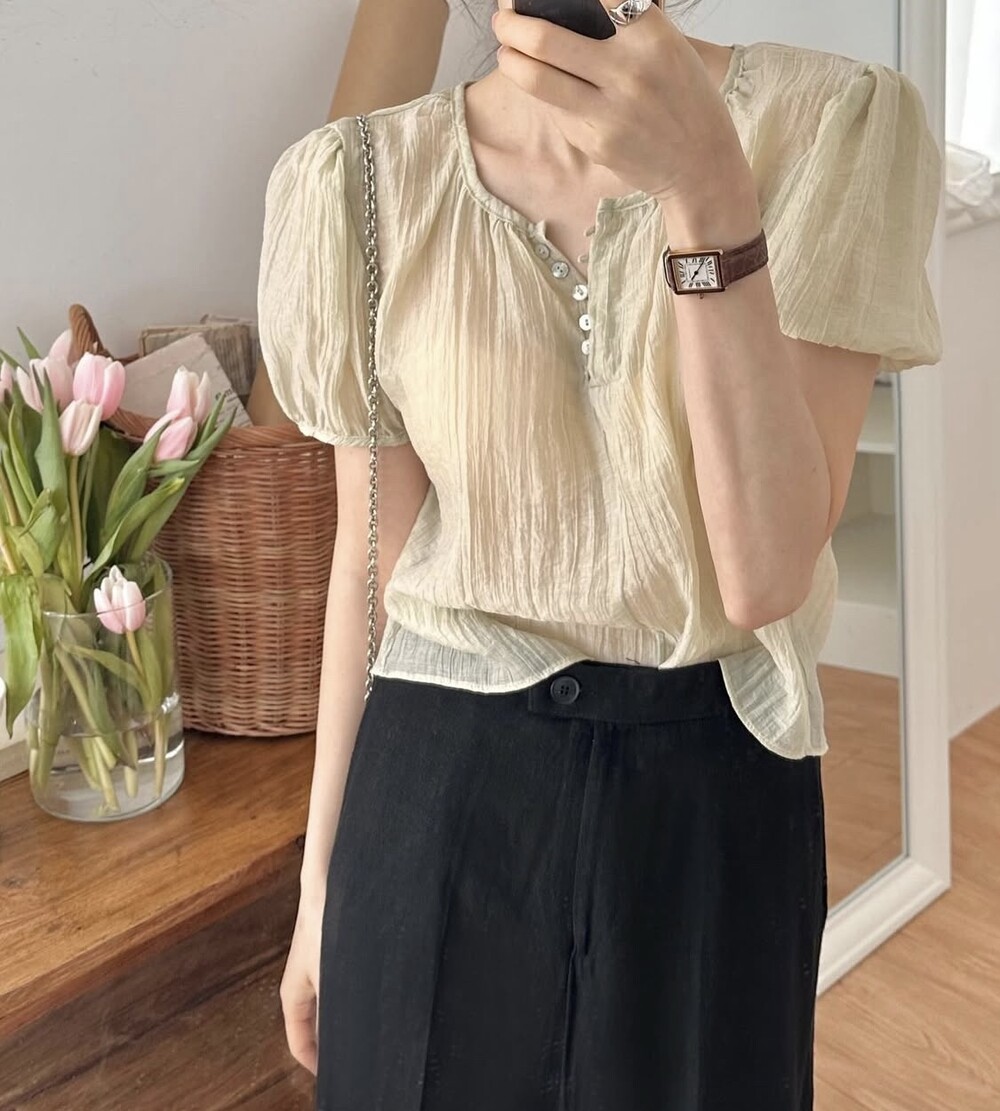 셔링 주름 단추 시스루 반팔 퍼프 블라우스