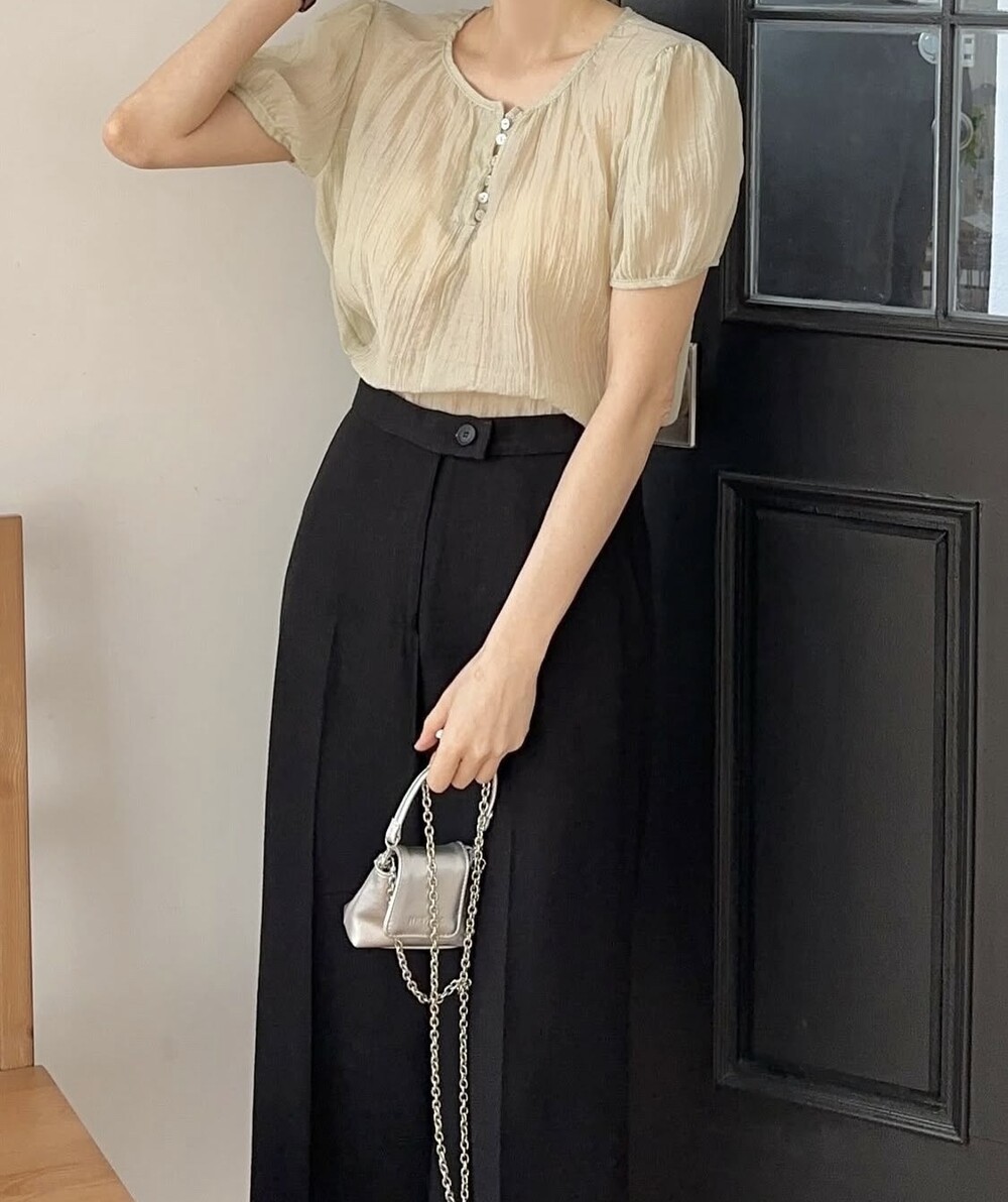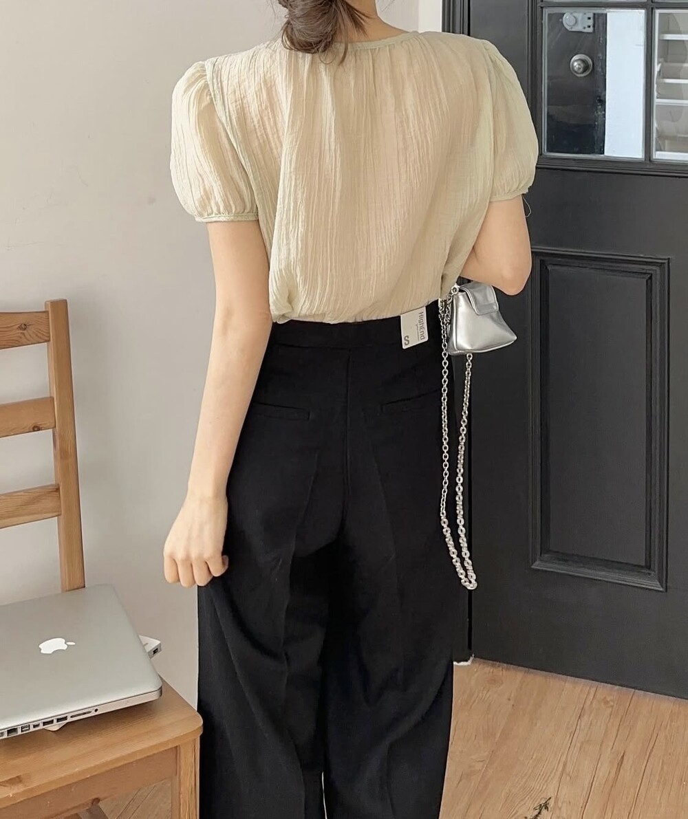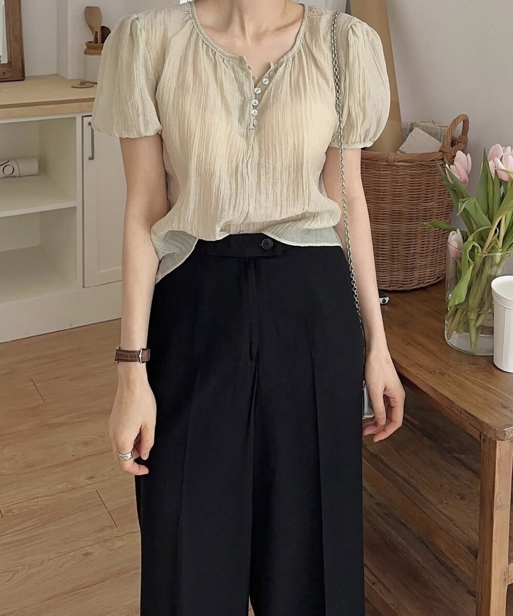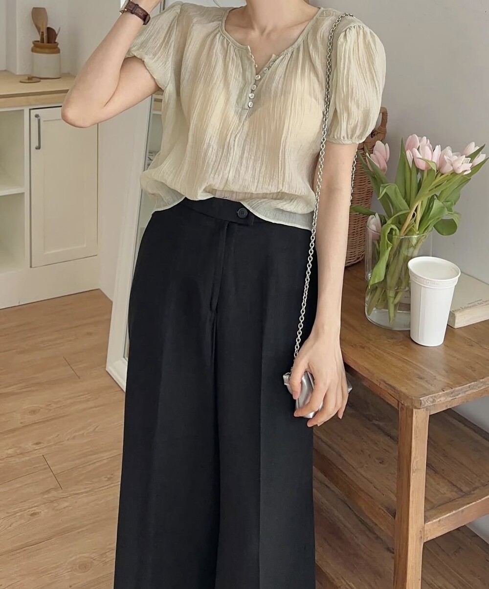 셔링 주름 단추 시스루 반팔 퍼프 블라우스