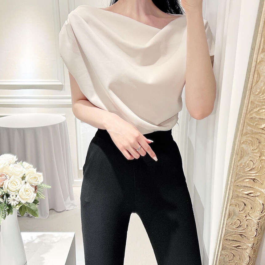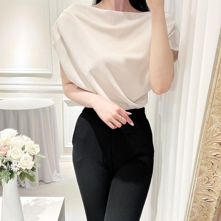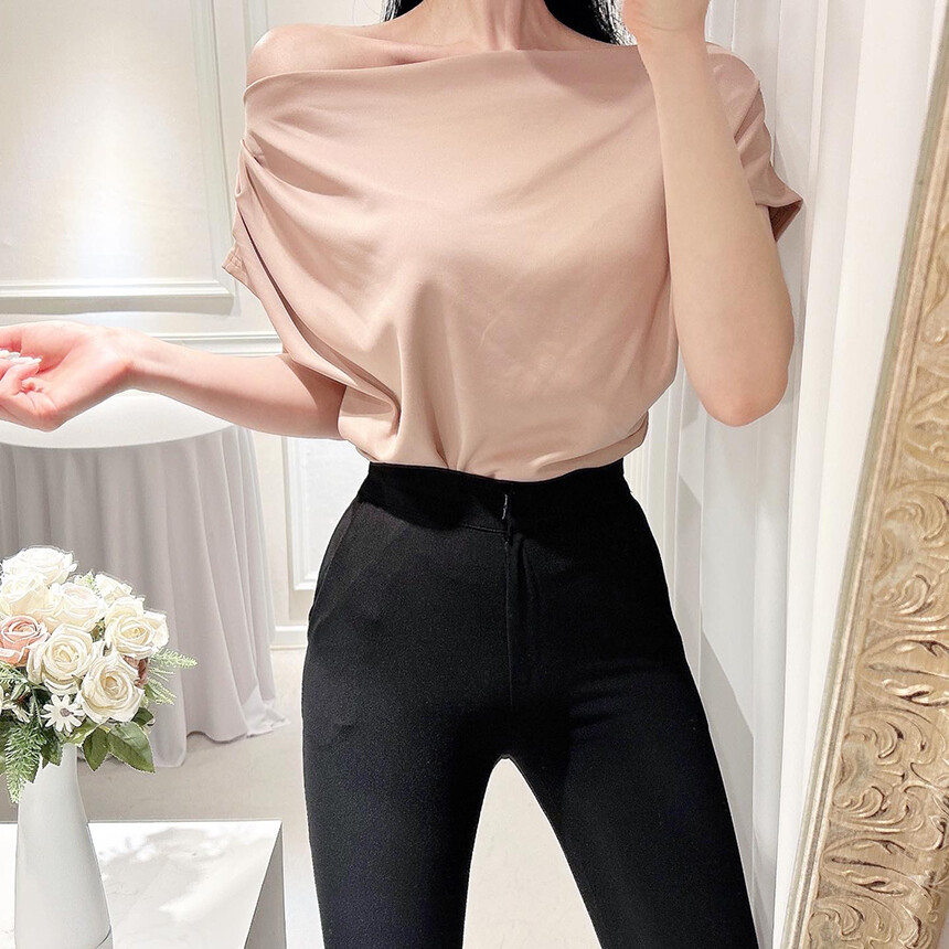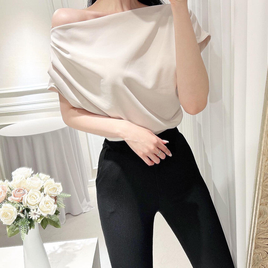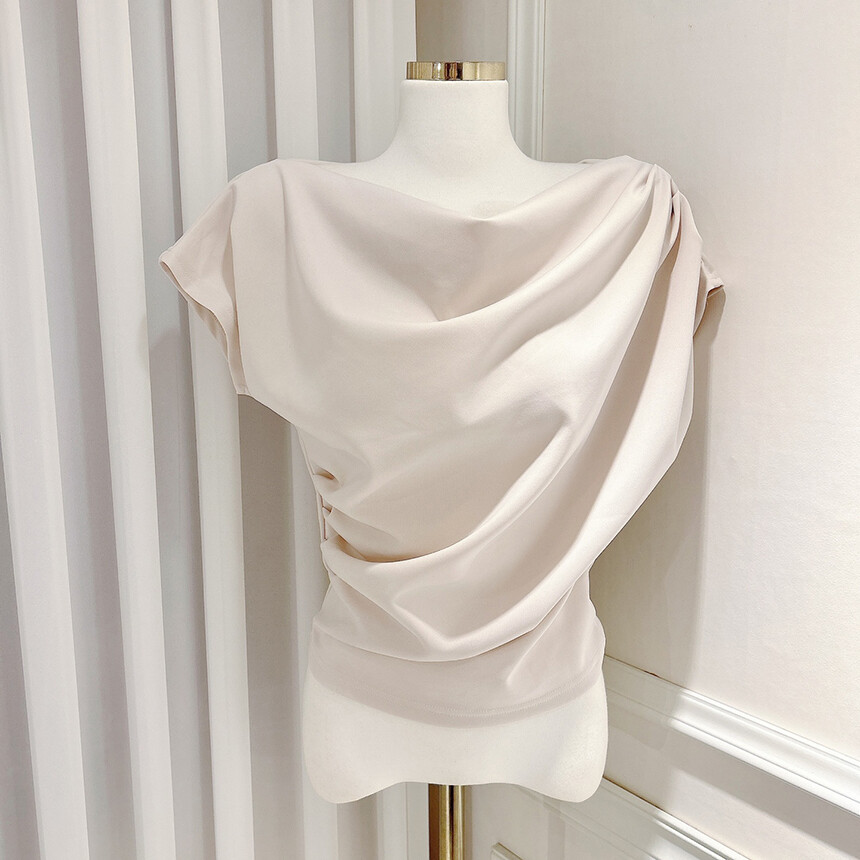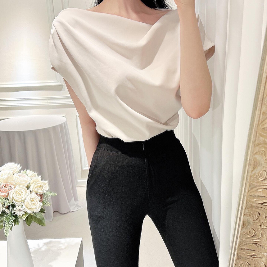 입술넥 오프숄더 브이넥 셔링 드레이프 주름 실키 새틴 블라우스