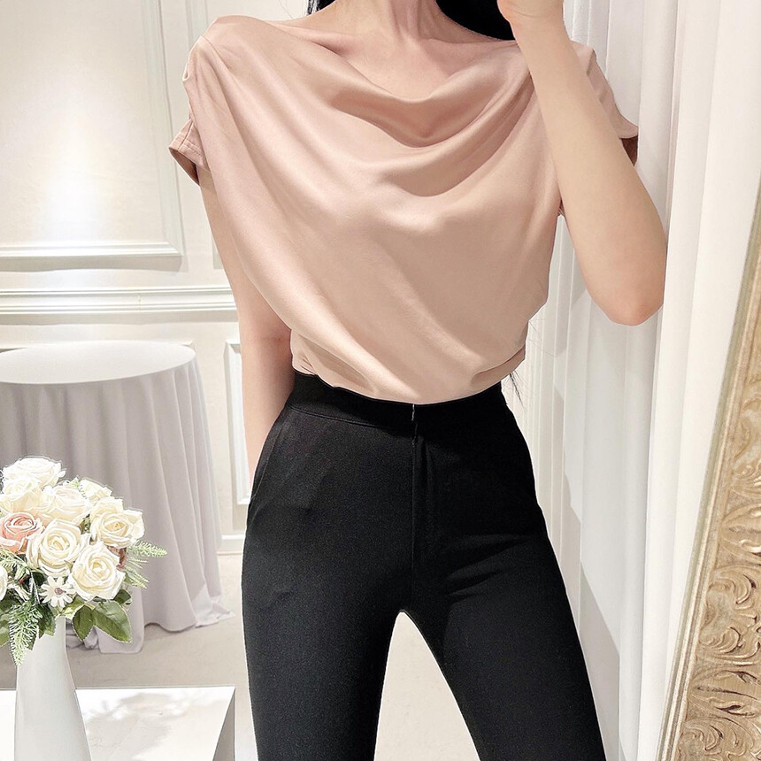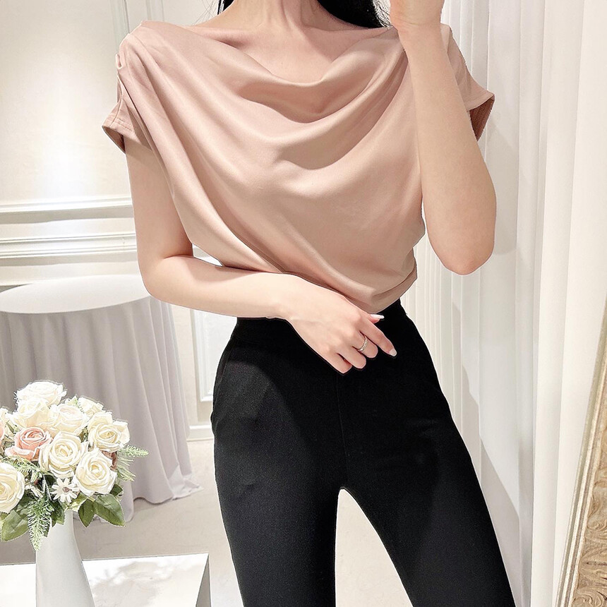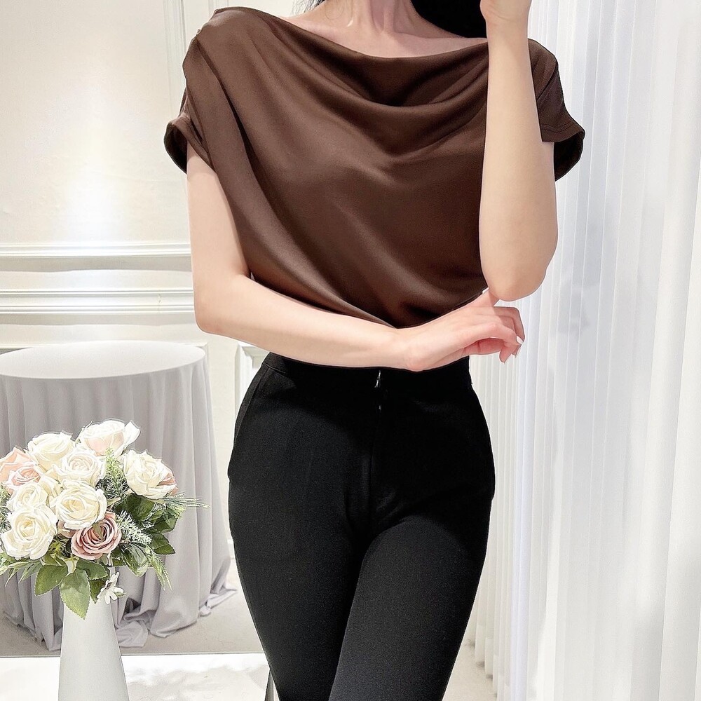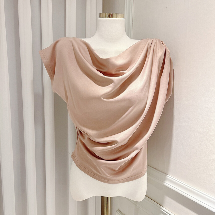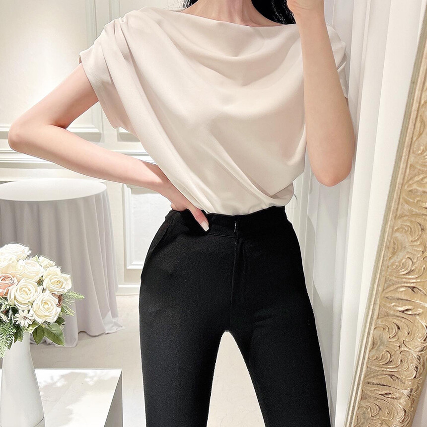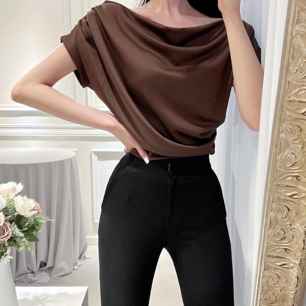 입술넥 오프숄더 브이넥 셔링 드레이프 주름 실키 새틴 블라우스