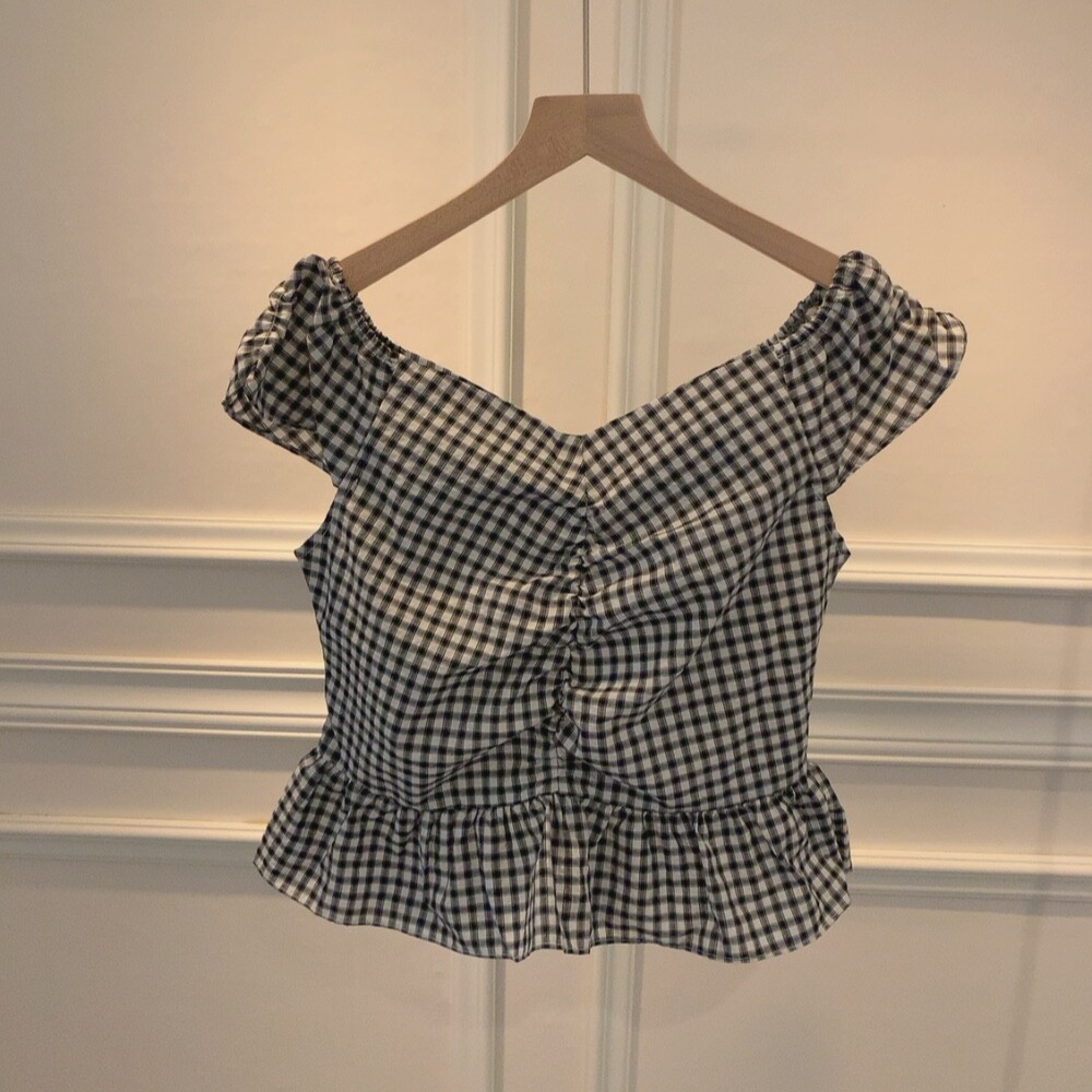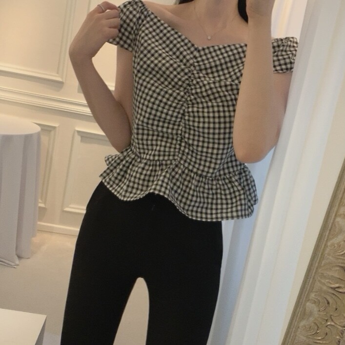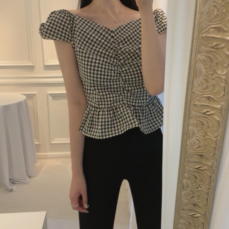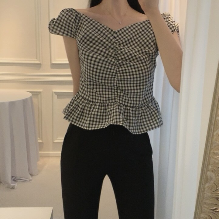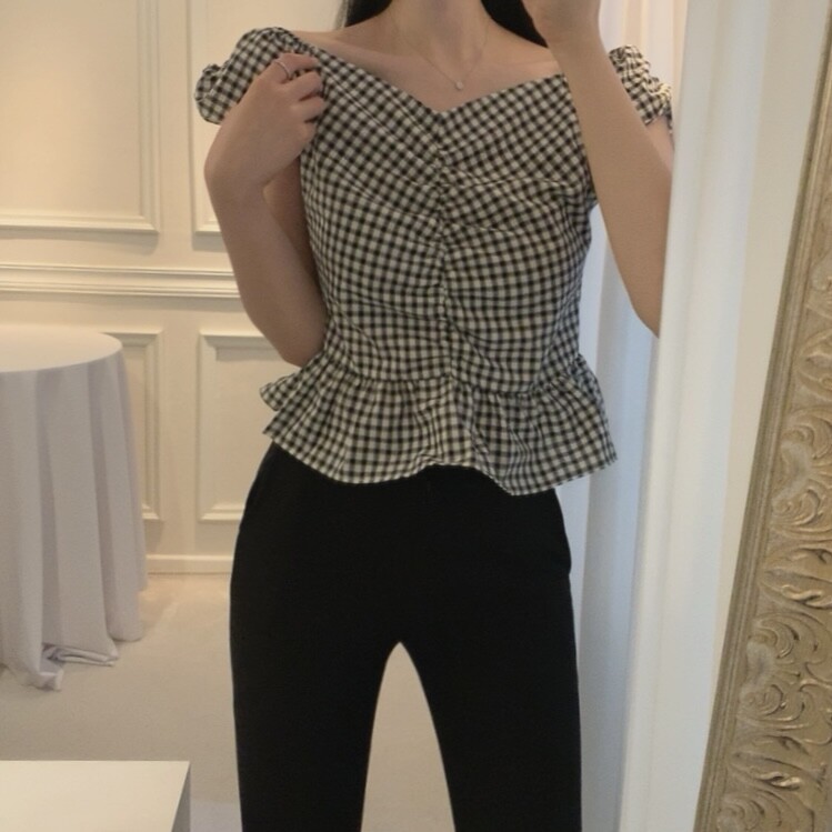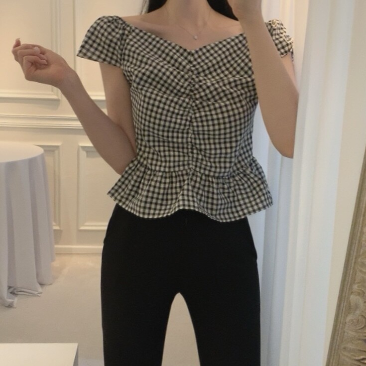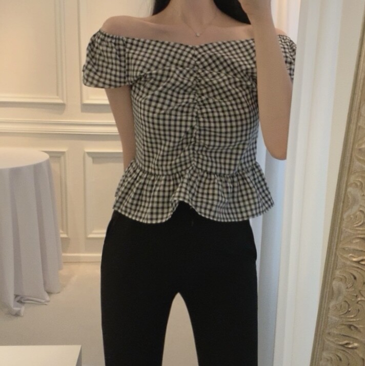 체크 프릴 날개 캡소매 오프숄더 셔링 숏 플레어 블라우스